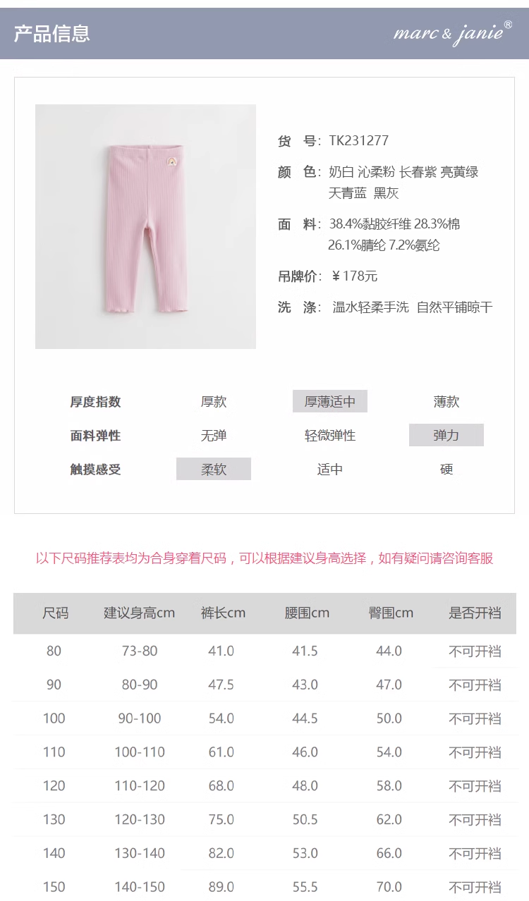 【德绒发热】马克珍妮秋冬新款女童薄款弹力打底裤儿童裤子231277