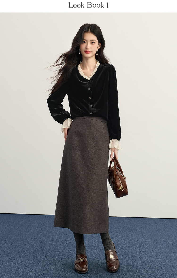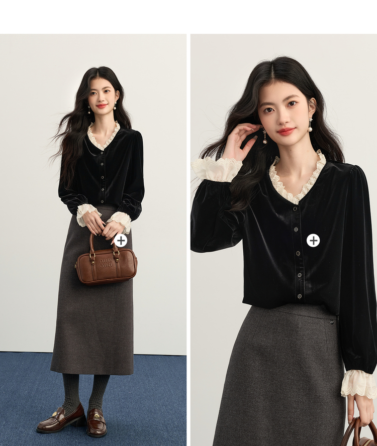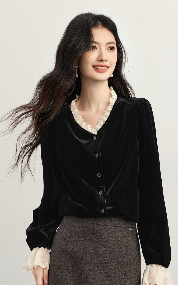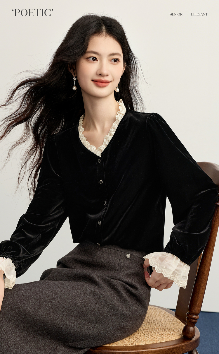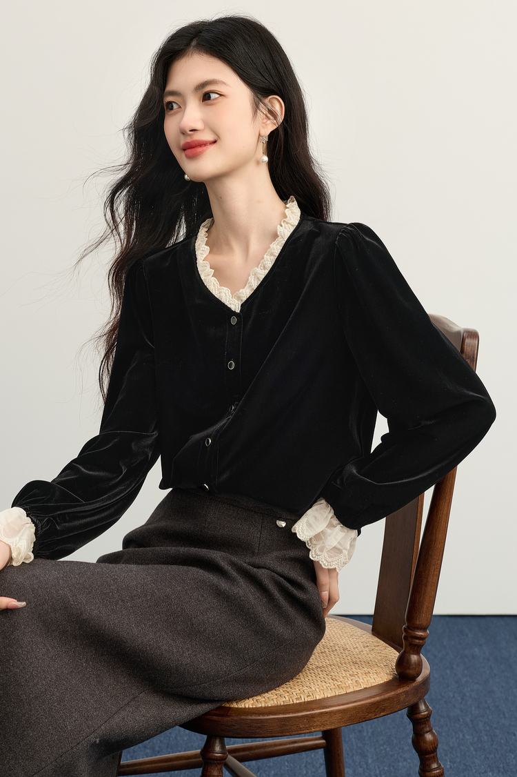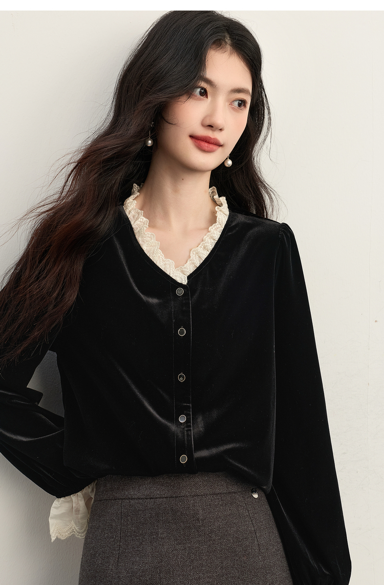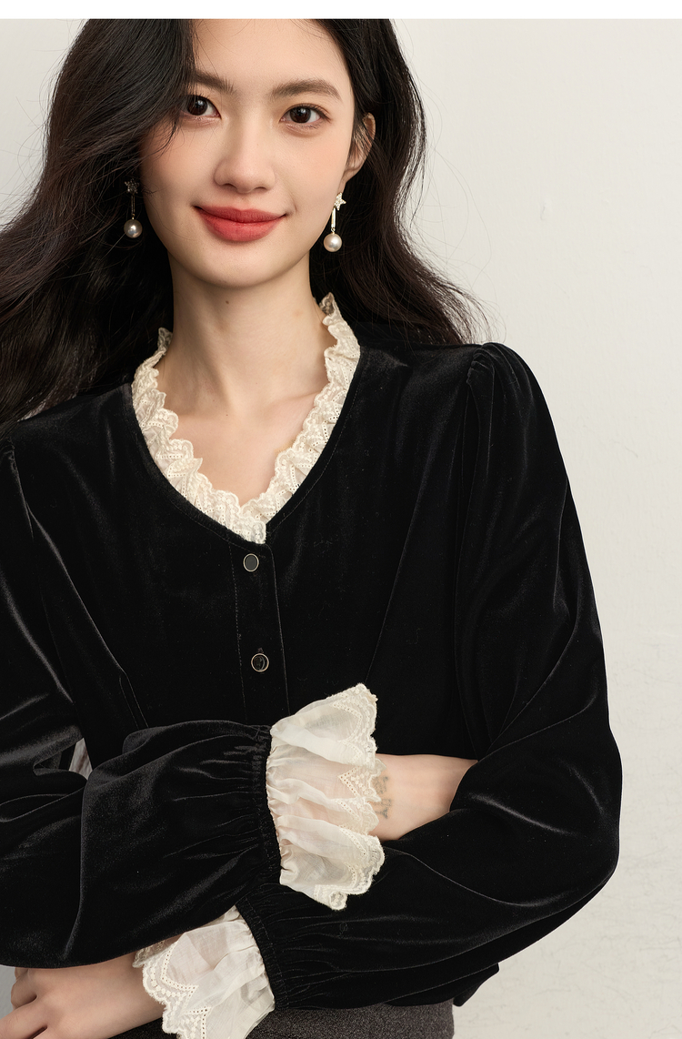 【11/14新品】熙世界法式赫本黑色蕾丝木耳边V领金丝绒衬衫上衣女2025秋冬新款