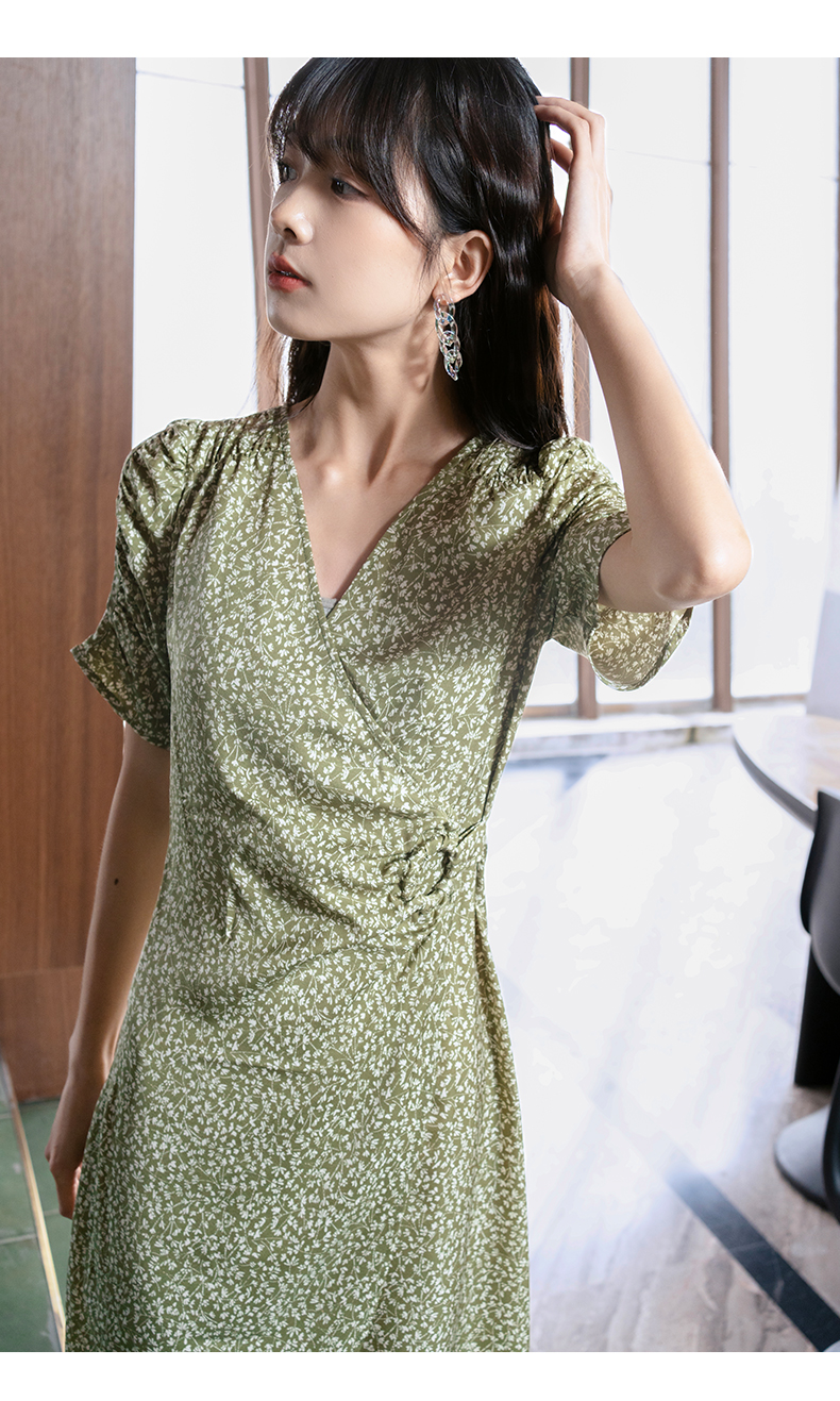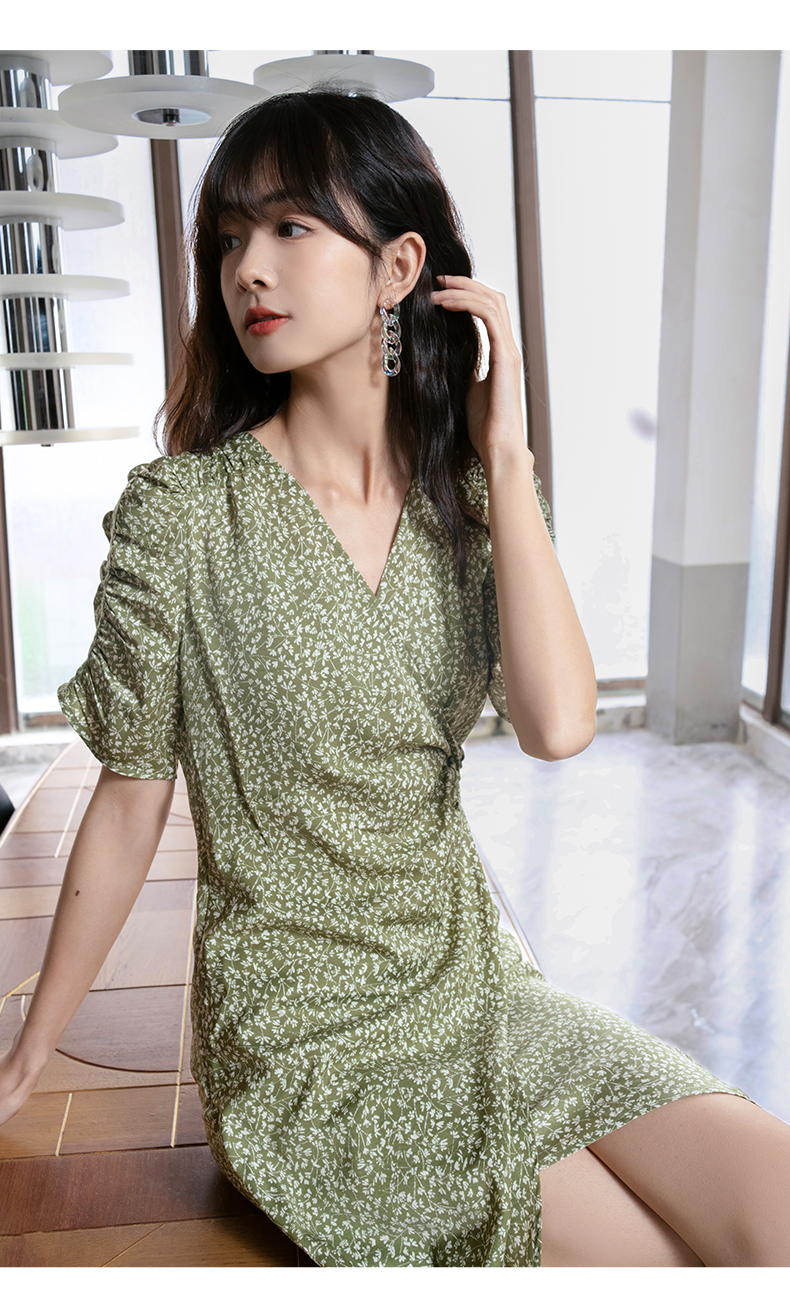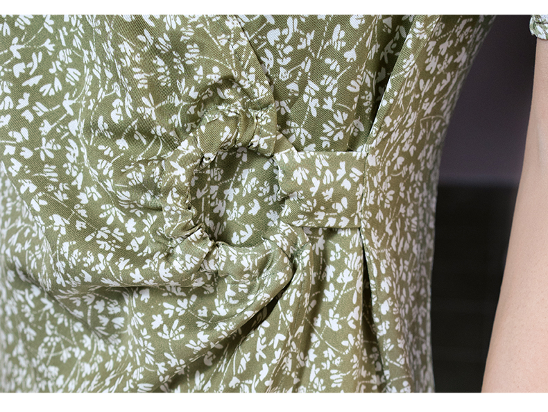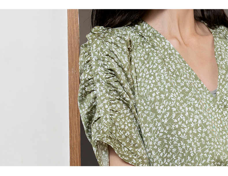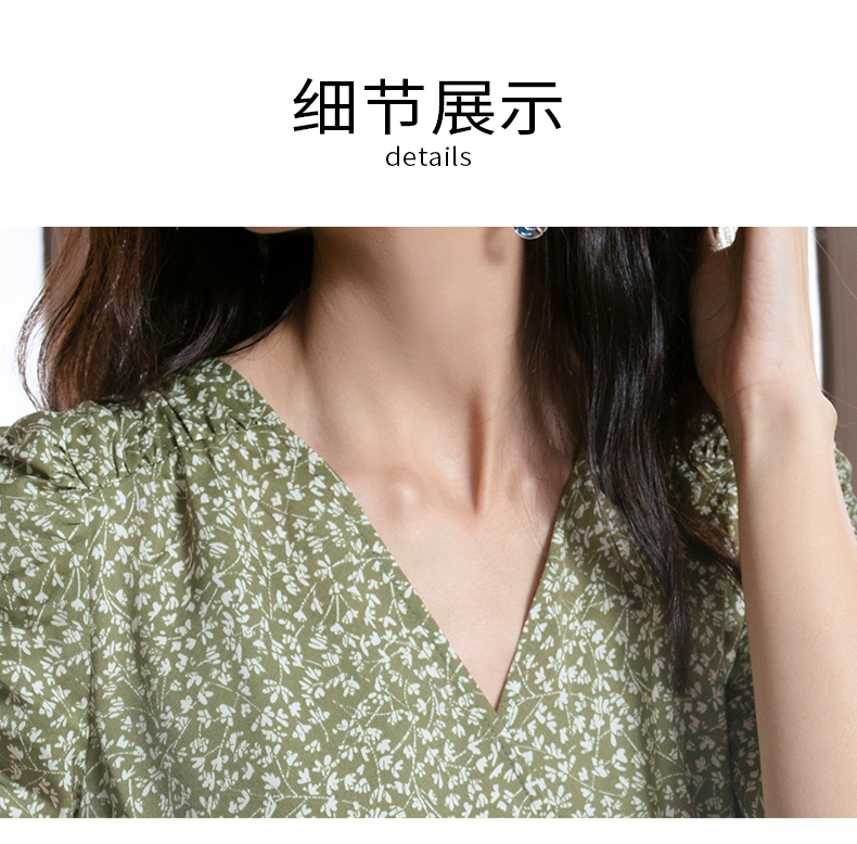 oldcolour碎花连衣裙夏新款V领气质抽褶法式中长裙P25101520