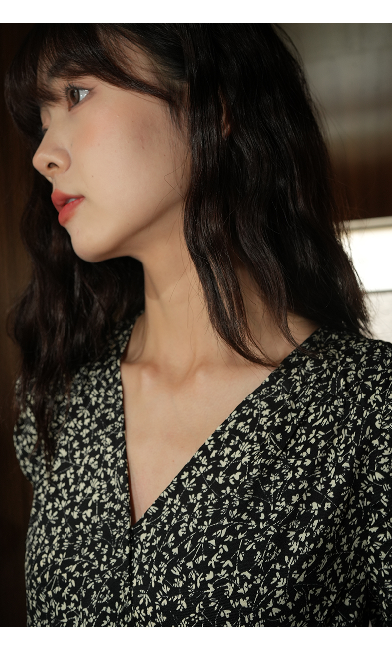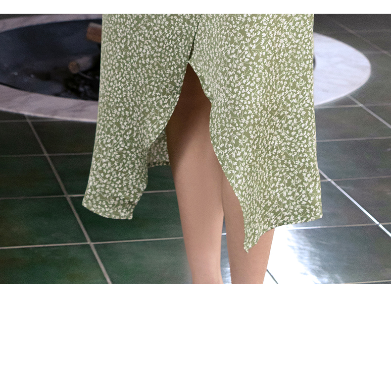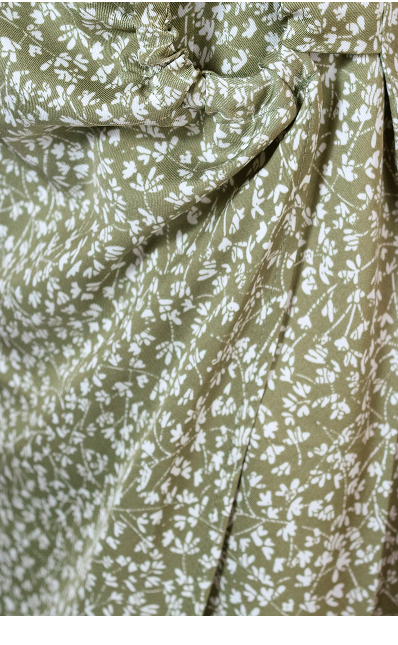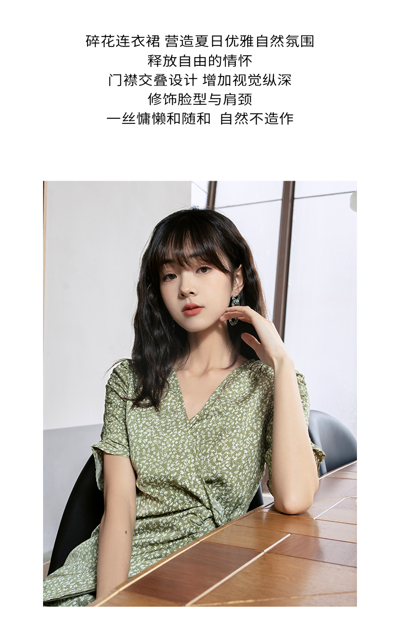 oldcolour碎花连衣裙夏新款V领气质抽褶法式中长裙P25101520