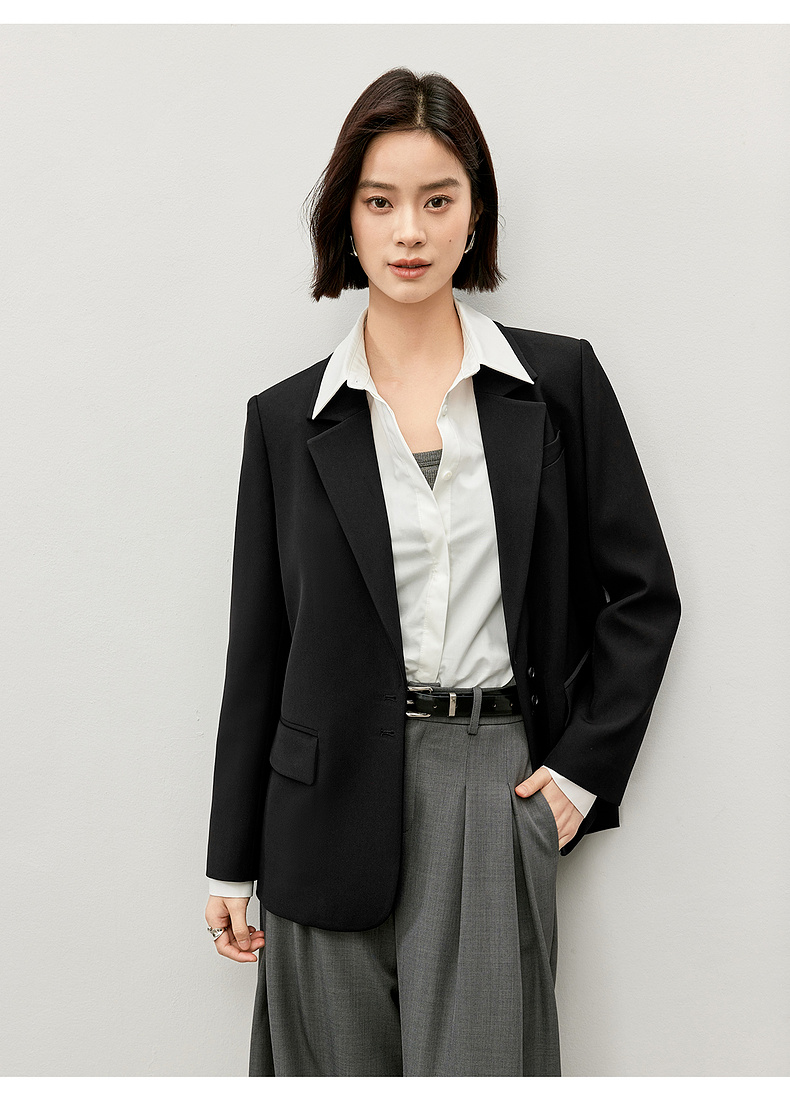 【内购】气质通勤平驳领带肩垫单排扣装饰盖袋宽松西装外套-143X56552