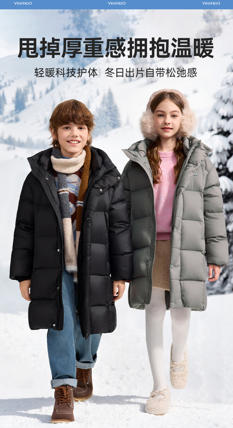 【英氏】【黑金2.0鹅绒】【110-175】男女童加厚保暖中长款鹅绒服羽绒服