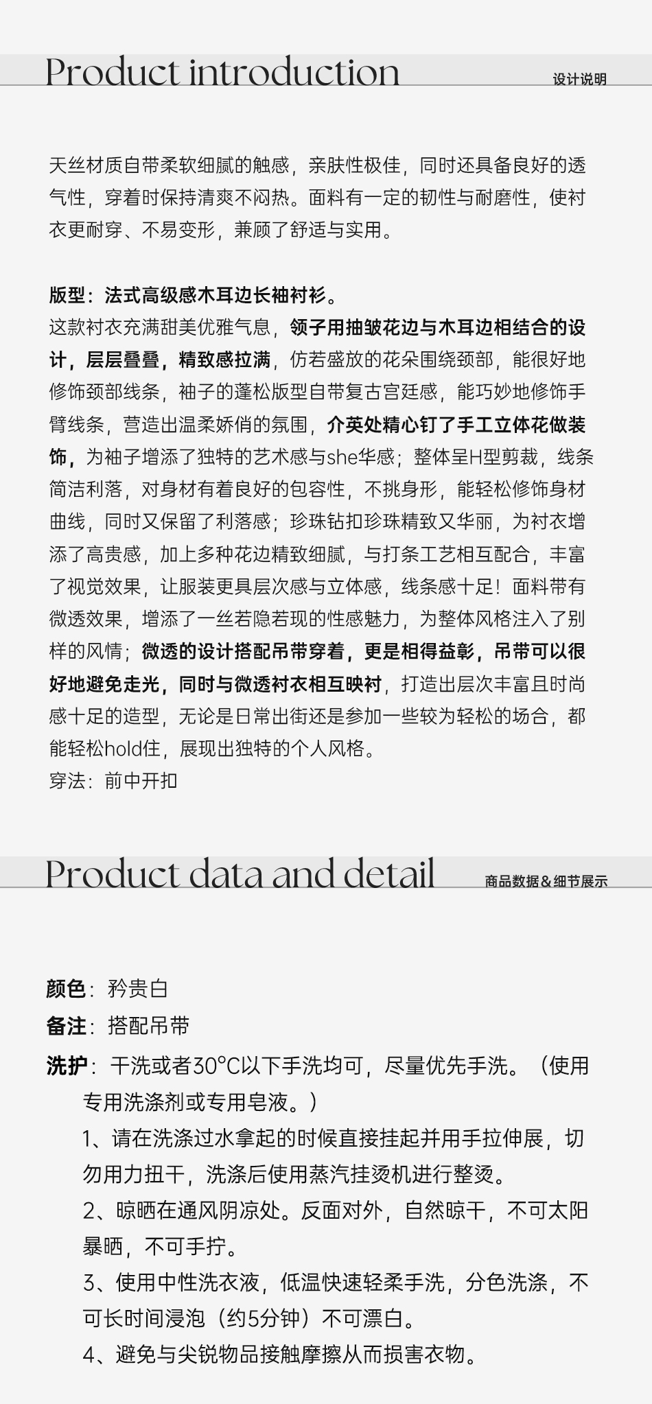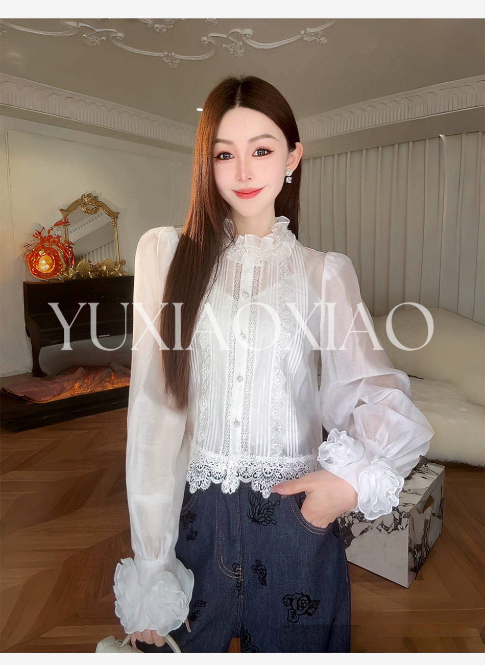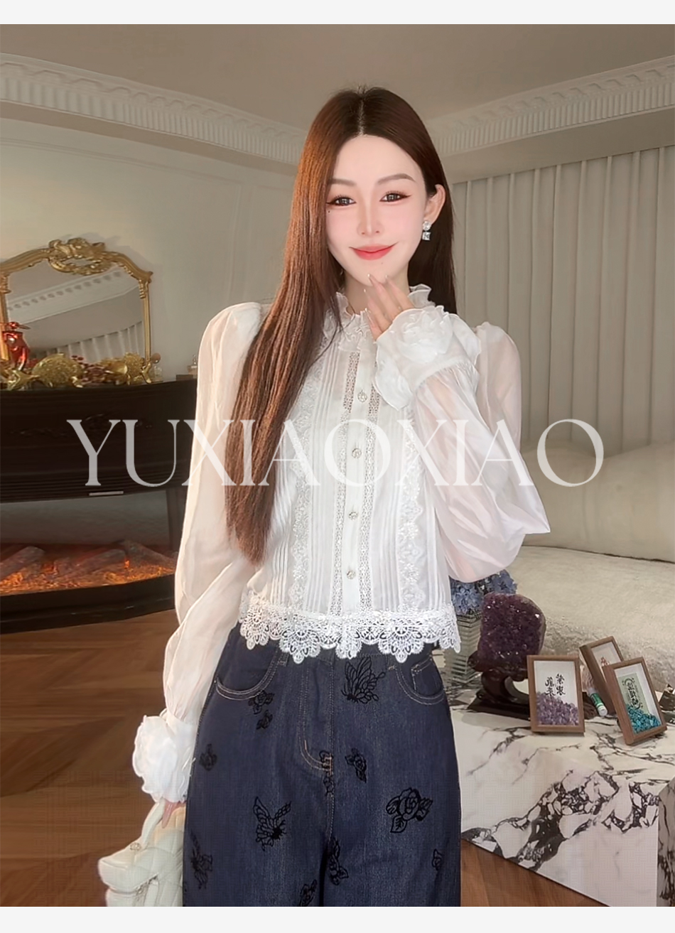 余潇潇【花漾浅梦】法式复古宫廷感莱赛尔珍珠钻扣木耳边长袖衬衫