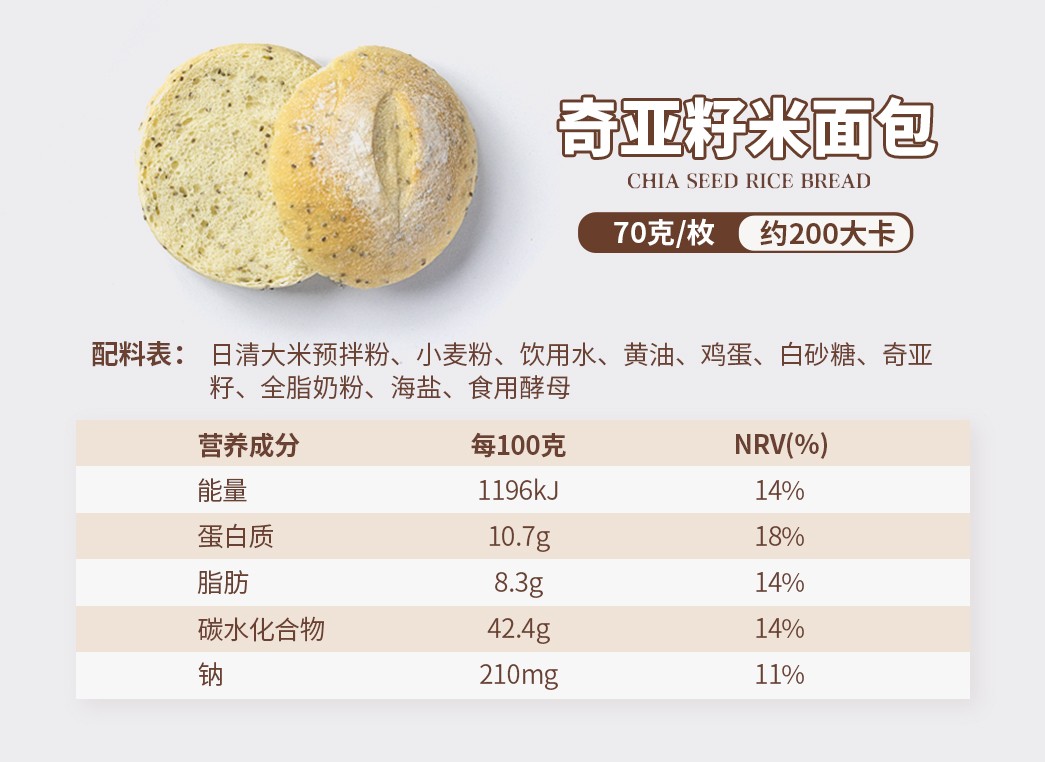 【配料表】日清大米预拌粉、小麦粉、饮用水、黄油、鸡蛋、白砂糖、奇亚籽、全脂奶粉、海盐、食用酵母