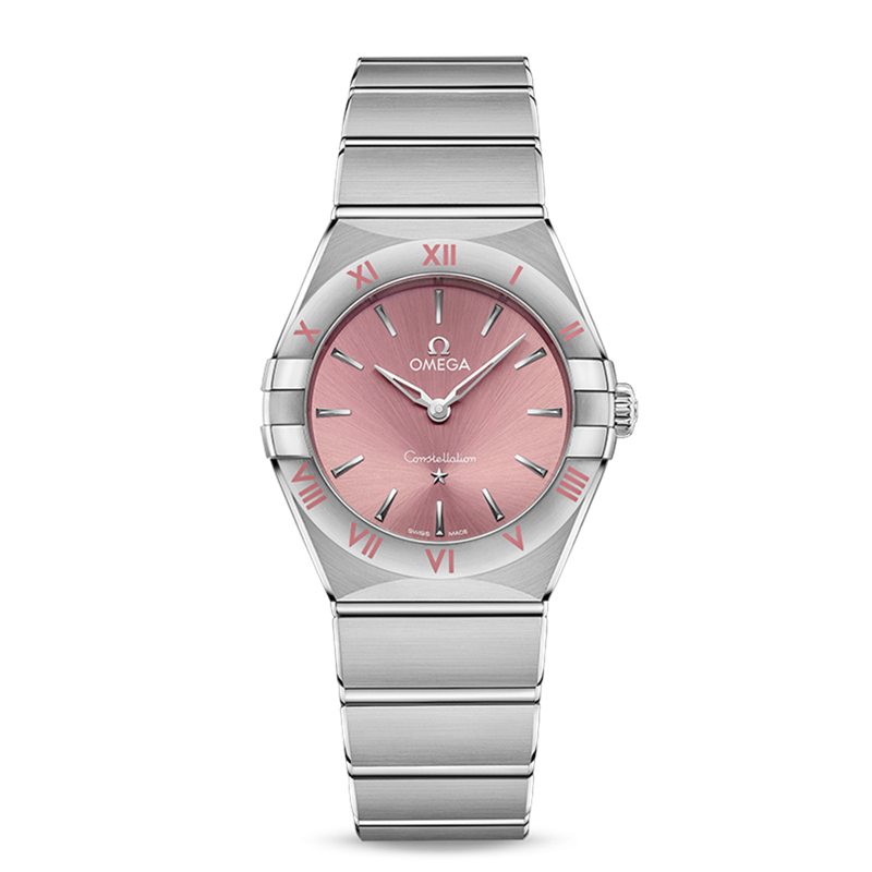 镜面材质 | 蓝宝石水晶玻璃 | 表盘 | 精钢腕表 玫瑰粉色表盘上饰有白色18K金小时刻度和品牌标识,表圈上镌刻的罗马数字时标采用相同的粉色调 表背上印有星座系列天文台徽章。 |