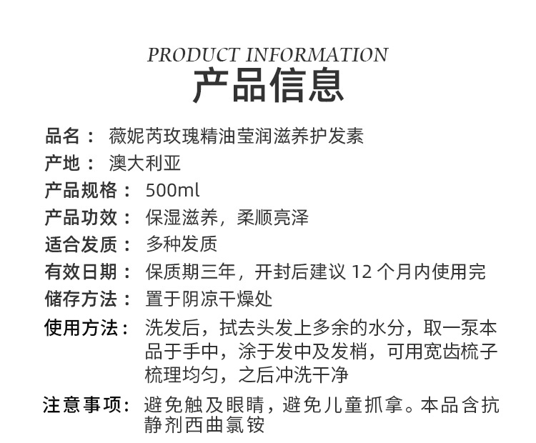 澳洲原装进口 薇妮芮 玫瑰精油护发素女柔顺顺滑改善毛躁损伤滋润补水