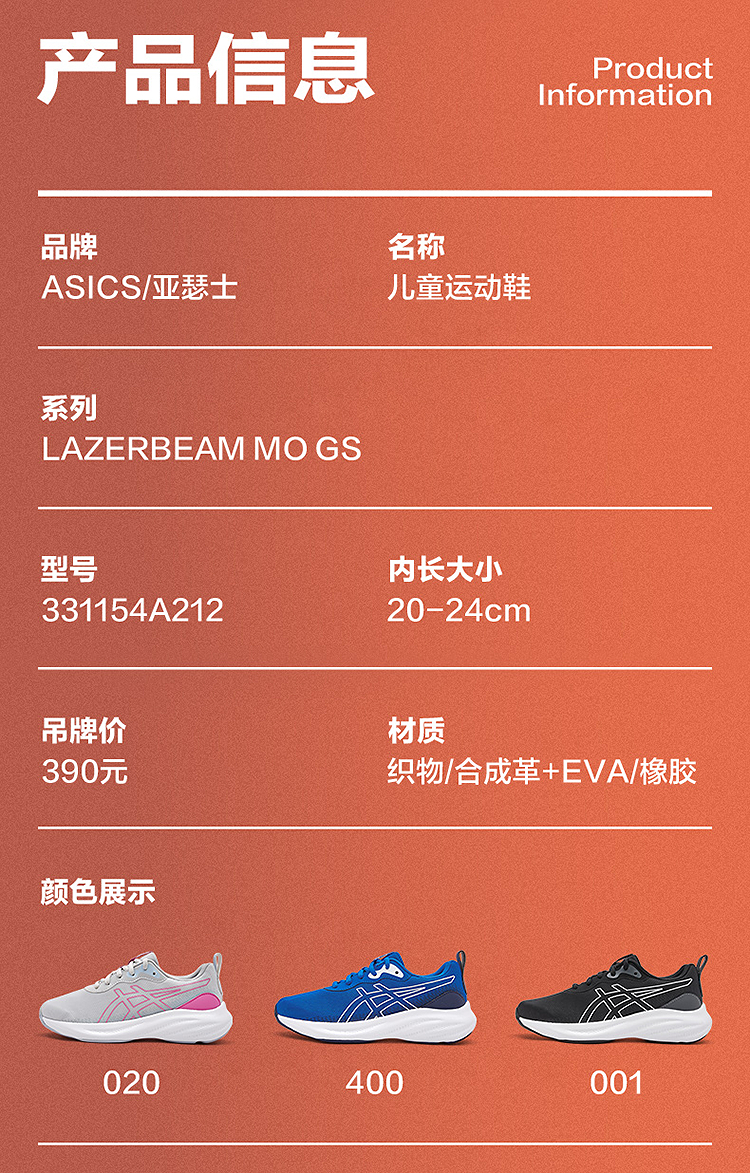ASICS/亚瑟士童鞋25年运动鞋体测训练跑步鞋透气稳定LAZERBEAM M