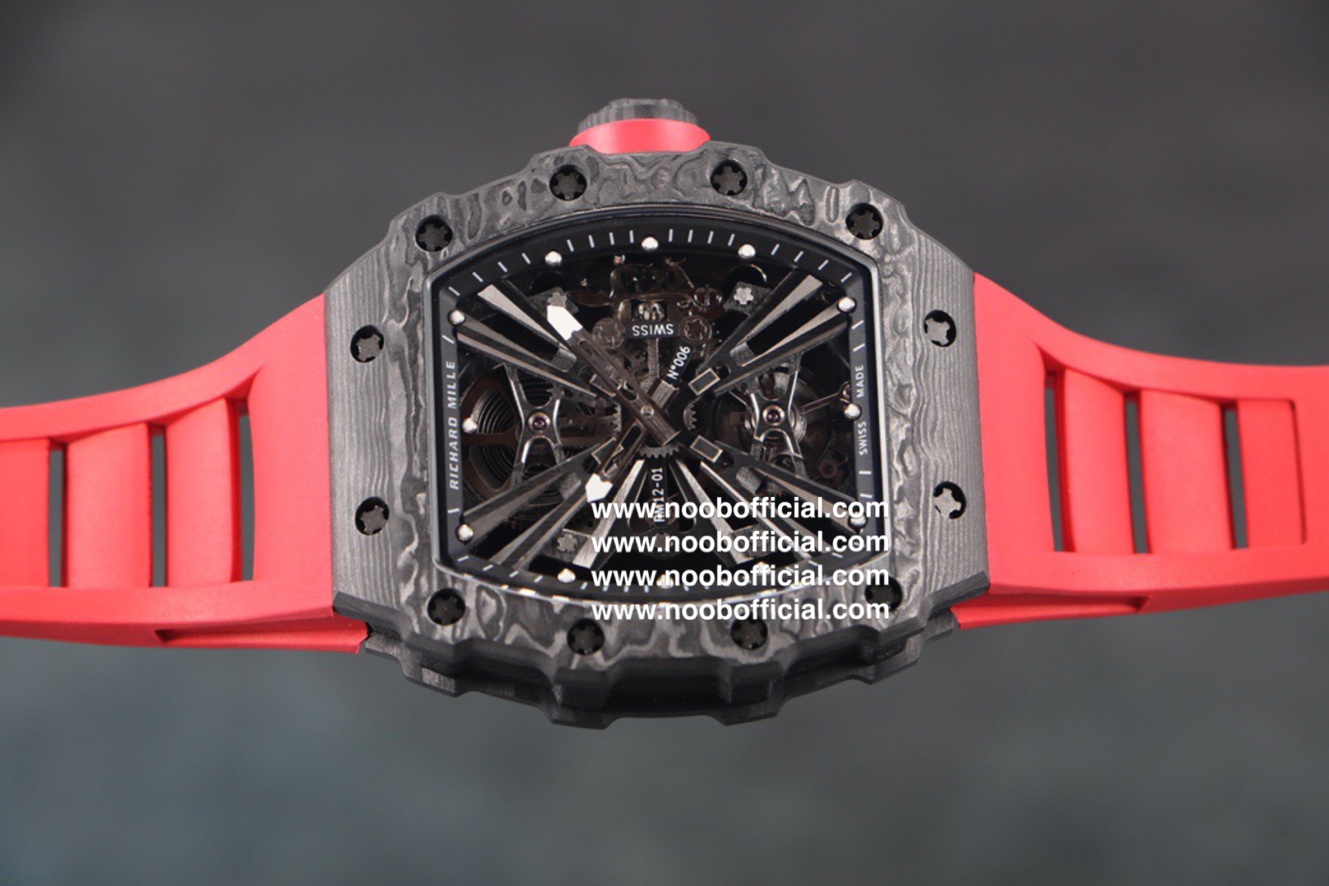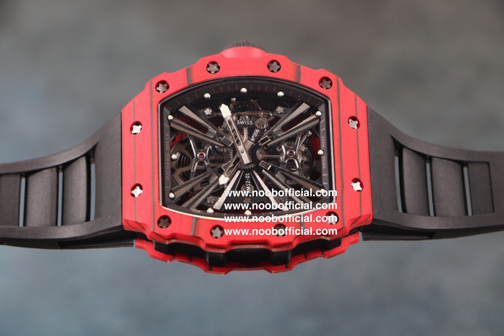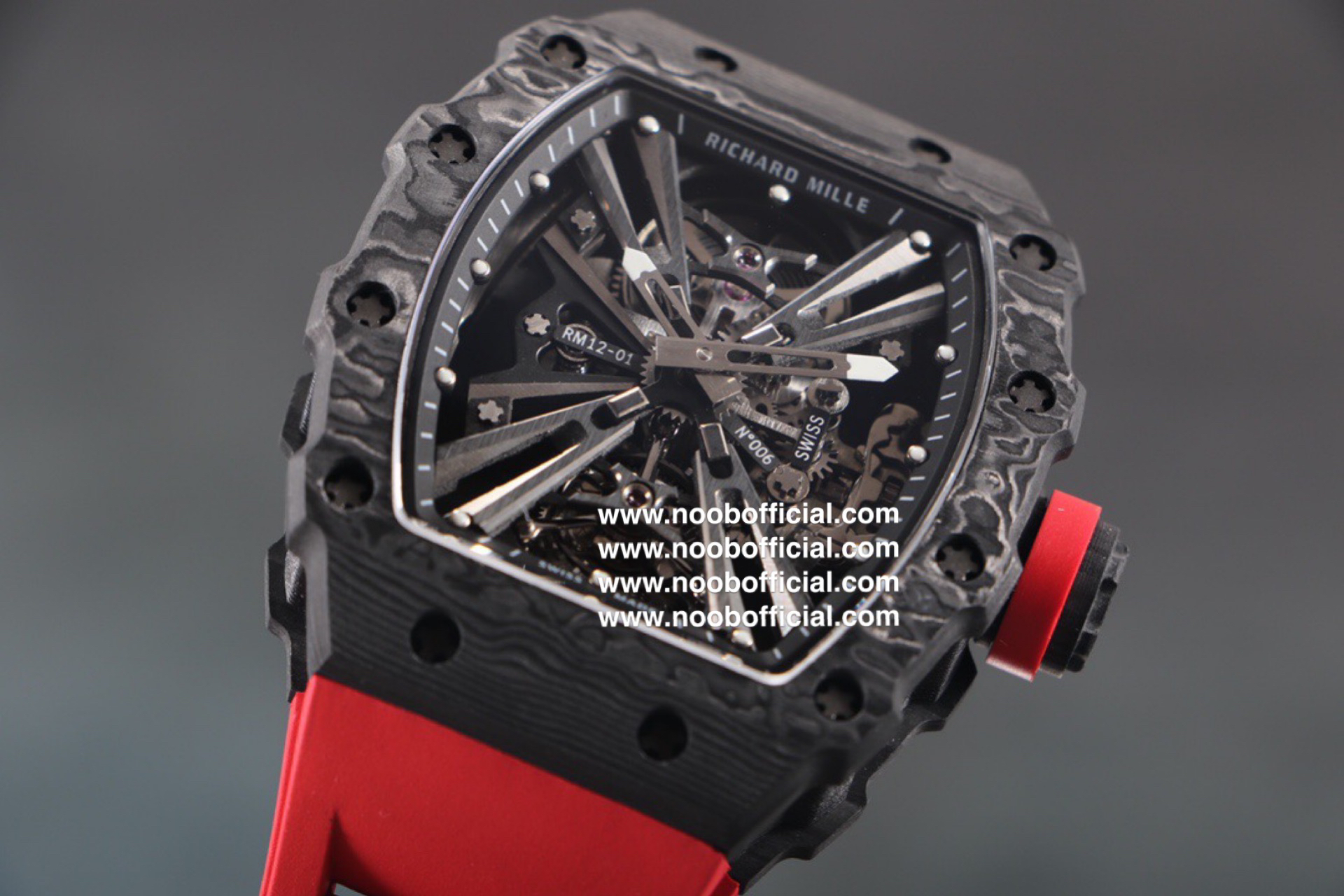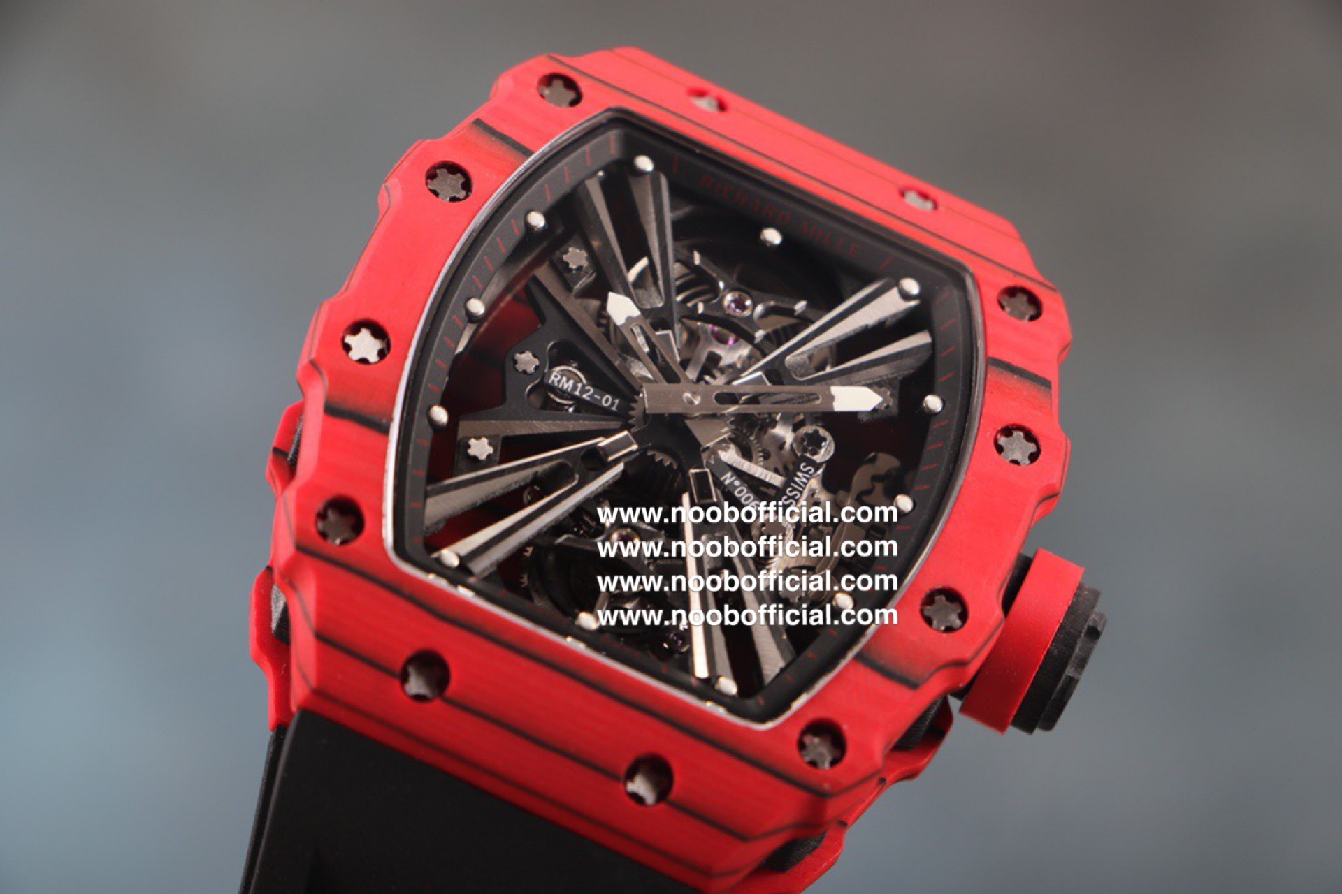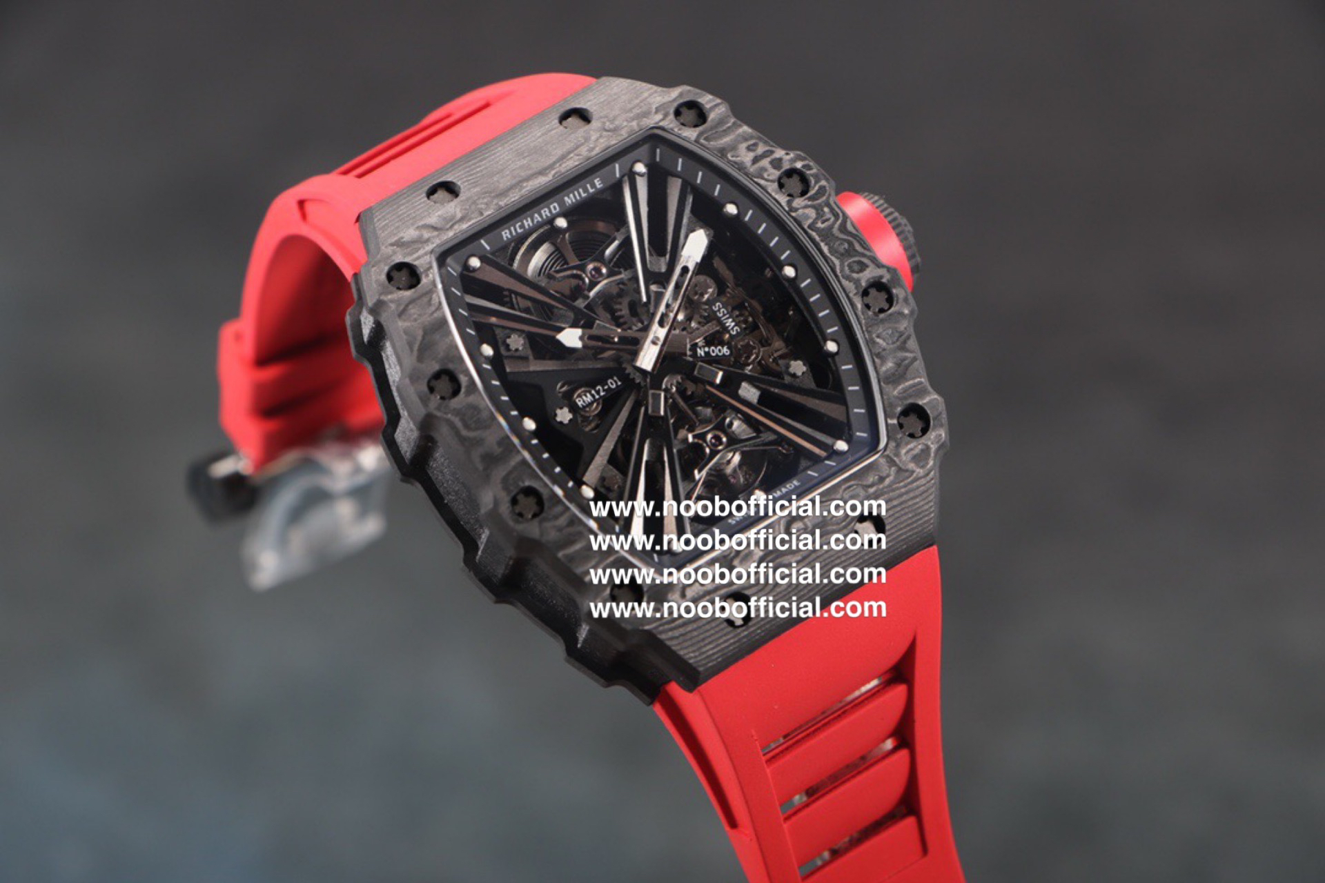 【RICHARD MILLE】理查德 RM12-01NTPT真陀飞轮 非凡运动镂空流线型手表,机芯手动上链机芯,机芯桥板融入赛车底盘的灵感元素,镂空基板以4枚钛合金桥板固定,直接呈现机芯的运动,两支指针搭配与表壳相近的颜色,陀飞轮位于6点。表壳有多种不同的配色版本,有纯黑碳纤维、红色石英纤维、白色石英纤维。表带可挑选搭配橡胶表带与凡布面料表带。