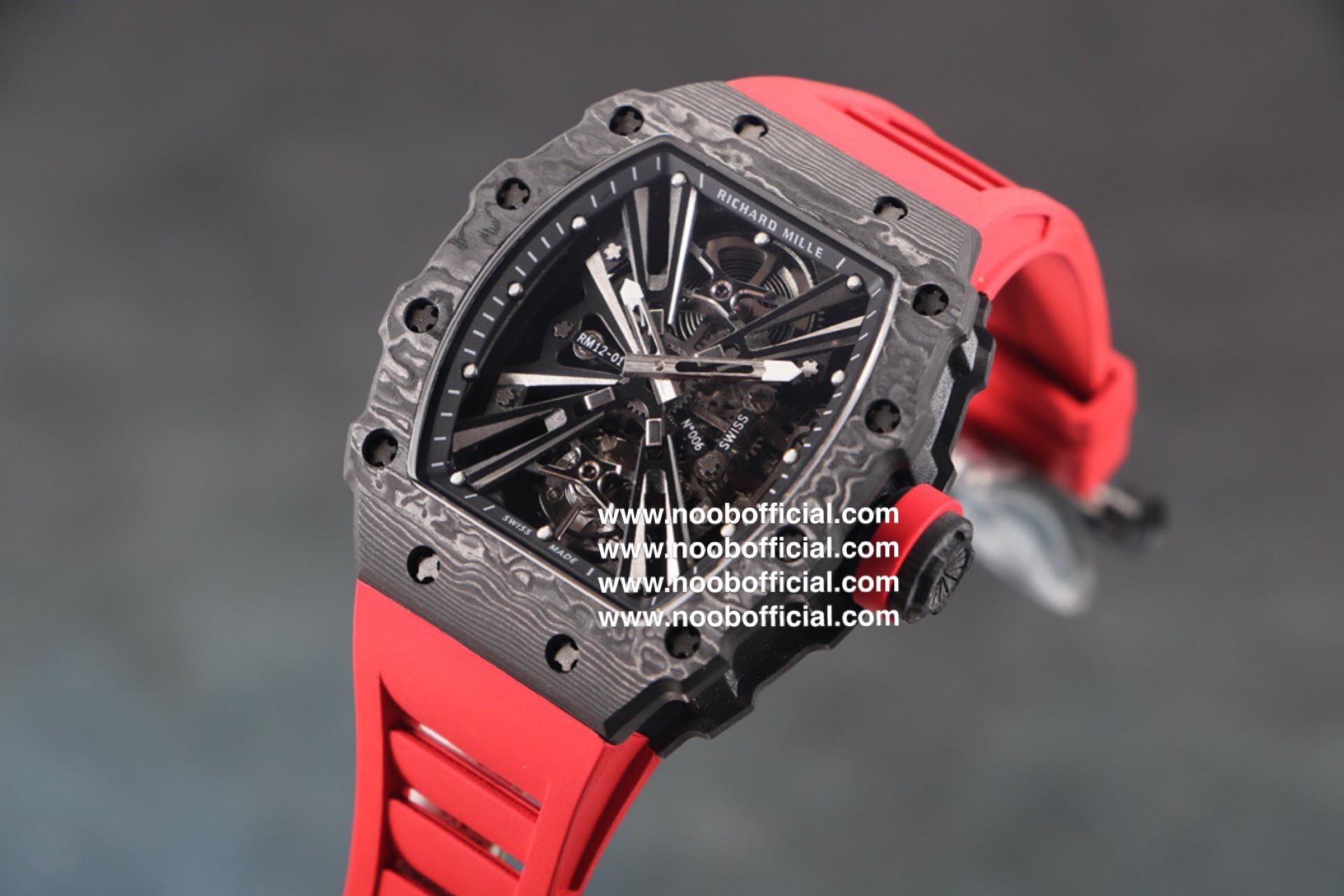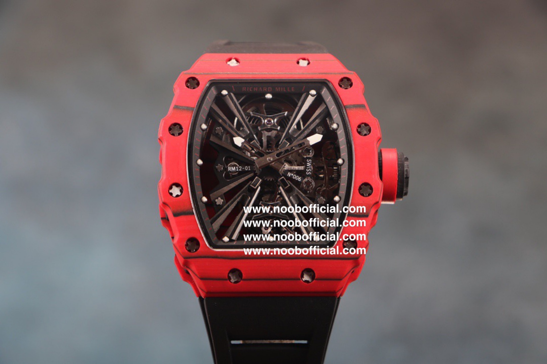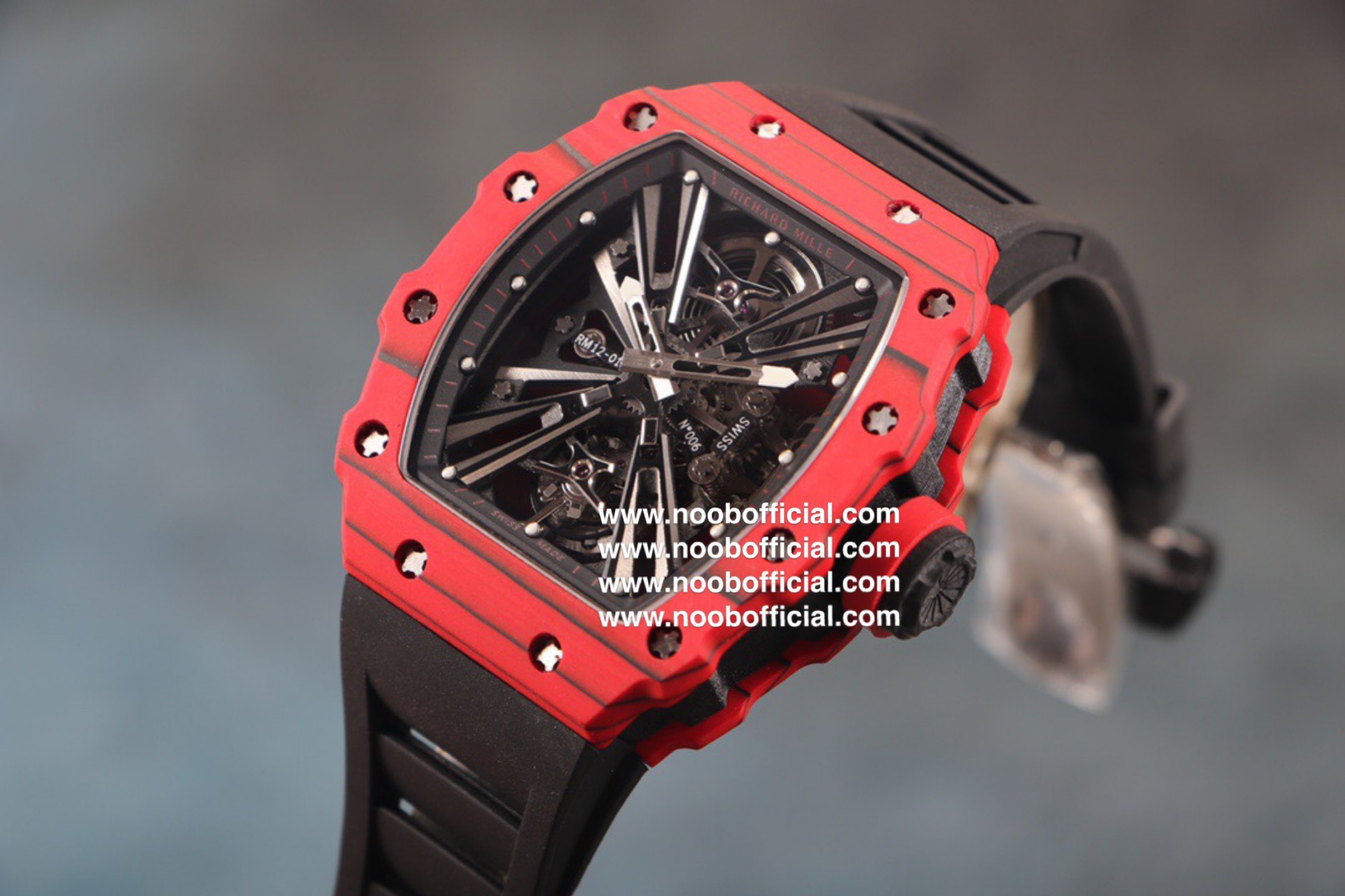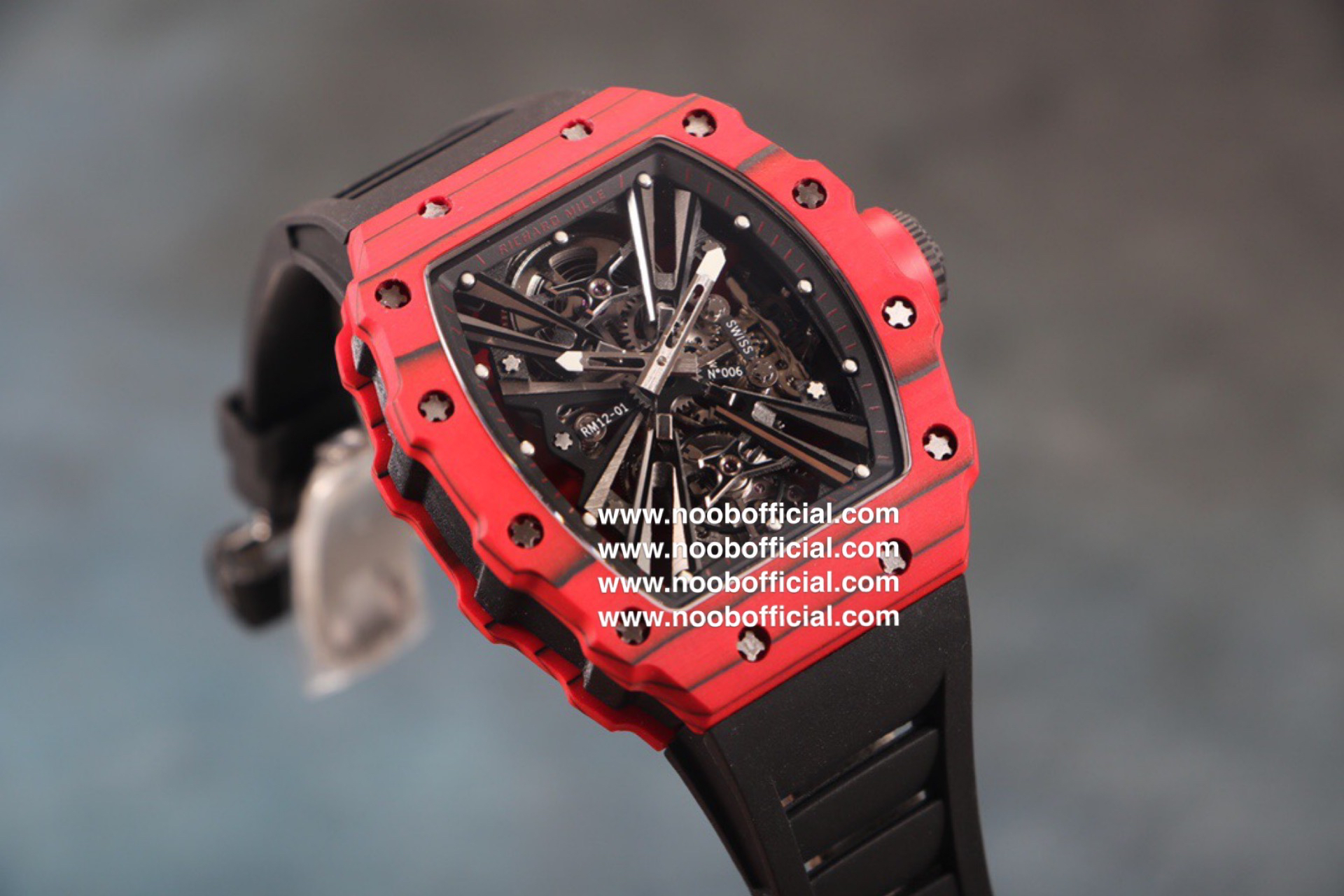 【RICHARD MILLE】理查德 RM12-01NTPT真陀飞轮 非凡运动镂空流线型手表,机芯手动上链机芯,机芯桥板融入赛车底盘的灵感元素,镂空基板以4枚钛合金桥板固定,直接呈现机芯的运动,两支指针搭配与表壳相近的颜色,陀飞轮位于6点。表壳有多种不同的配色版本,有纯黑碳纤维、红色石英纤维、白色石英纤维。表带可挑选搭配橡胶表带与凡布面料表带。