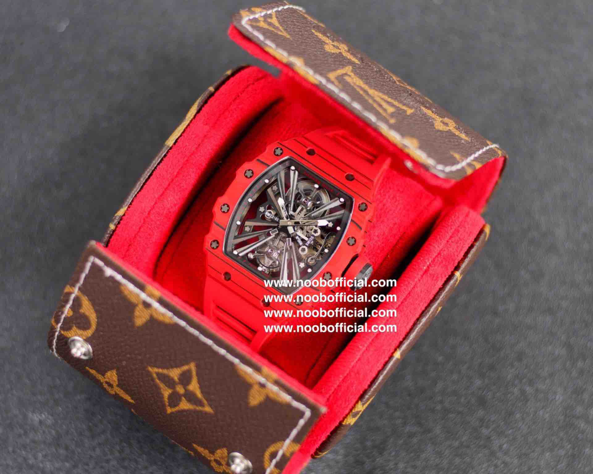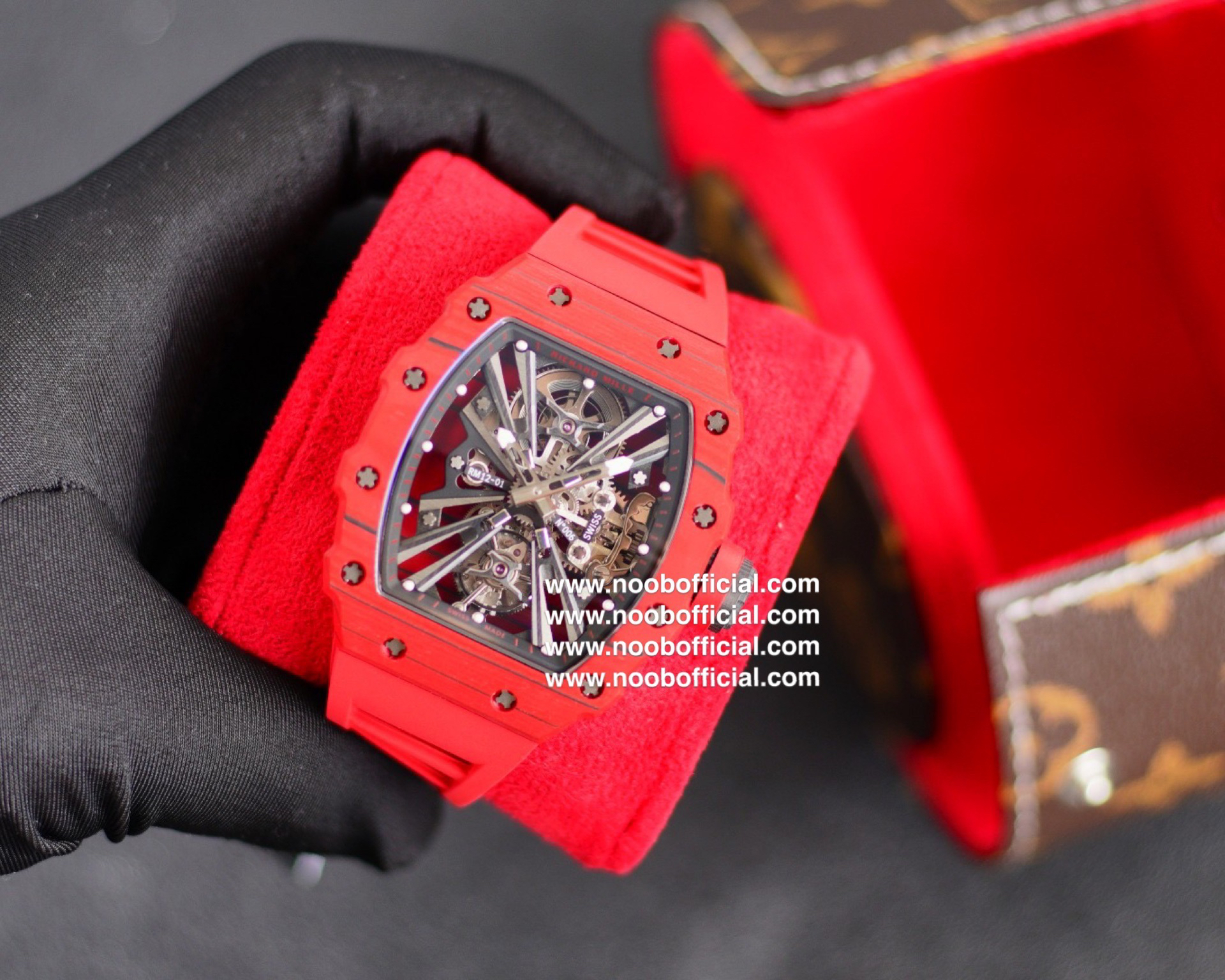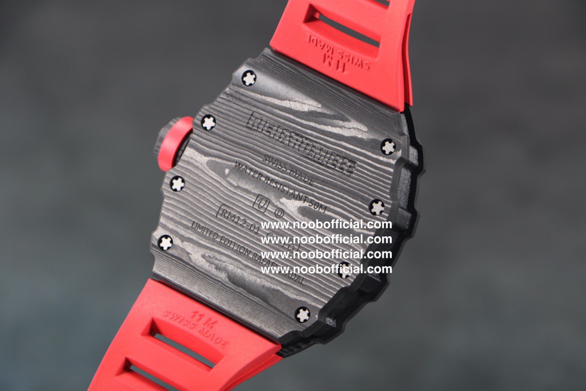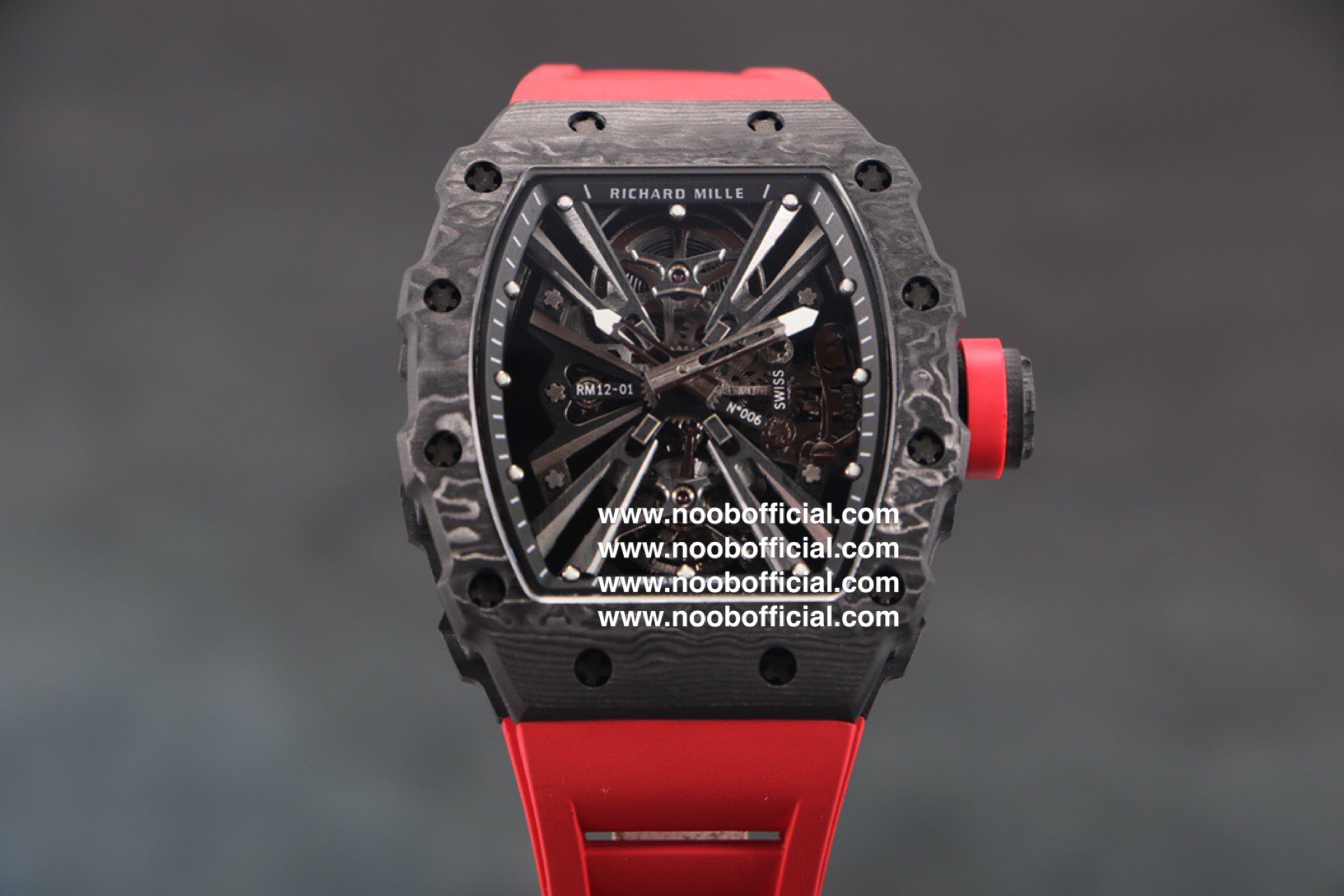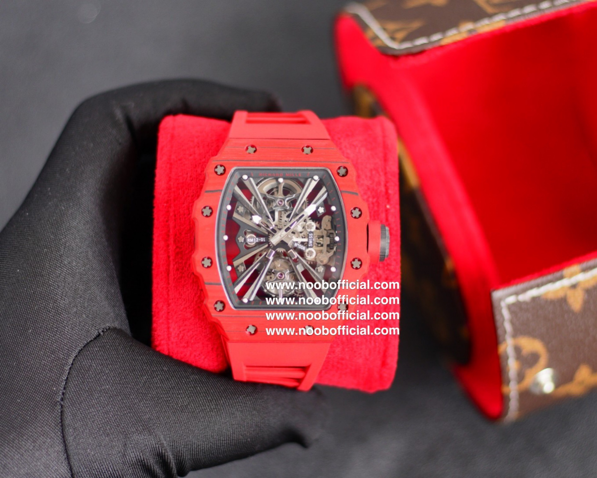 【RICHARD MILLE】理查德 RM12-01NTPT真陀飞轮 非凡运动镂空流线型手表,机芯手动上链机芯,机芯桥板融入赛车底盘的灵感元素,镂空基板以4枚钛合金桥板固定,直接呈现机芯的运动,两支指针搭配与表壳相近的颜色,陀飞轮位于6点。表壳有多种不同的配色版本,有纯黑碳纤维、红色石英纤维、白色石英纤维。表带可挑选搭配橡胶表带与凡布面料表带。