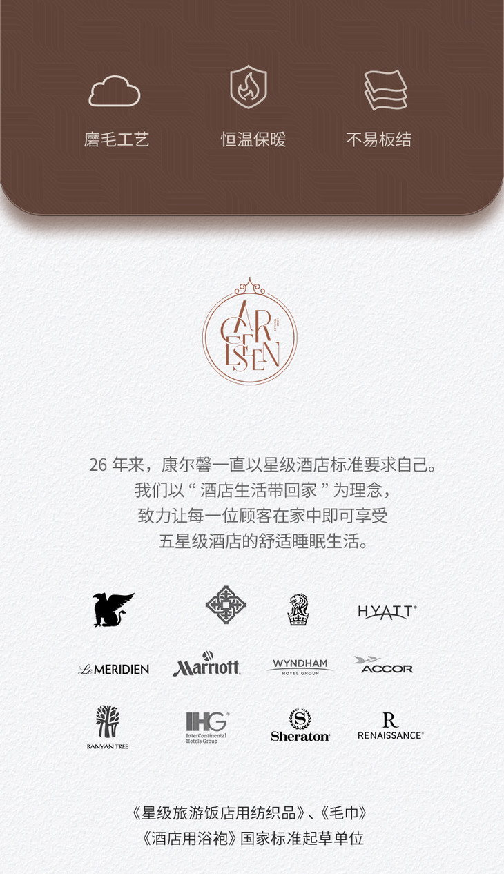 - 源自五星级酒店的奢华家纺品牌,康乃馨首次提出打造“酒店+家纺”的全新概念,将更为严格的五星级酒店纺织品品质标准与家纺相结合,完美诠释“酒店品质家纺”的舒适感受与奢华品味。