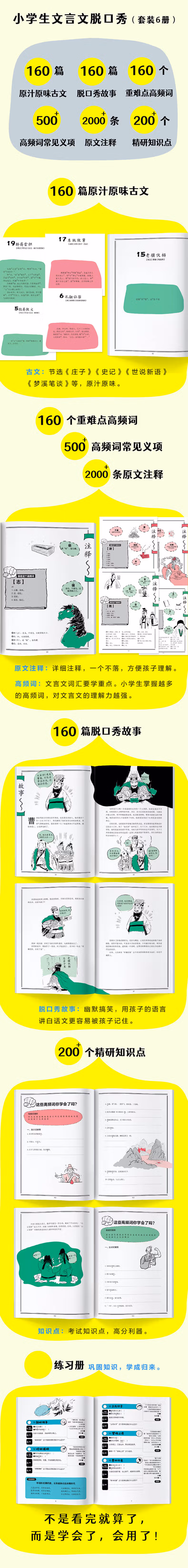 《小学生文言文脱口秀》一套六册,从《庄子》《史记》《世说新语》《梦溪笔谈》等中华传统经典里撷取了160篇精选适合小学生学习的文言文,摘取160个高频词,238个精研知识点,500+高频词常见义项,2260条字词注释,高频词例句覆盖近1/3中学阶段文言文篇目,全套共计赠送72p习题折页,在快乐中学通文言文!