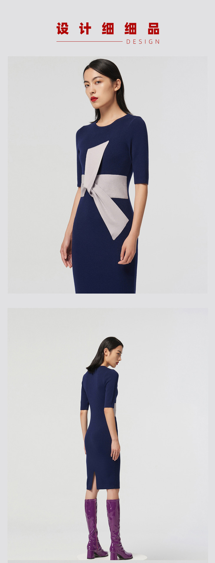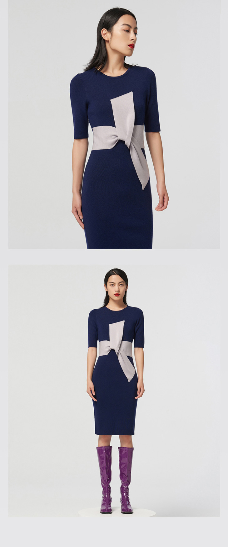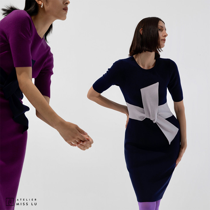【大叉不差】AtelierMissLu玩味交叉结藏蓝绵羊毛修身高弹连衣裙