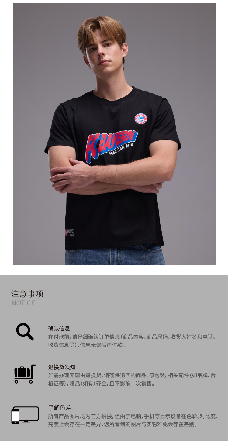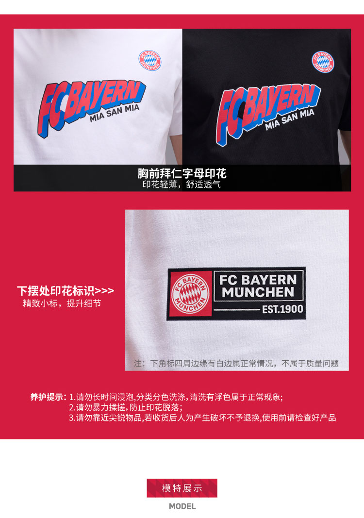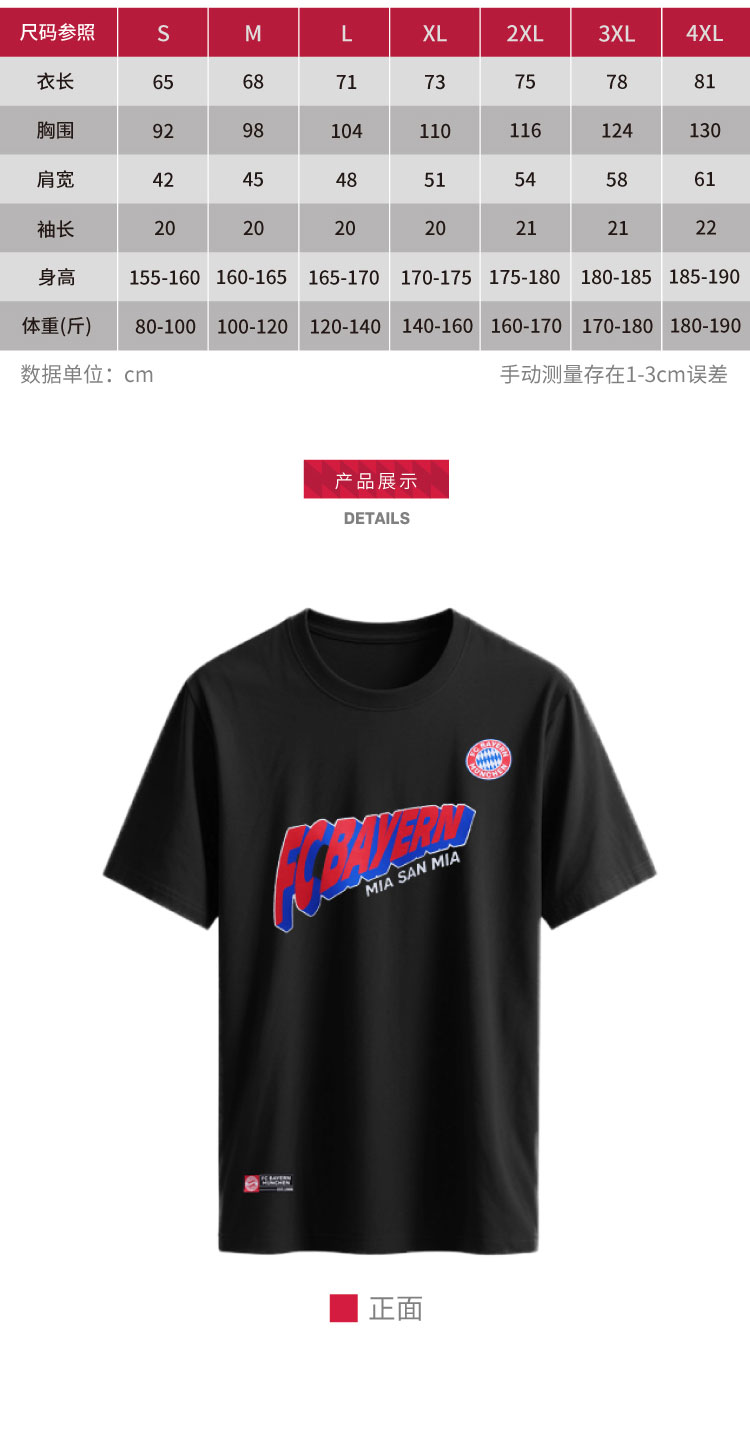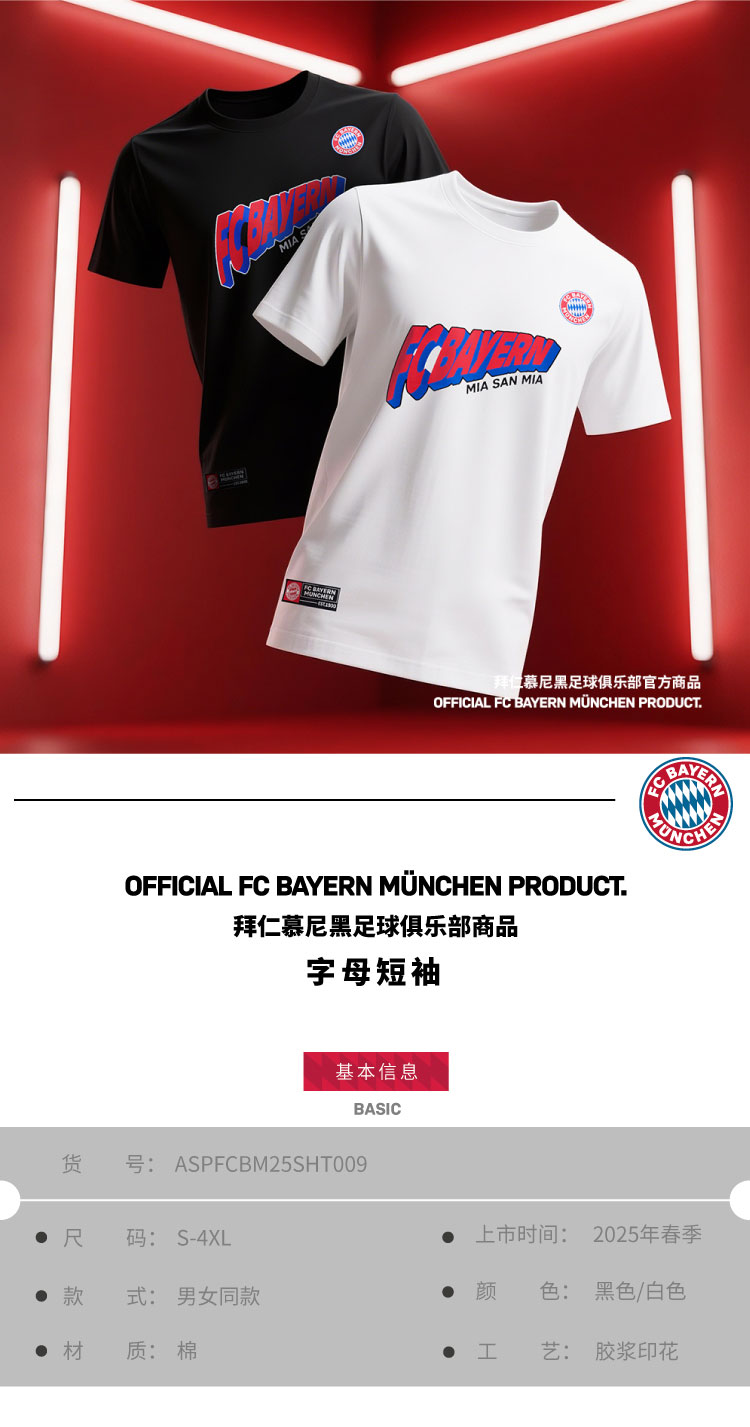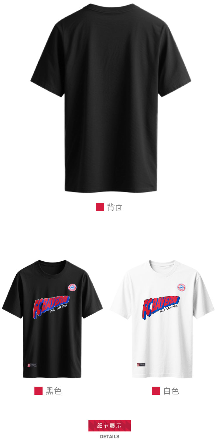 【官方正版】拜仁足球俱乐部丨字母短袖黑白两色印花T恤潮流