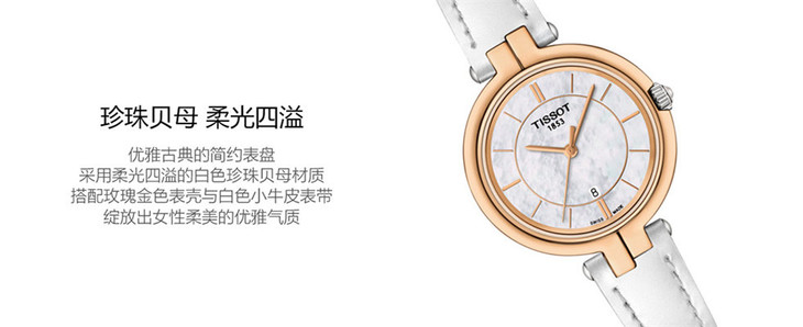 镜面 材质 | 蓝宝石水晶玻璃 | 表盘 | 精钢PVD镀玫瑰金表壳 白色珍珠贝母表盘 条字刻度时标 大三针 日期显示 |