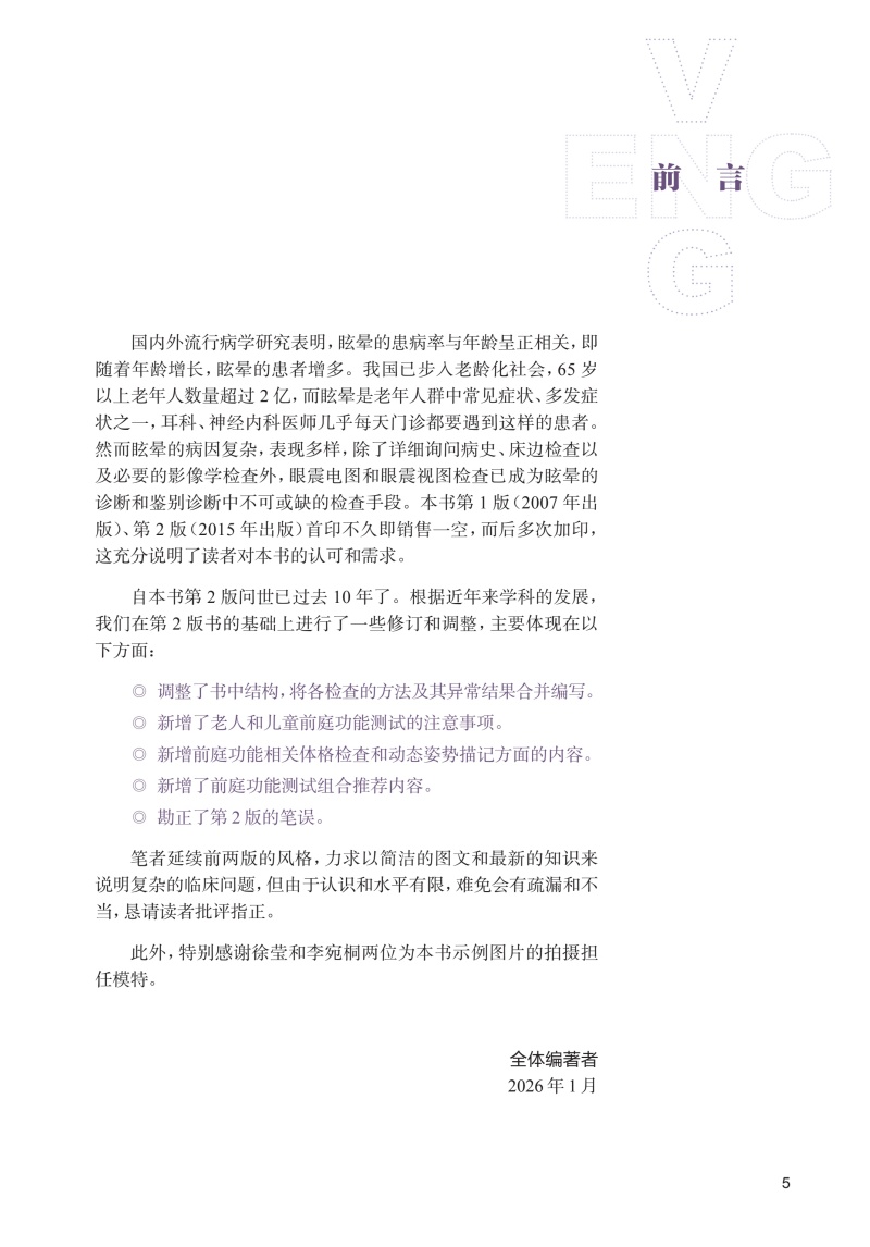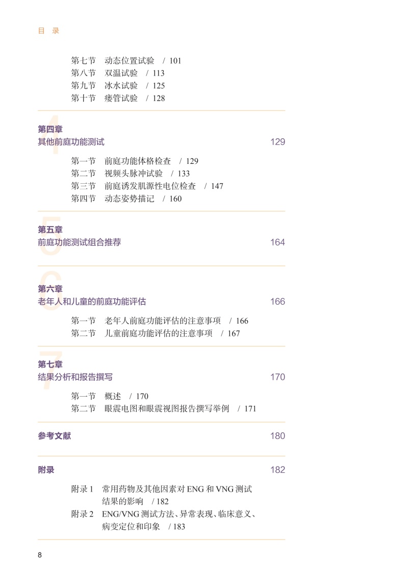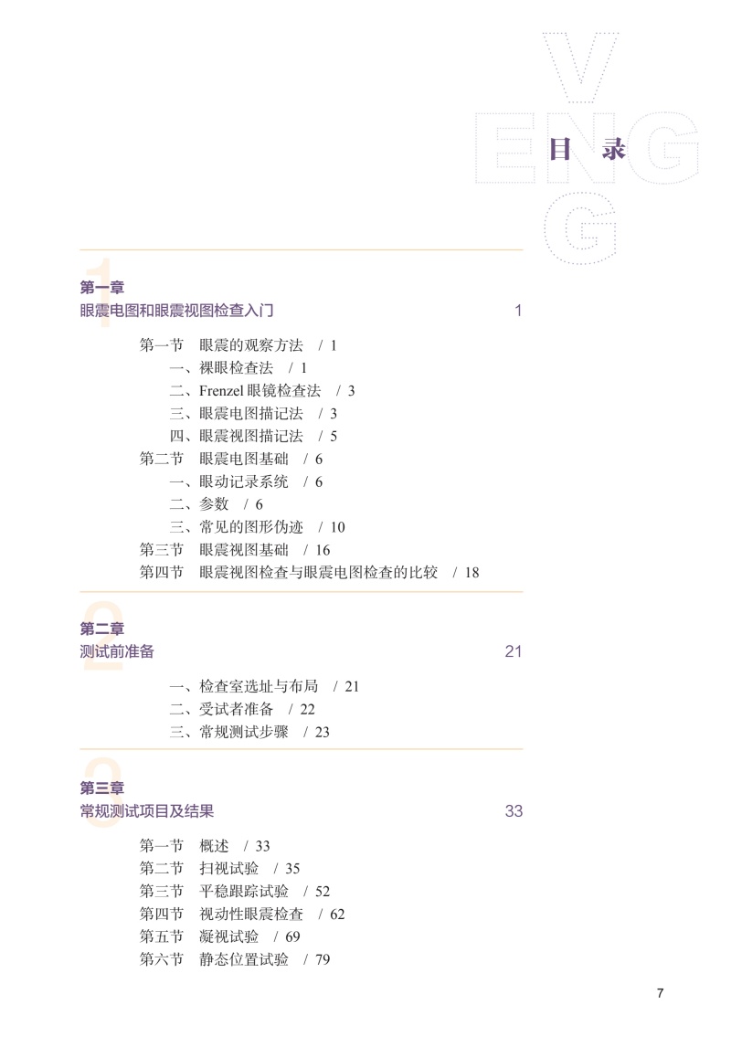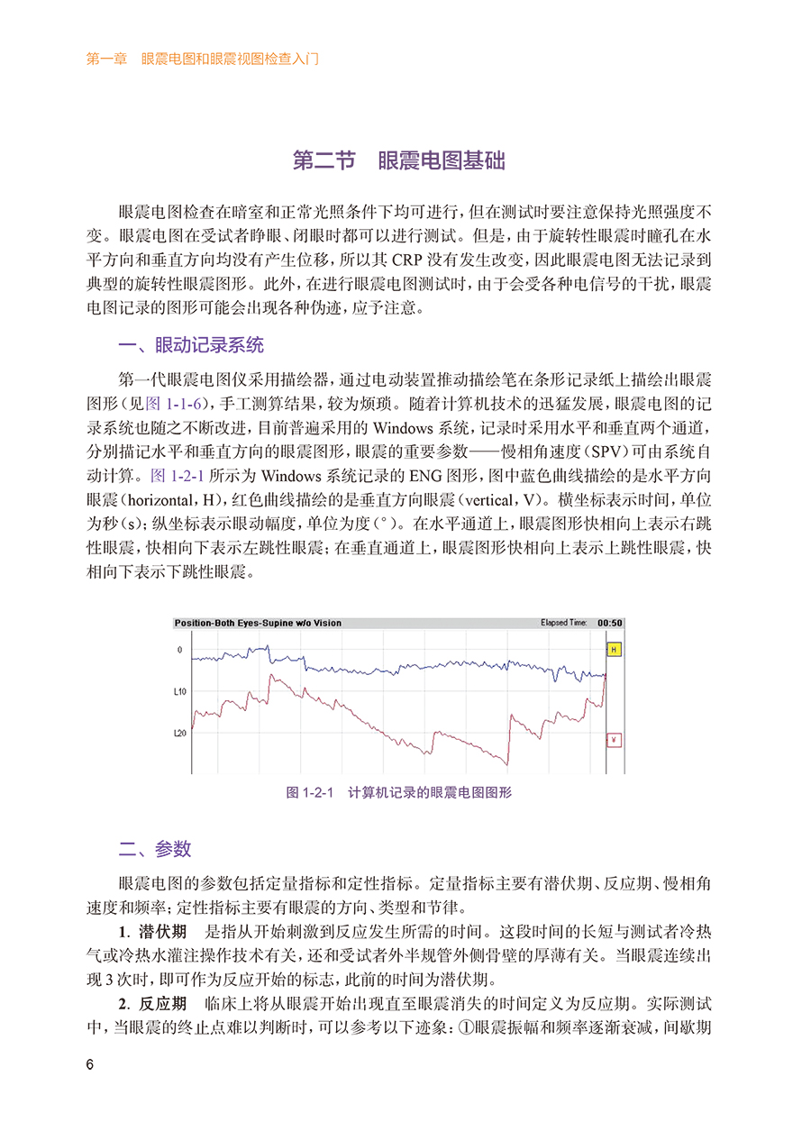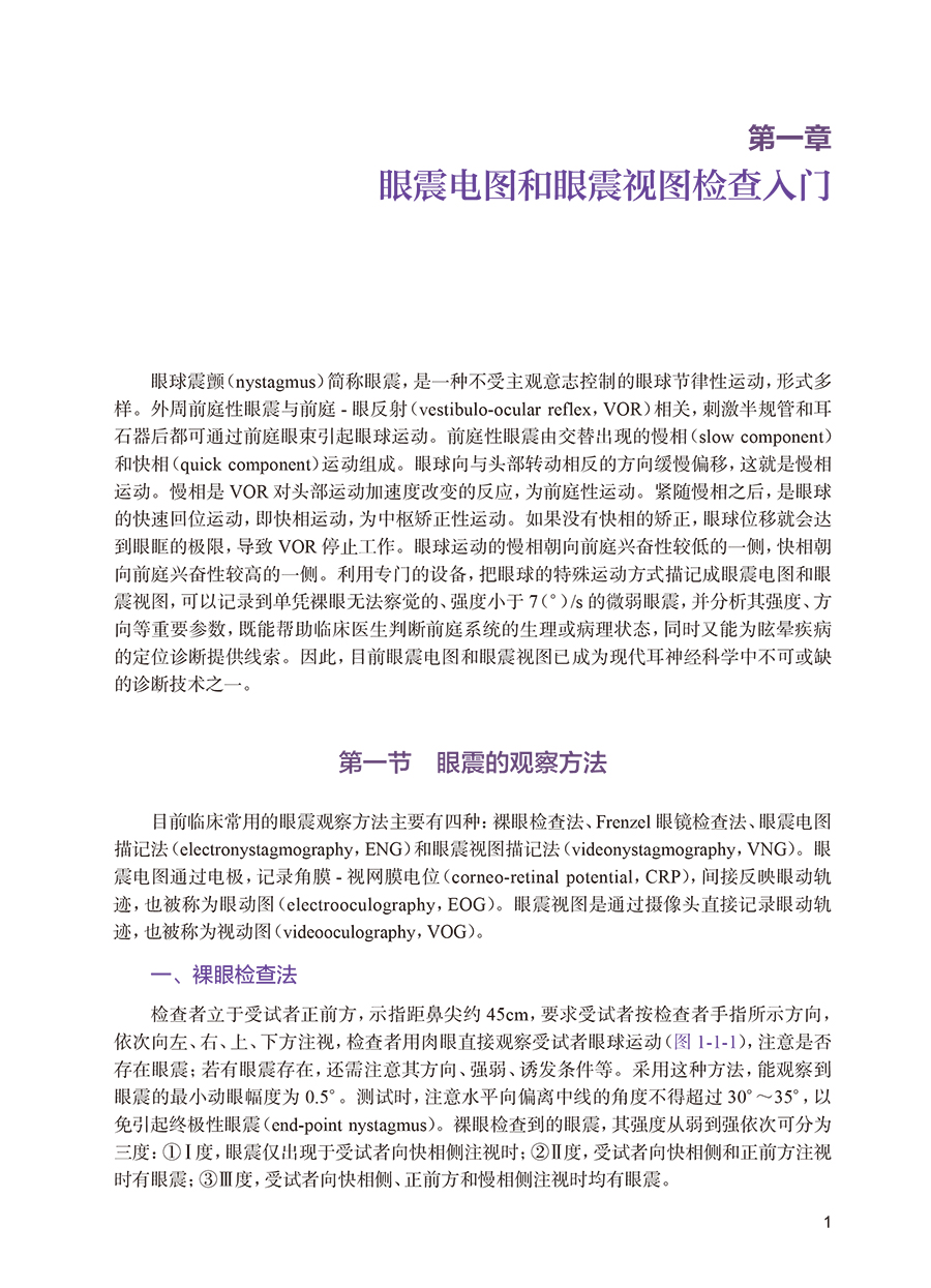 第一章眼震电图和眼震视图检查入门 1 第一节 眼震的观察方法 / 1 一、 裸眼检查法 / 1 二、 Frenzel 眼镜检查法 / 3 三、 眼震电图描记法 / 3 四、 眼震视图描记法 / 5 第二节 眼震电图基础 / 6 一、 眼动记录系统 / 6 二、 参数 / 6 三、 常见的图形伪迹 / 10 第三节 眼震视图基础 / 16 第四节 眼震视图检查与眼震电图检查的比较 / 18 第二章测试前准备 21 一、 检查室选址与布局 / 21 二、 受试者准备 / 22 三、 常规测试步骤 / 23 第三章常规测试项目及结果 33 第一节 概述 / 33 第二节 扫视试验 / 35 第三节 平稳跟踪试验 / 52 第四节 视动性眼震检查 / 62 第五节 凝视试验 / 69 第六节 静态位置试验 / 79 第七节 动态位置试验 / 101 第八节 双温试验 / 113 第九节 冰水试验 / 125 第十节 瘘管试验 / 128 第四章其他前庭功能测试 129 第一节 前庭功能体格检查 / 129 第二节 视频头脉冲试验 / 133 第三节 前庭诱发肌源性电位检查 / 147 第四节 动态姿势描记 / 160 第五章前庭功能测试组合推荐 164 第六章老年人和儿童的前庭功能评估 166 第一节 老年人前庭功能评估的注意事项 / 166 第二节 儿童前庭功能评估的注意事项 / 167 第七章结果分析和报告撰写 170 第一节 概述 / 170 第二节 眼震电图和眼震视图报告撰写举例 / 171 参考文献 180 附录 182 附录1 常用药物及其他因素对ENG 和VNG 测试结果的影响 / 182 附录2 ENG/VNG 测试方法、异常表现、临床意义、病变定位和印象 / 183