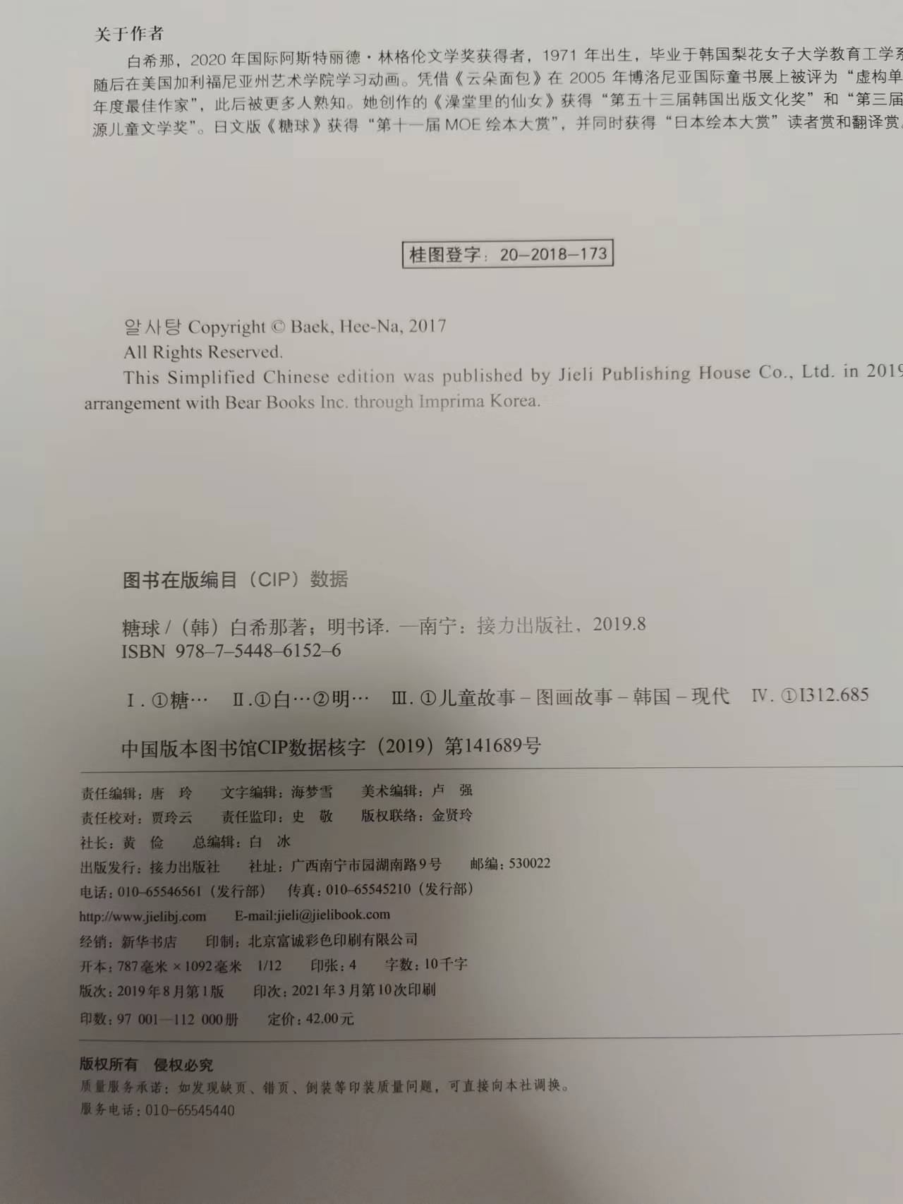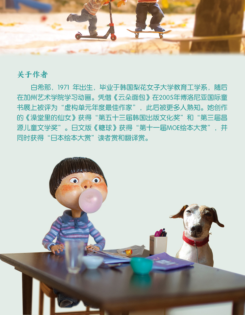 白希那 1971 年出生,韩国著名图画书作家,韩国第1位荣获韩国出版奖、意大利博洛尼亚国际童书展“年度文学类插图奖”的图画书作家。韩国梨花女子大学教育工学系毕业,现专职从事童书创作,致力于引发儿童兴趣的、兼具个性的图画书创作。《云朵面包》用纸雕的技法生动地描绘出了一个雨天的想象故事,曾在 2005 年博洛尼亚国际儿童书展上获得“年度文学类插画奖”。2012年她创作的《澡堂里的仙女》获得韩国出版奖“第五十三届韩国出版文化奖”,这是这个奖第1次颁发给图画书作品。