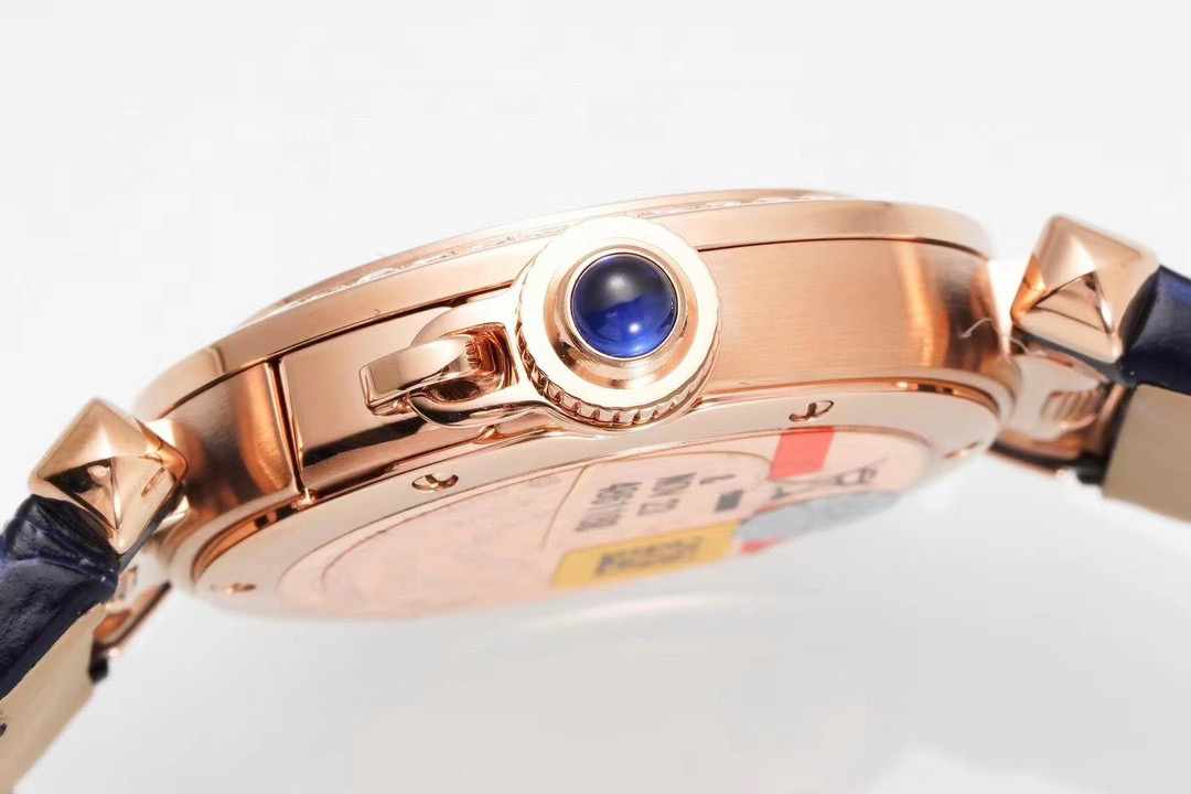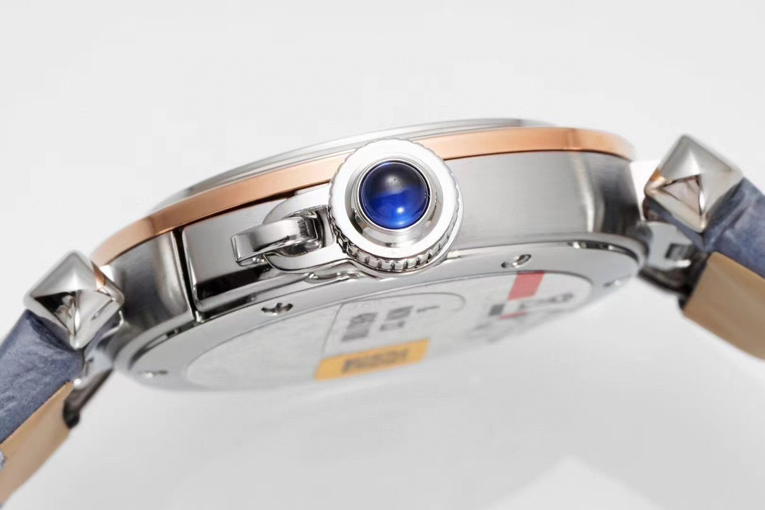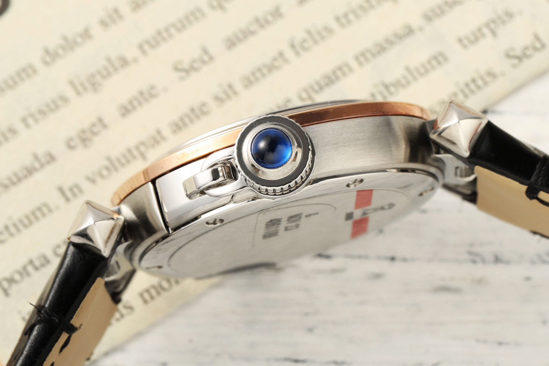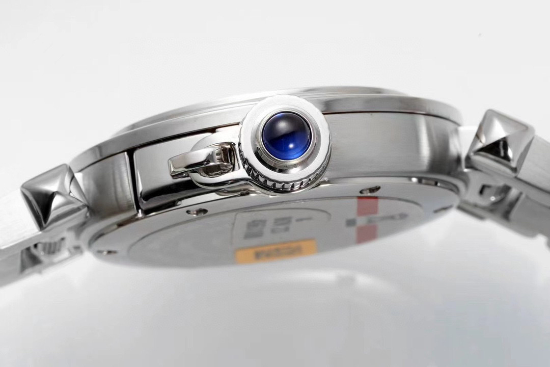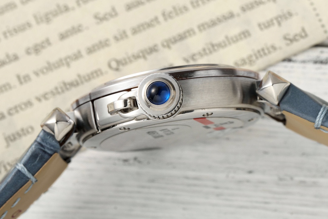 【 Case 】 30MM stainless steel case, exquisite circular design, warm and beautiful, the combination of metal polishing and wire drawing brings a richer sense of layering. The chain crown on the right side is also one of the unique features of the Pasha watch, which is designed by Cartier to meet customer requirements and achieve a waterproof performance of 100 meters in a slim shape. Open the outermost short chain crown to rotate the crown fixed on the watch case; And both the inner and outer crowns are embedded with convex blue synthetic spinel, highlighting the luxurious texture of the watch.