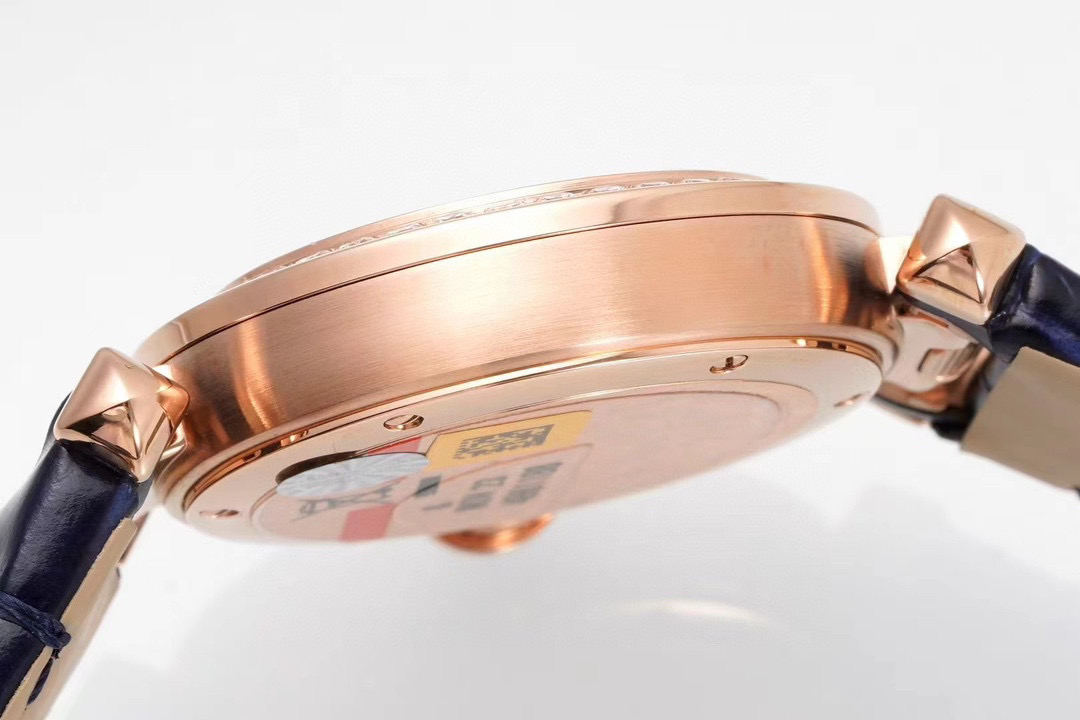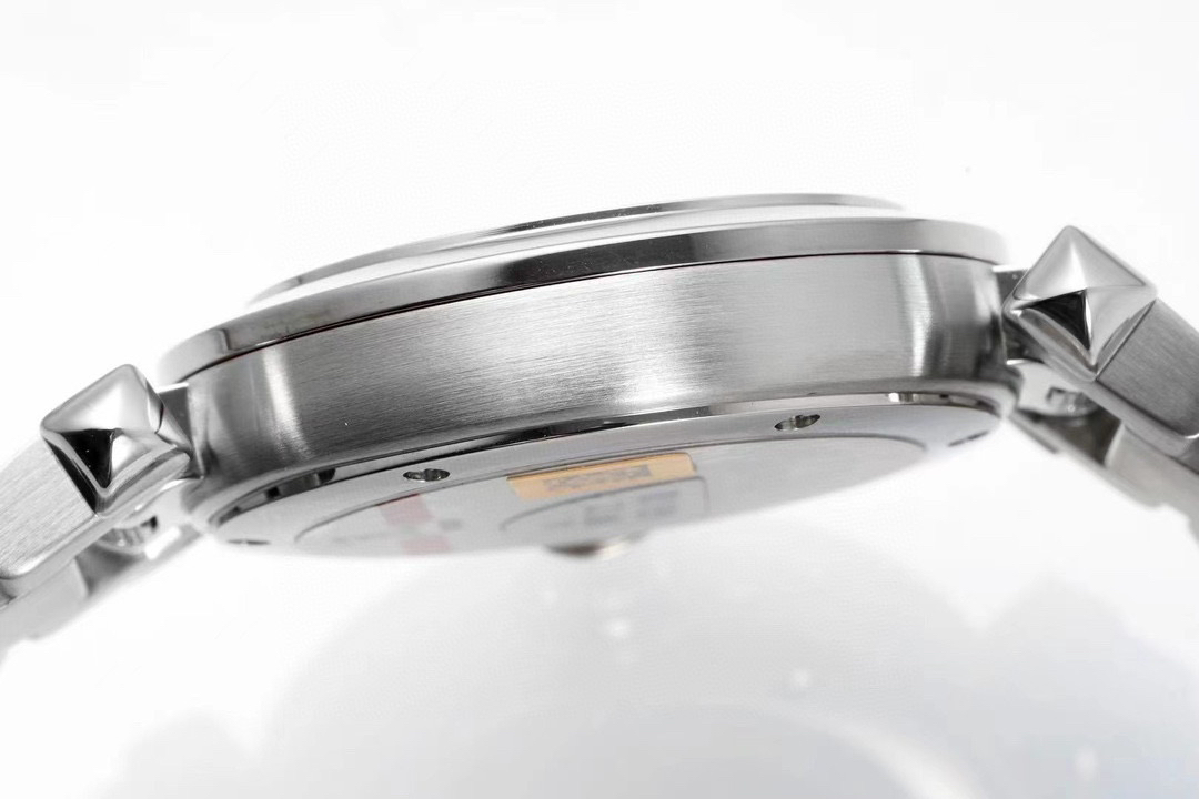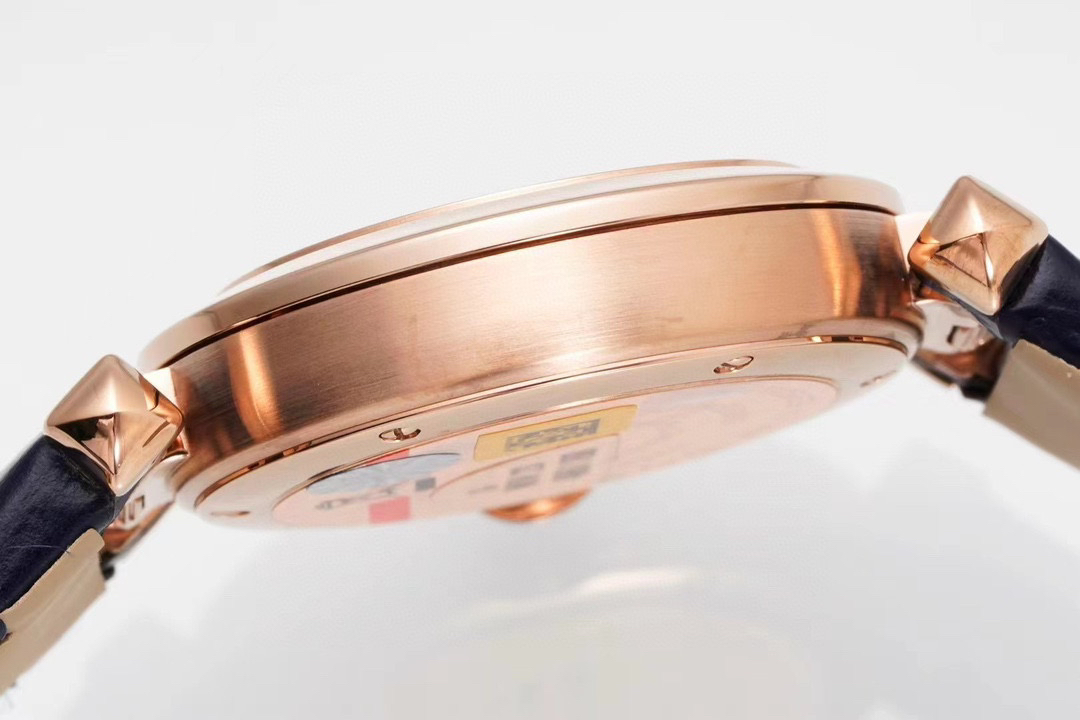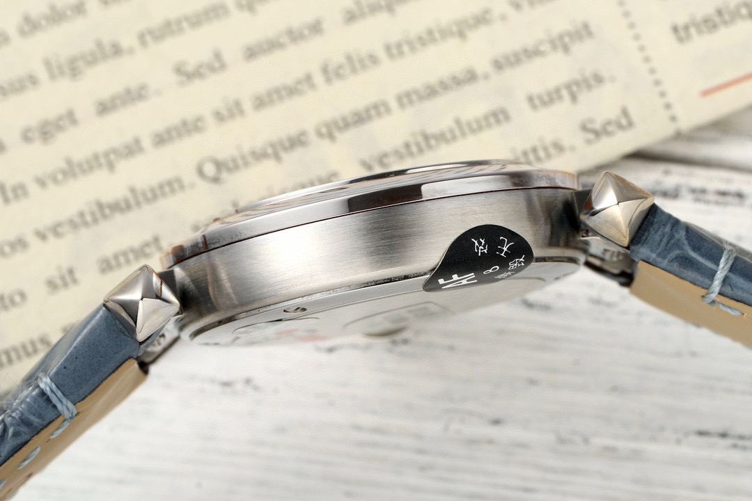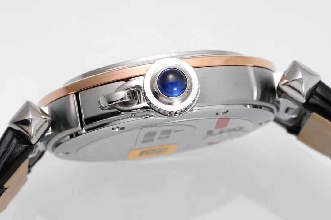 【 Case 】 30MM stainless steel case, exquisite circular design, warm and beautiful, the combination of metal polishing and wire drawing brings a richer sense of layering. The chain crown on the right side is also one of the unique features of the Pasha watch, which is designed by Cartier to meet customer requirements and achieve a waterproof performance of 100 meters in a slim shape. Open the outermost short chain crown to rotate the crown fixed on the watch case; And both the inner and outer crowns are embedded with convex blue synthetic spinel, highlighting the luxurious texture of the watch.