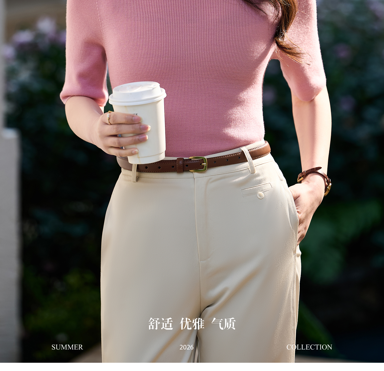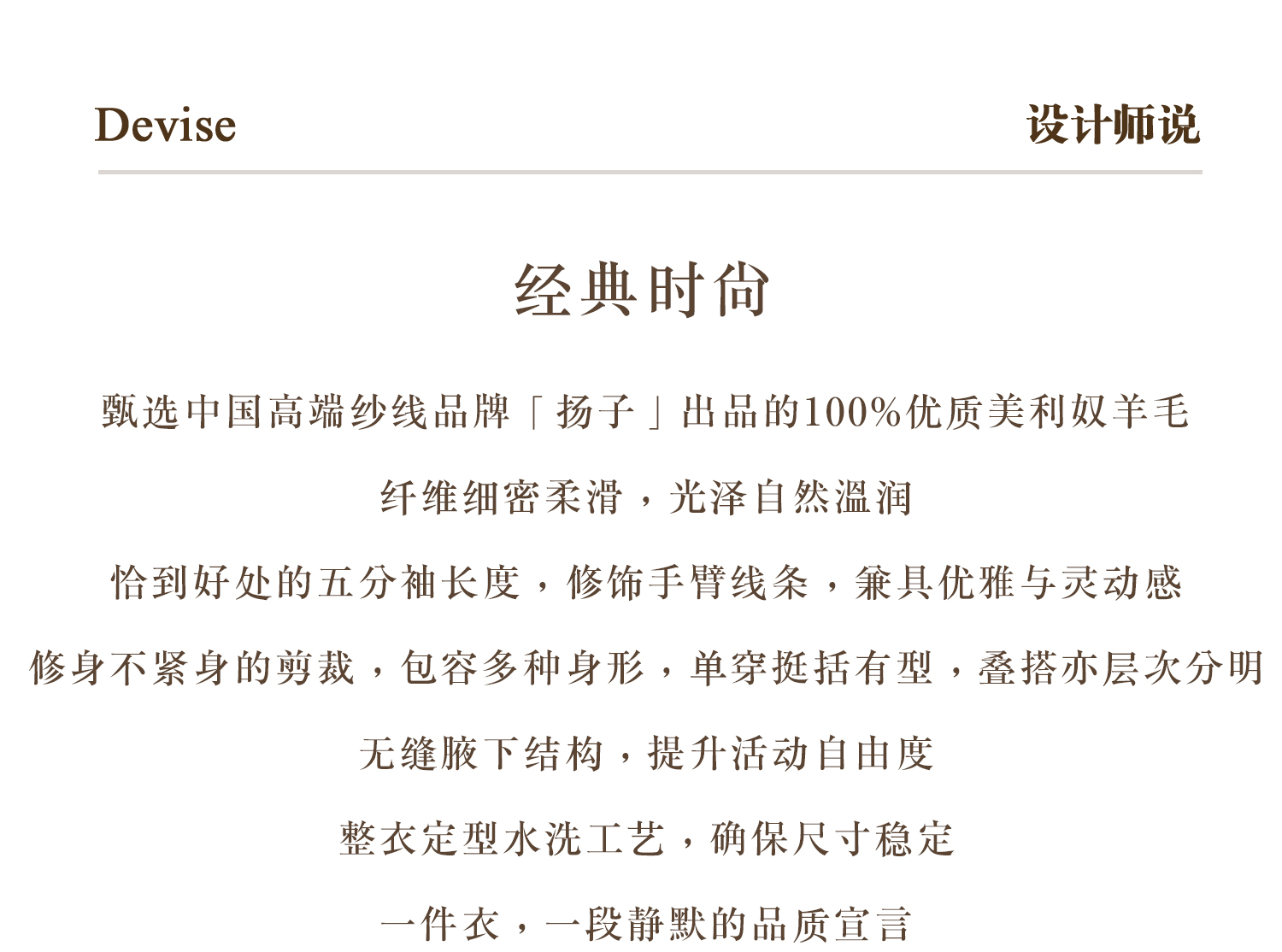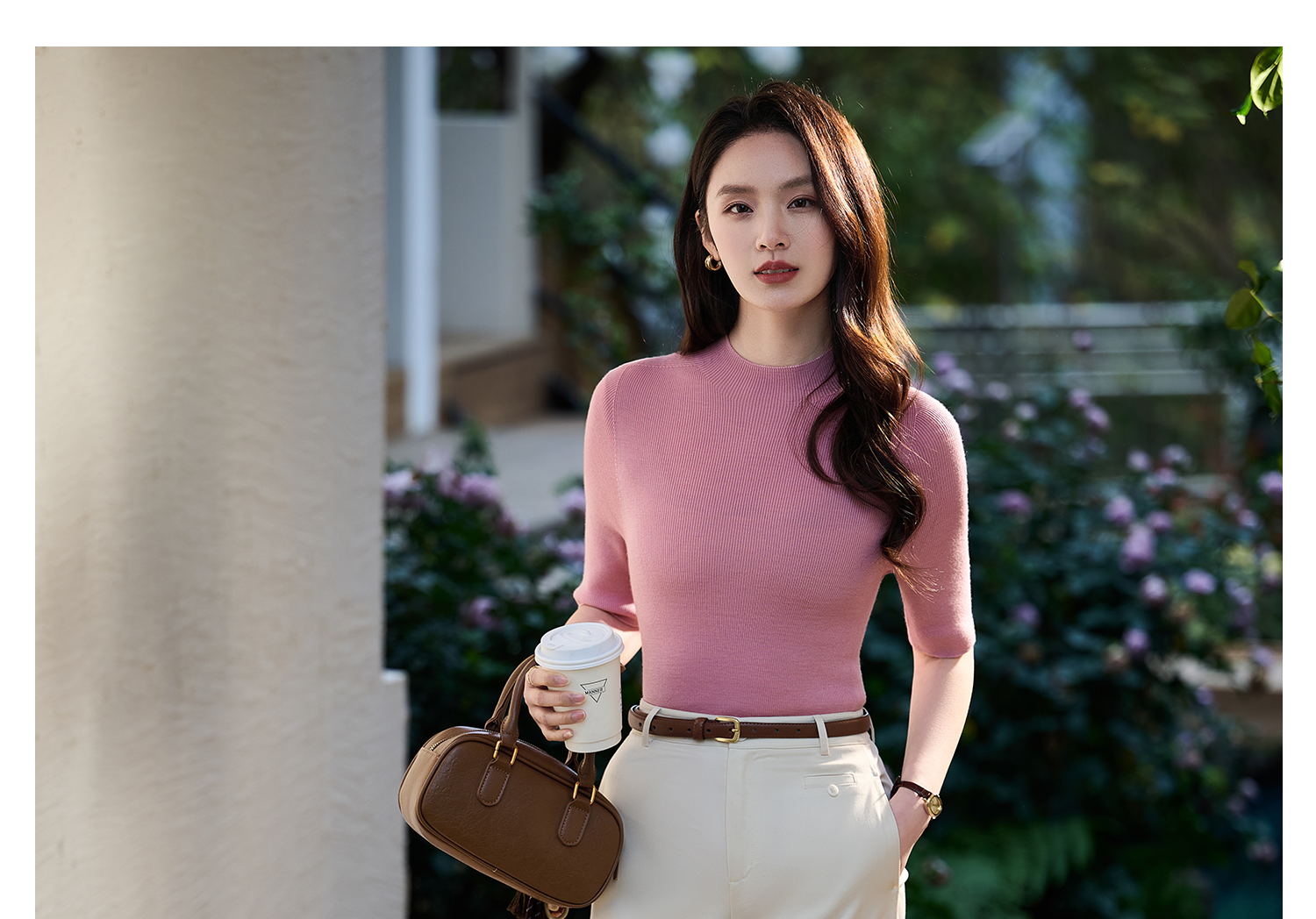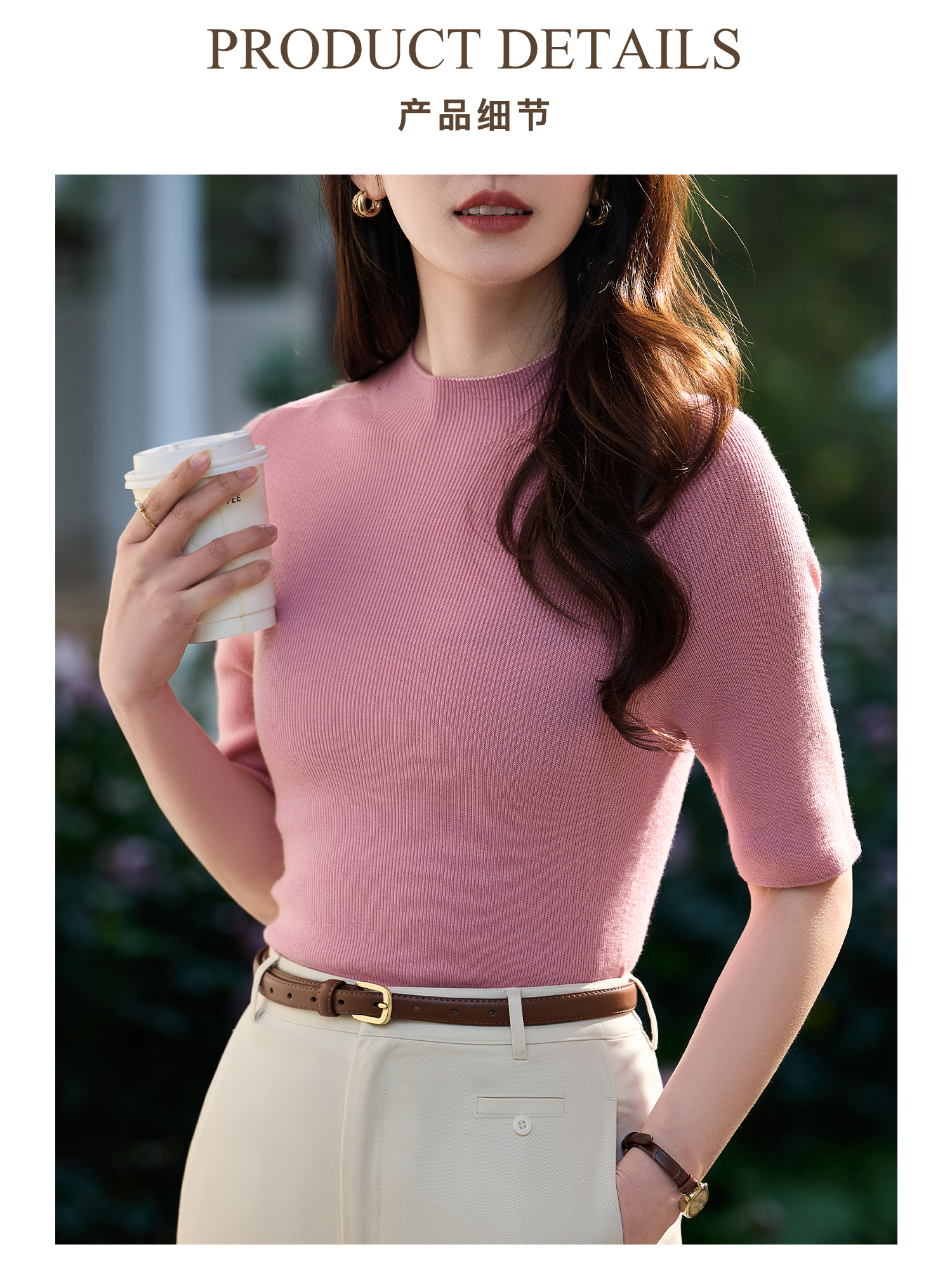 18针岛精扬子纱 100%羊毛 米思阳2026春季新款无缝一体五分袖短袖半高领针织打底衫女1064
