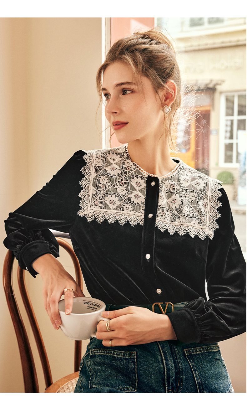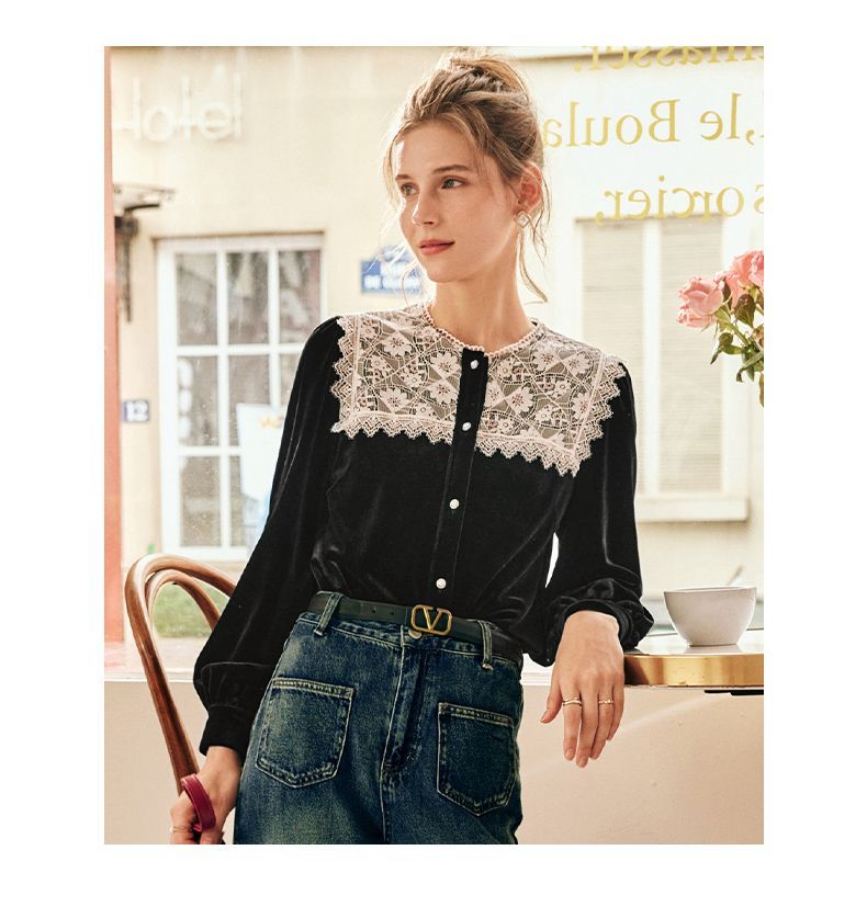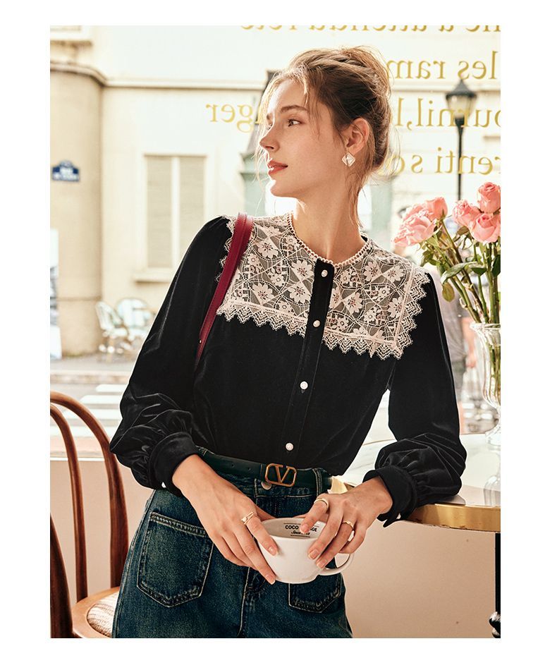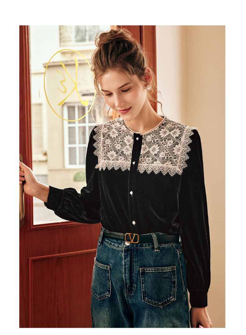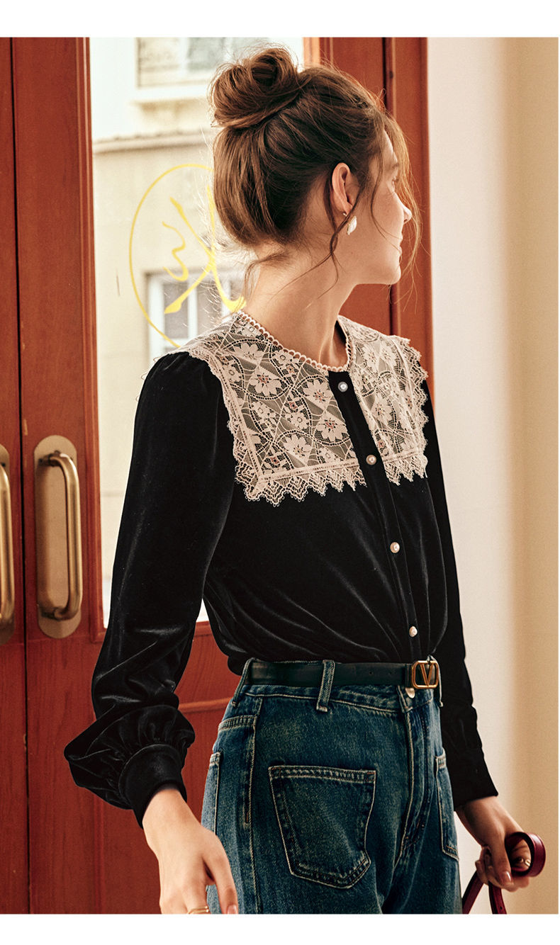 OLrain欧芮儿法式黑色雪纺蕾丝衫女秋季2022年新款海军领丝绒衬衣