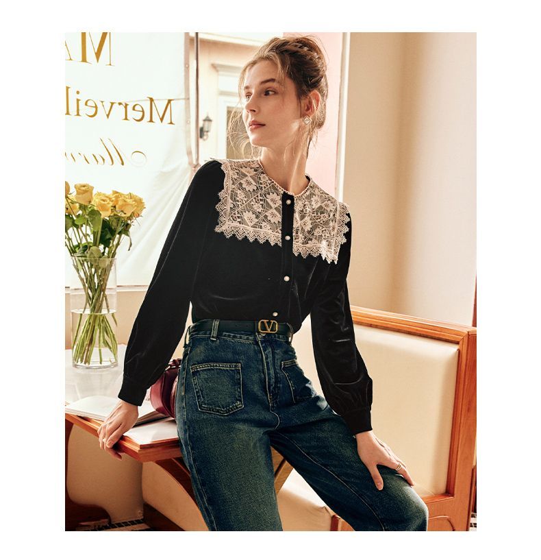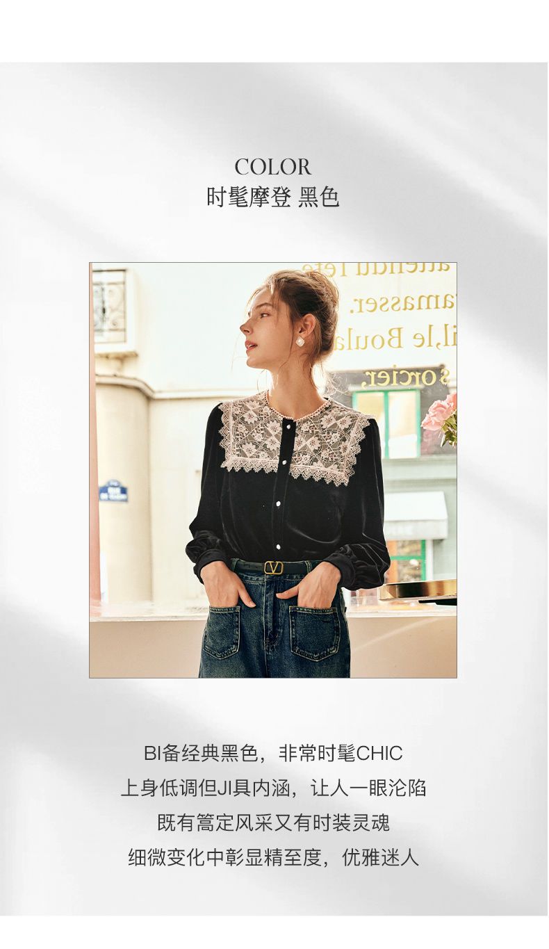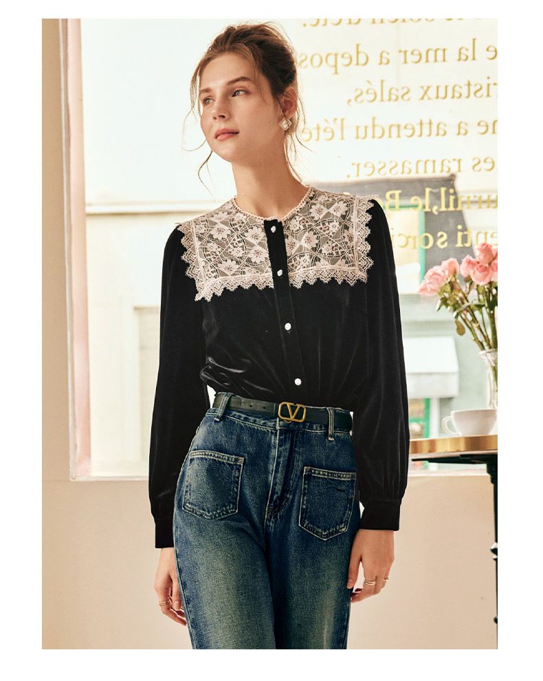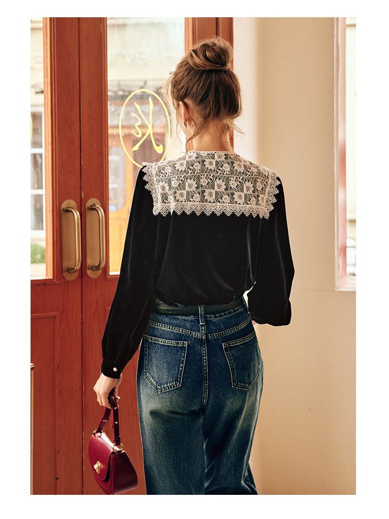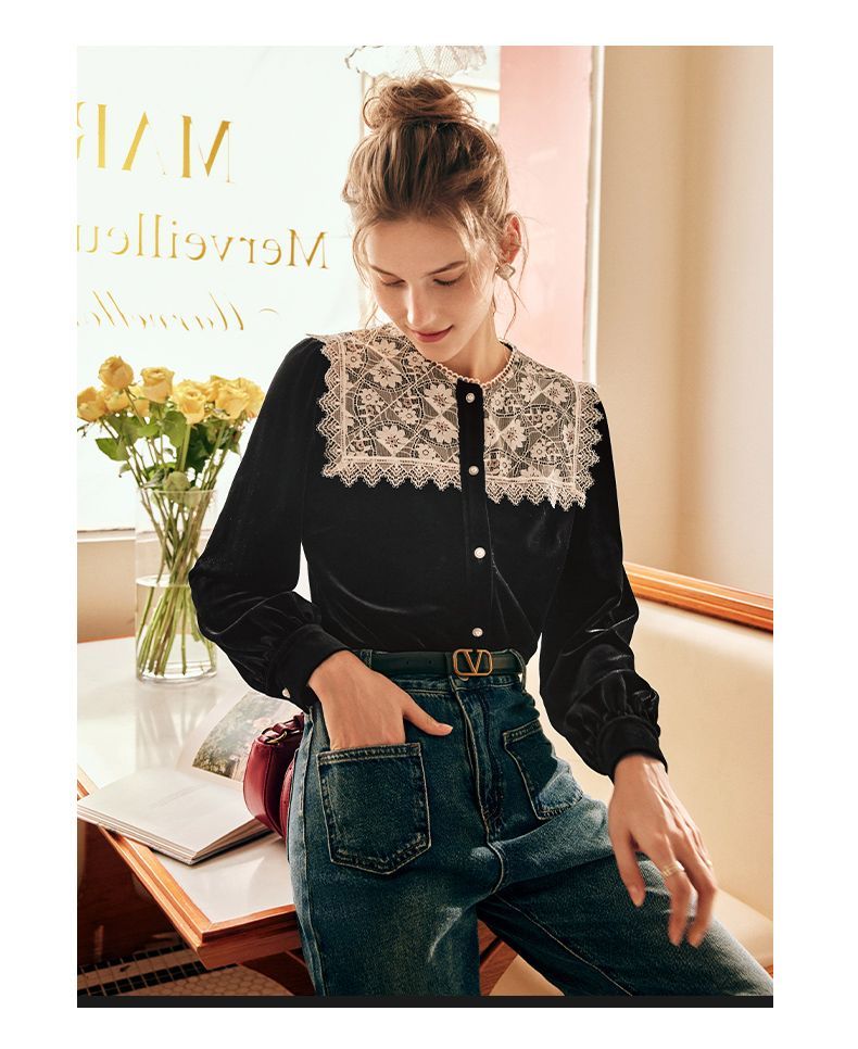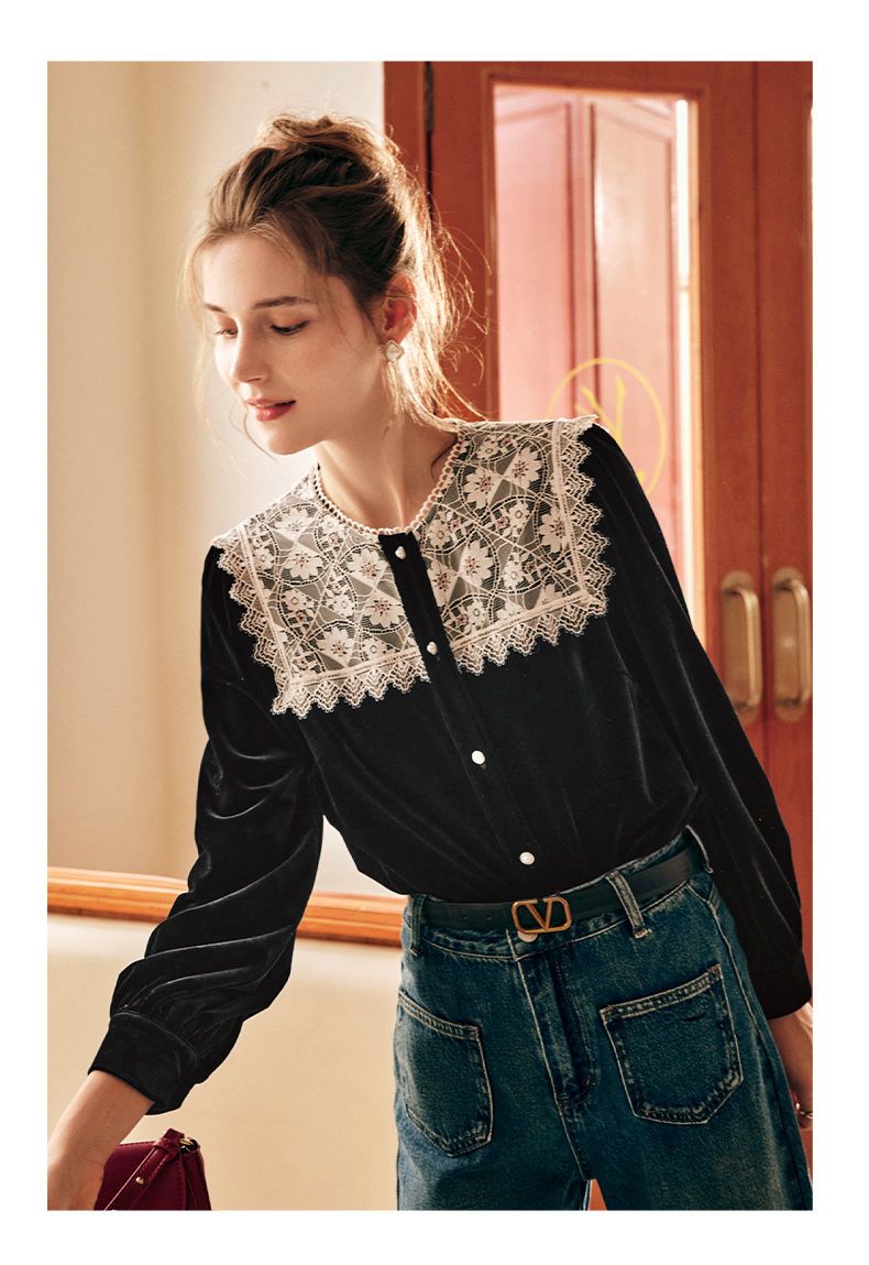 OLrain欧芮儿法式黑色雪纺蕾丝衫女秋季2022年新款海军领丝绒衬衣