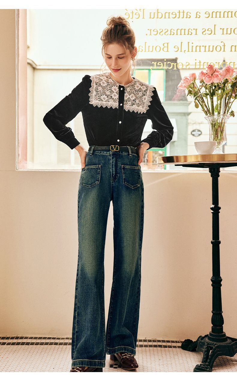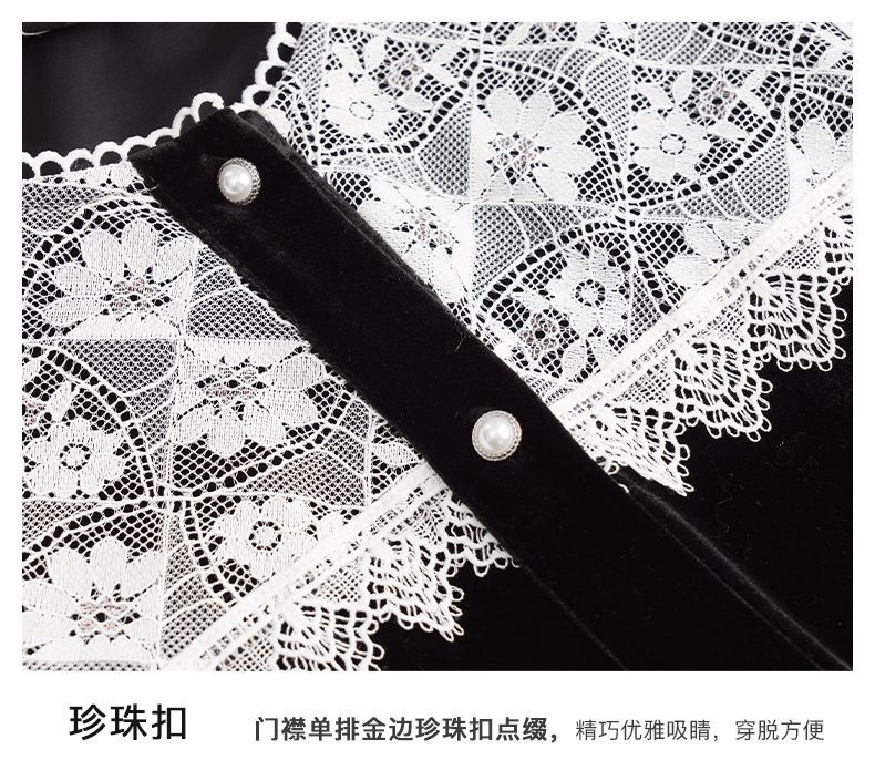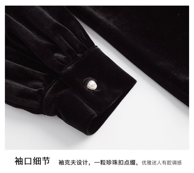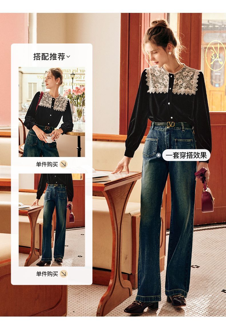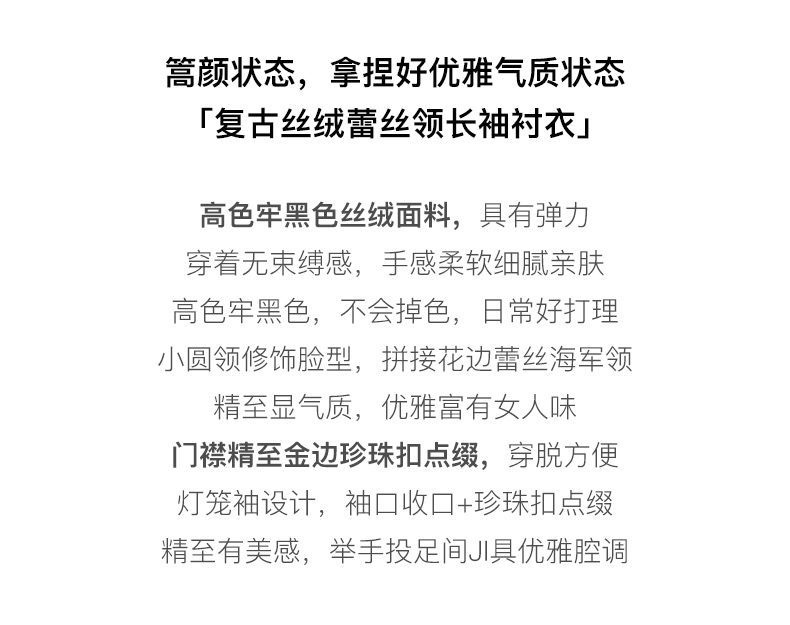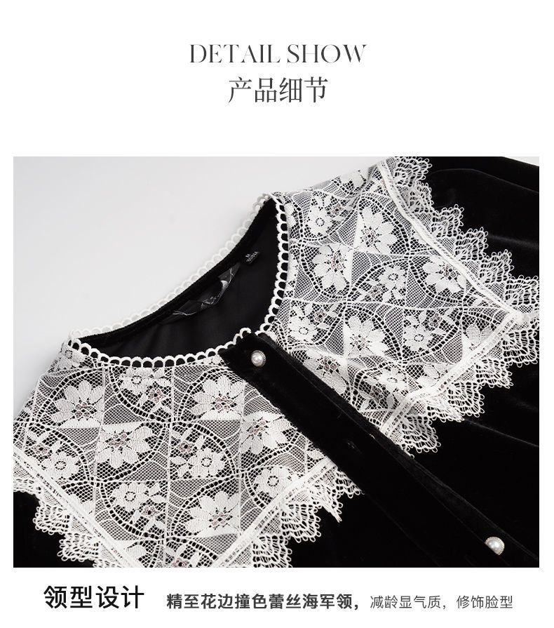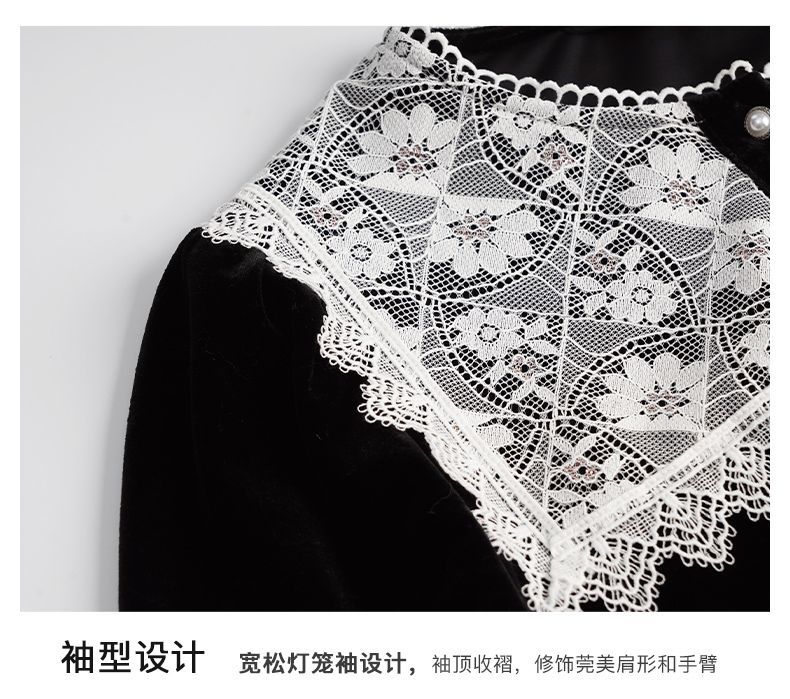 OLrain欧芮儿法式黑色雪纺蕾丝衫女秋季2022年新款海军领丝绒衬衣