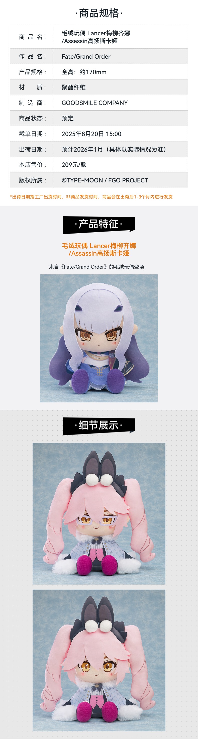 【GSC现货】毛绒玩偶 Lancer梅柳齐娜/Assassin高扬斯卡娅 Fate/Grand Order