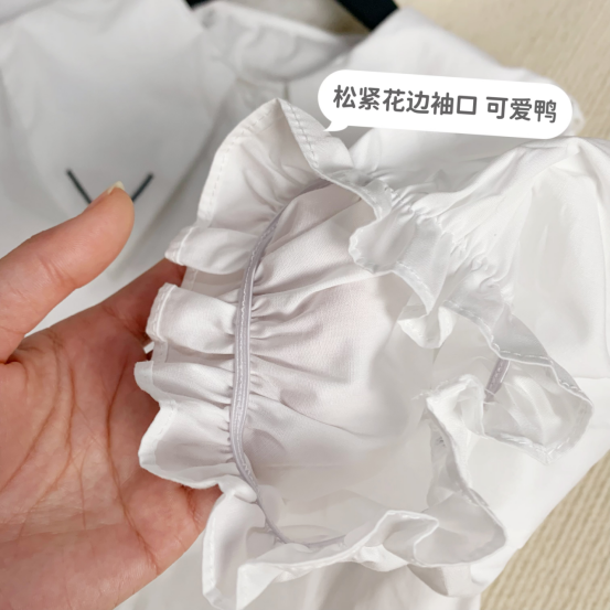 有点小心机的一个娃娃领白衬衫 使得甜美可爱气息扑面而来 松紧有度的袖口,穿着舒适有型