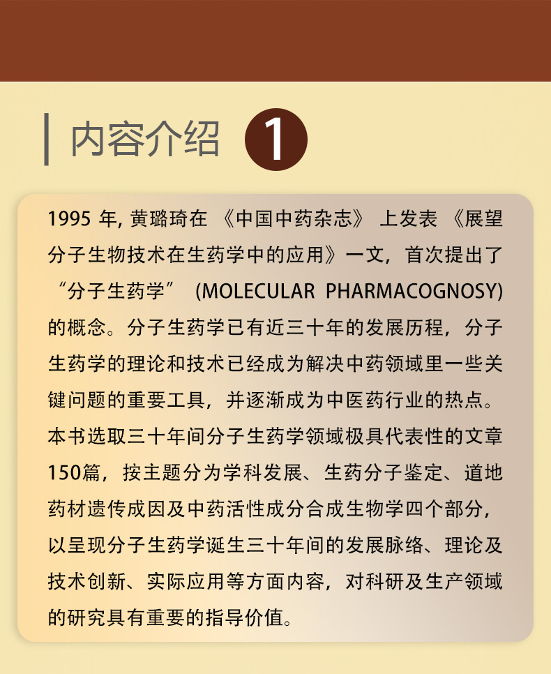 1995 年, 黄璐琦在 《中国中药杂志》 上发表 《展望分子生物技术在生药学中的应用》一文,首次提出了 “分子生药学” (molecular pharmacognosy) 的概念。分子生药学已有近三十年的发展历程,分子生药学的理论和技术已经成为解决中药领域里一些关键问题的重要工具,并逐渐成为中医药行业的热点。 本书选取三十年间分子生药学领域极具代表性的文章150篇,按主题分为学科发展、生药分子鉴定、道地药材遗传成因及中药活性成分合成生物学四个部分,以呈现分子生药学诞生三十年间的发展脉络、理论及技术创新、实际应用等方面内容,对科研及生产领域的研究具有重要的指导价值。