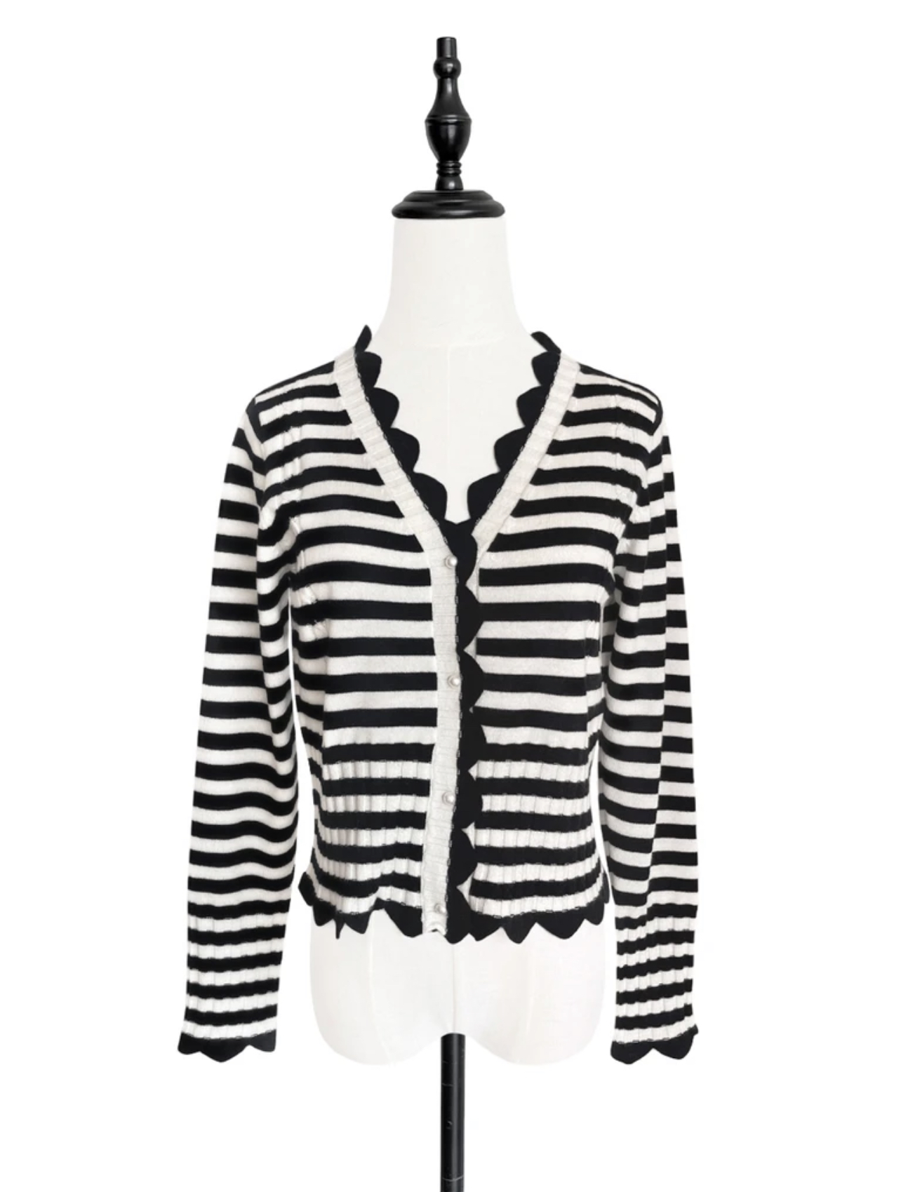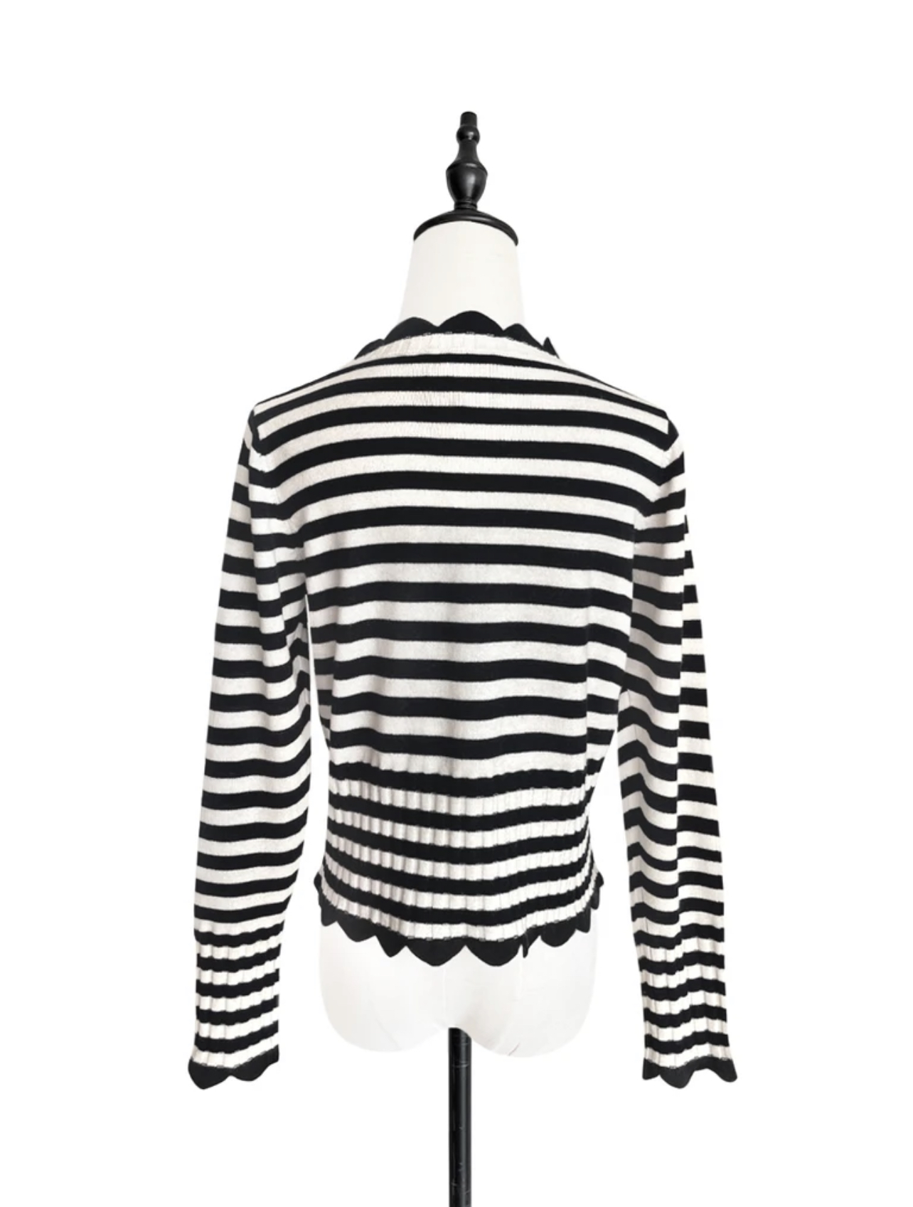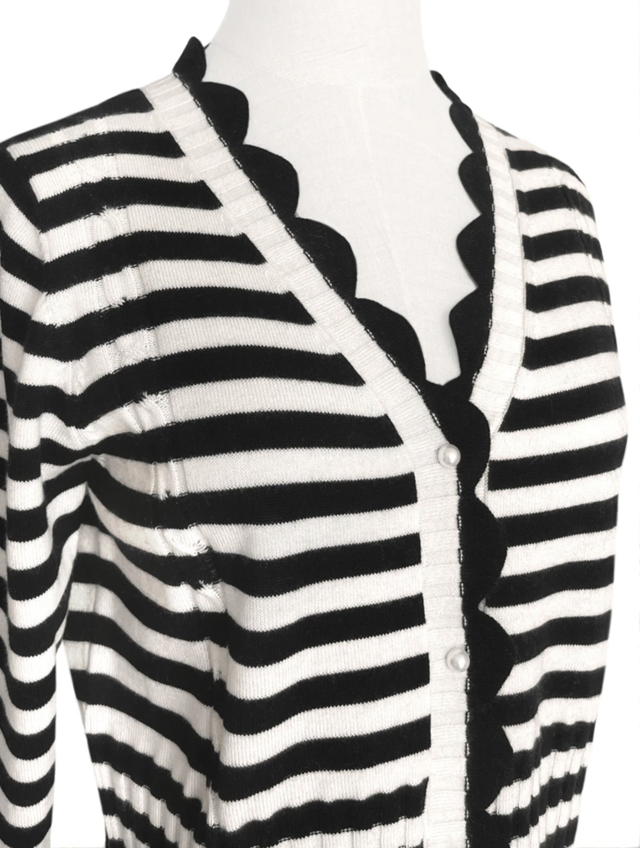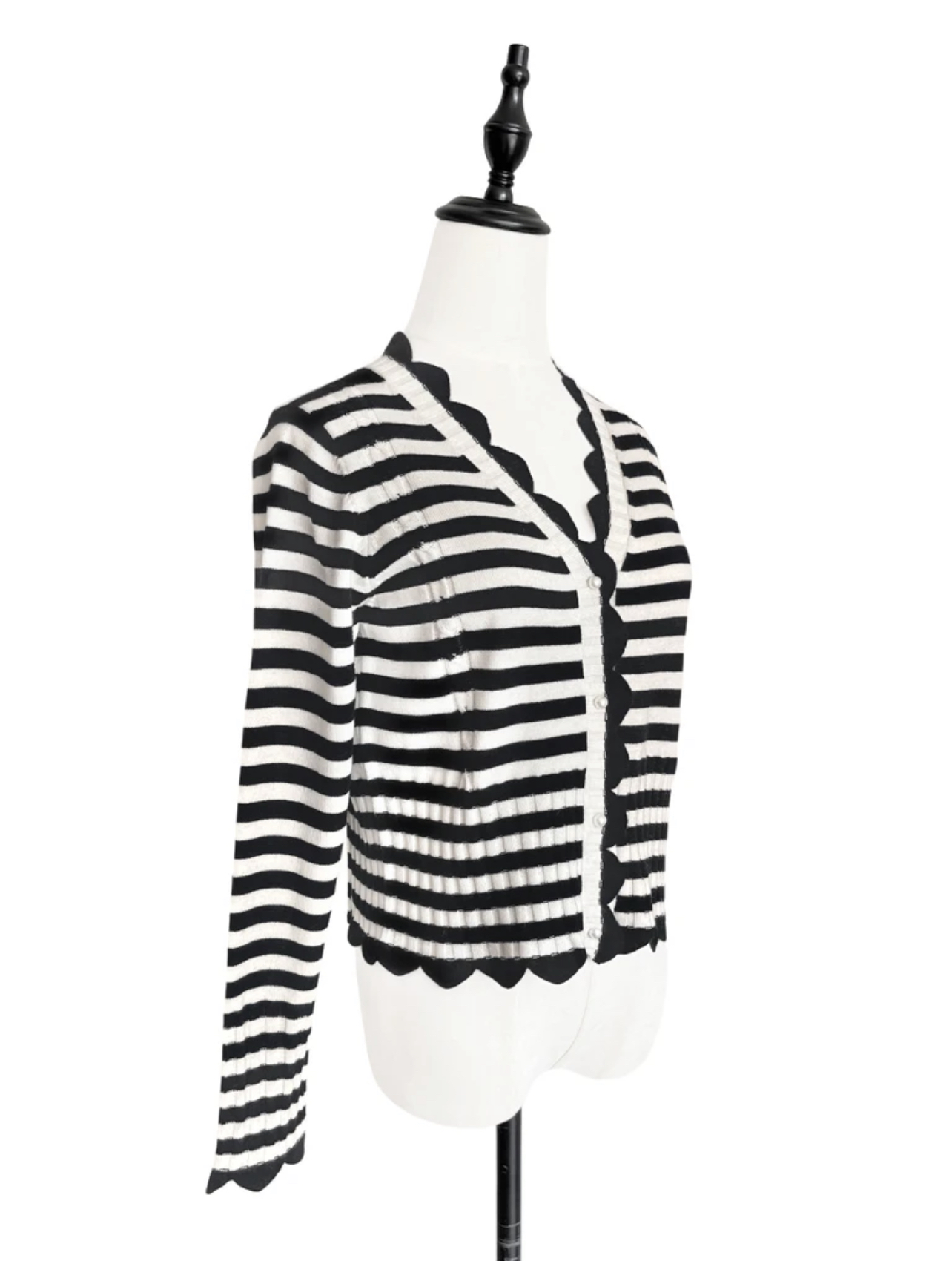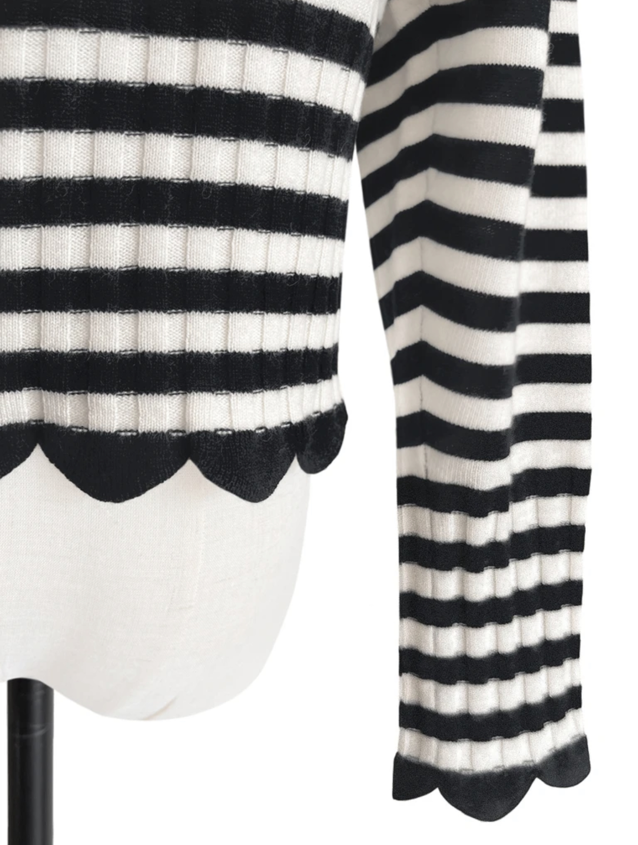TYNVIE 波浪纹饰边羊绒混纺开衫-黑白条纹