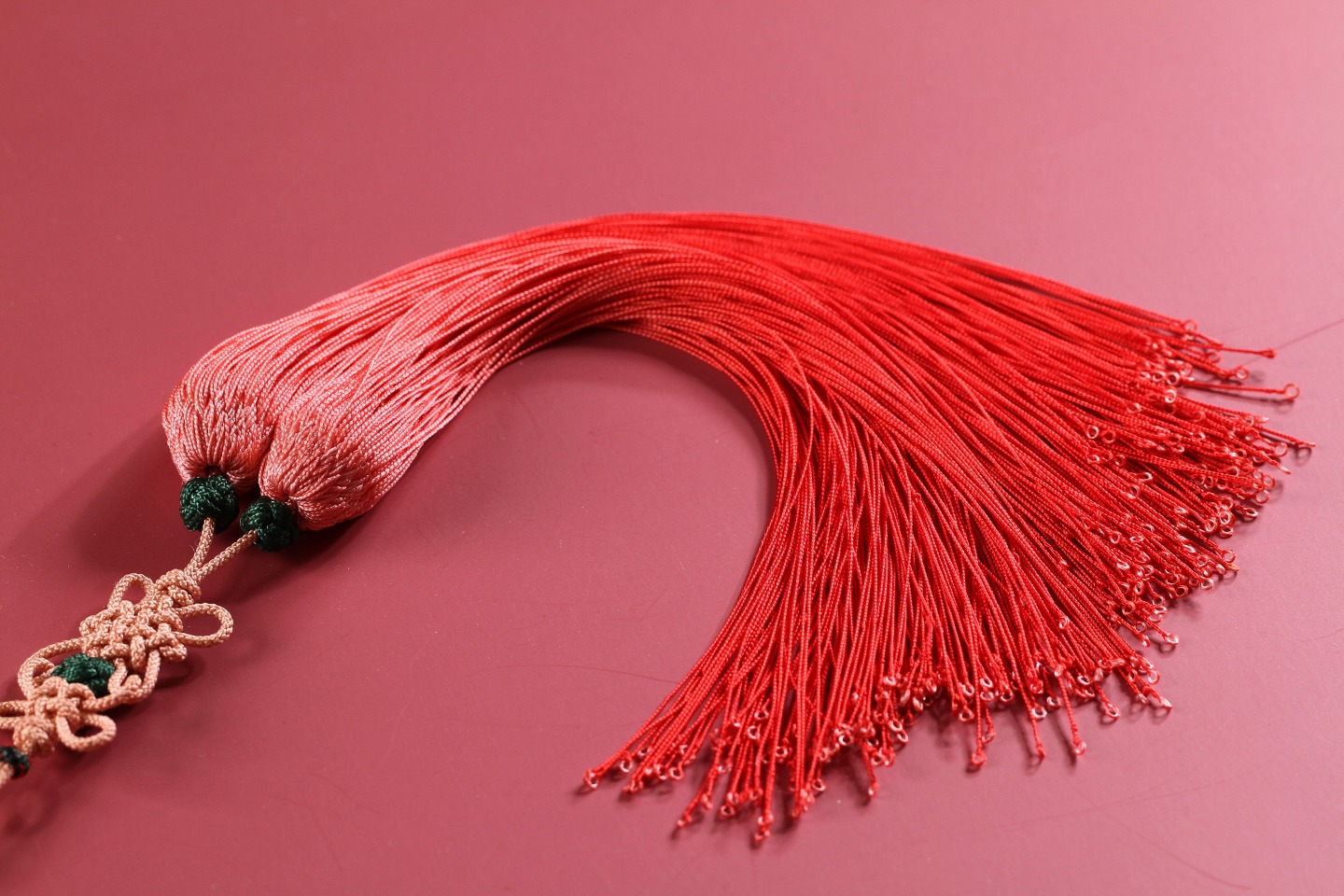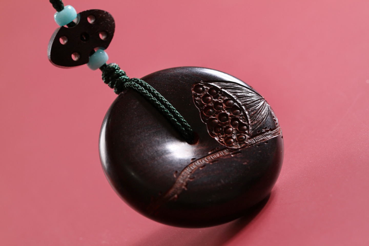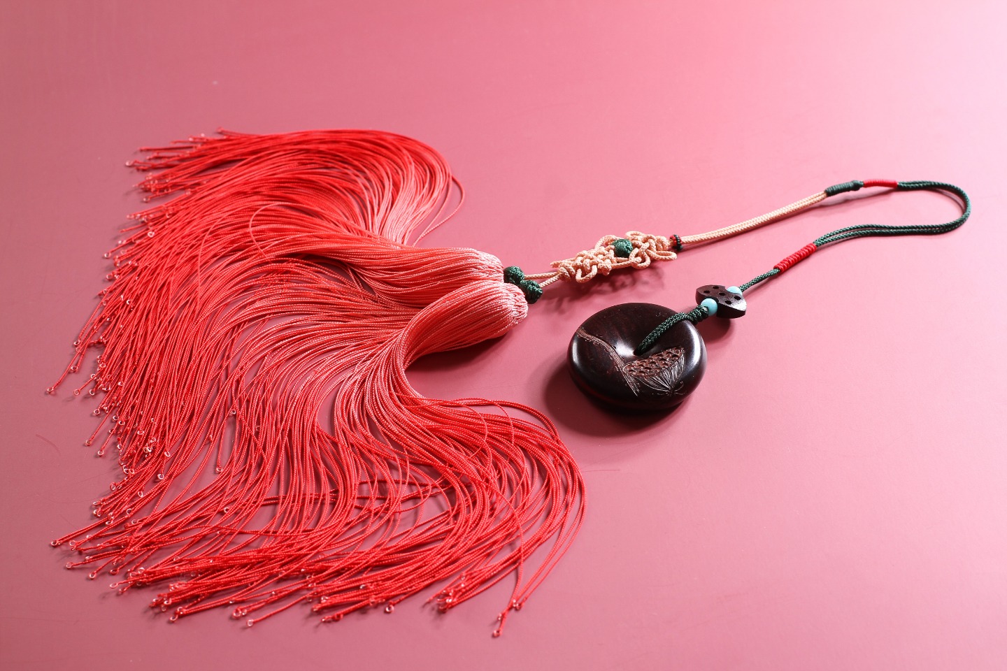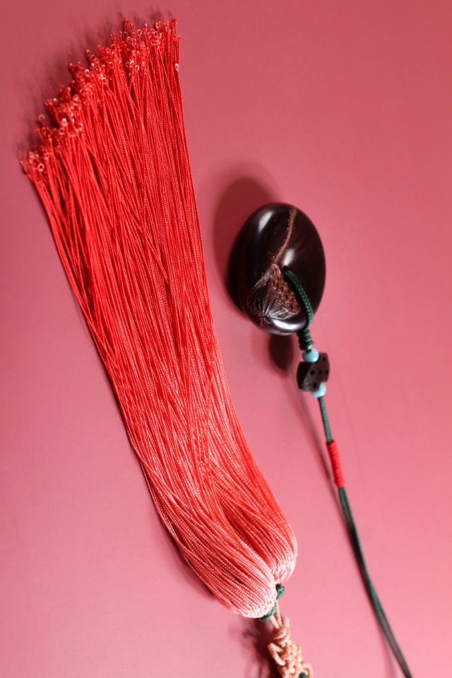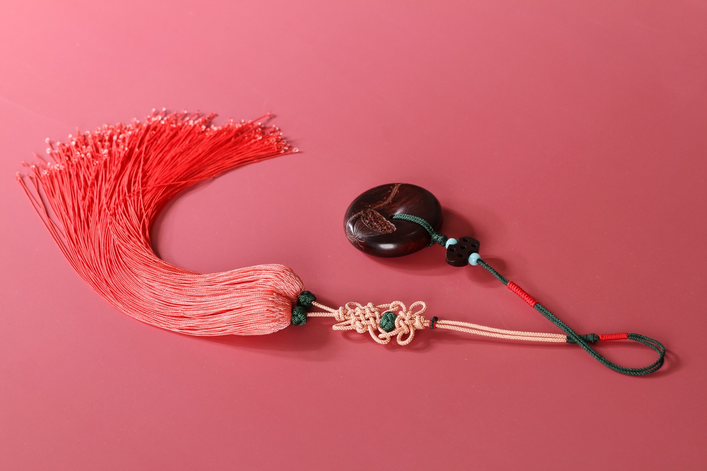 流苏渐变粉红带花结/天河石隔片/紫檀五孔背云/紫檀莲蓬平安扣