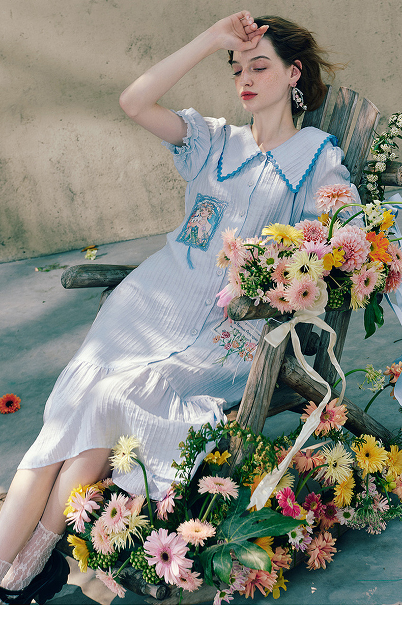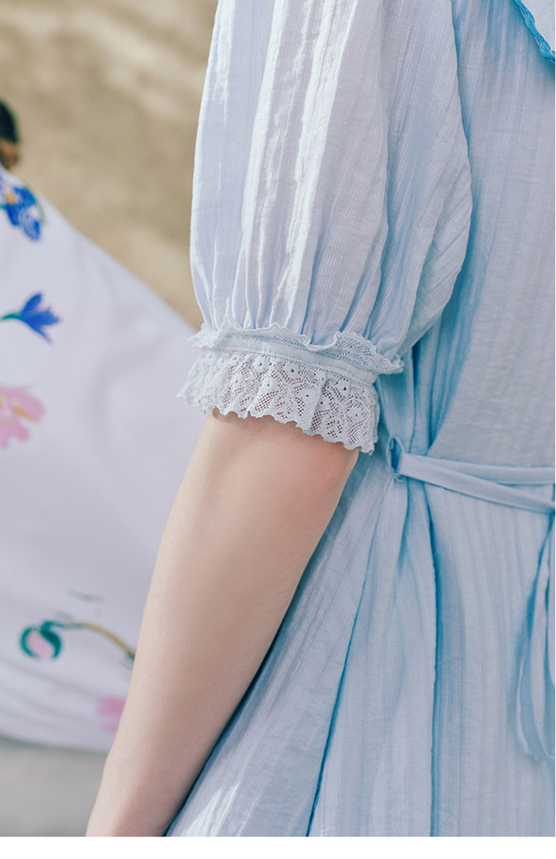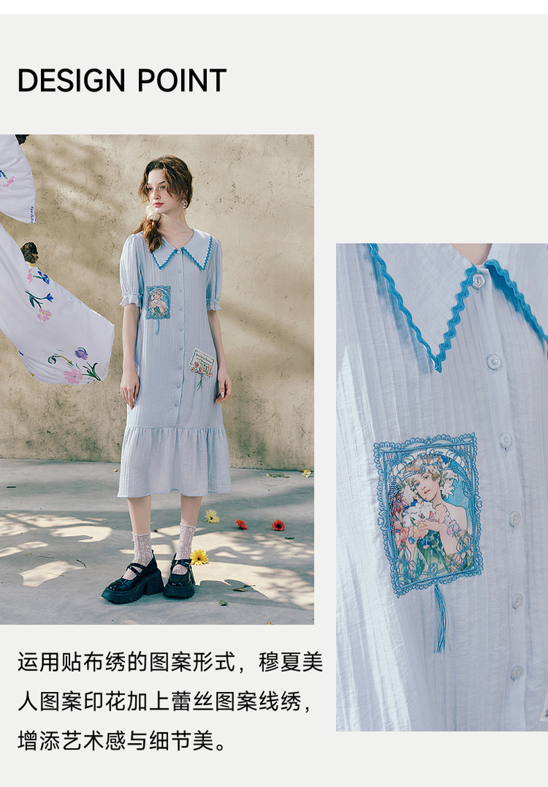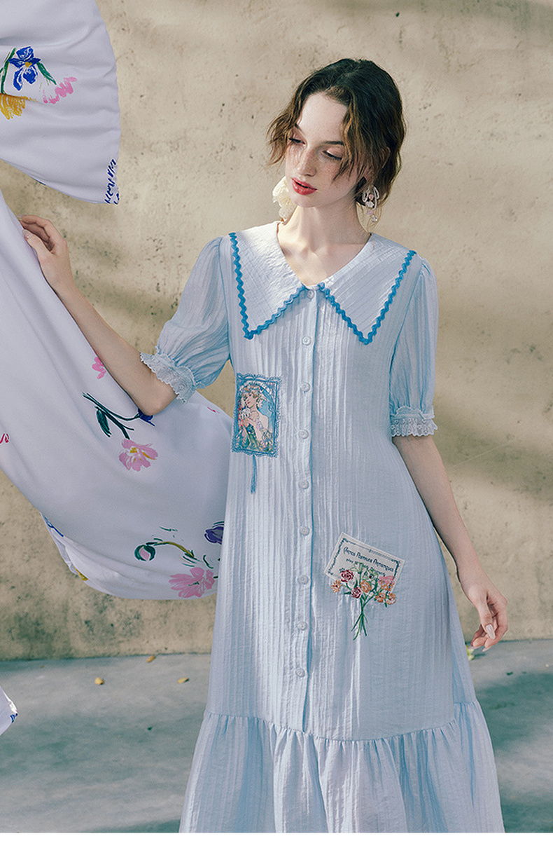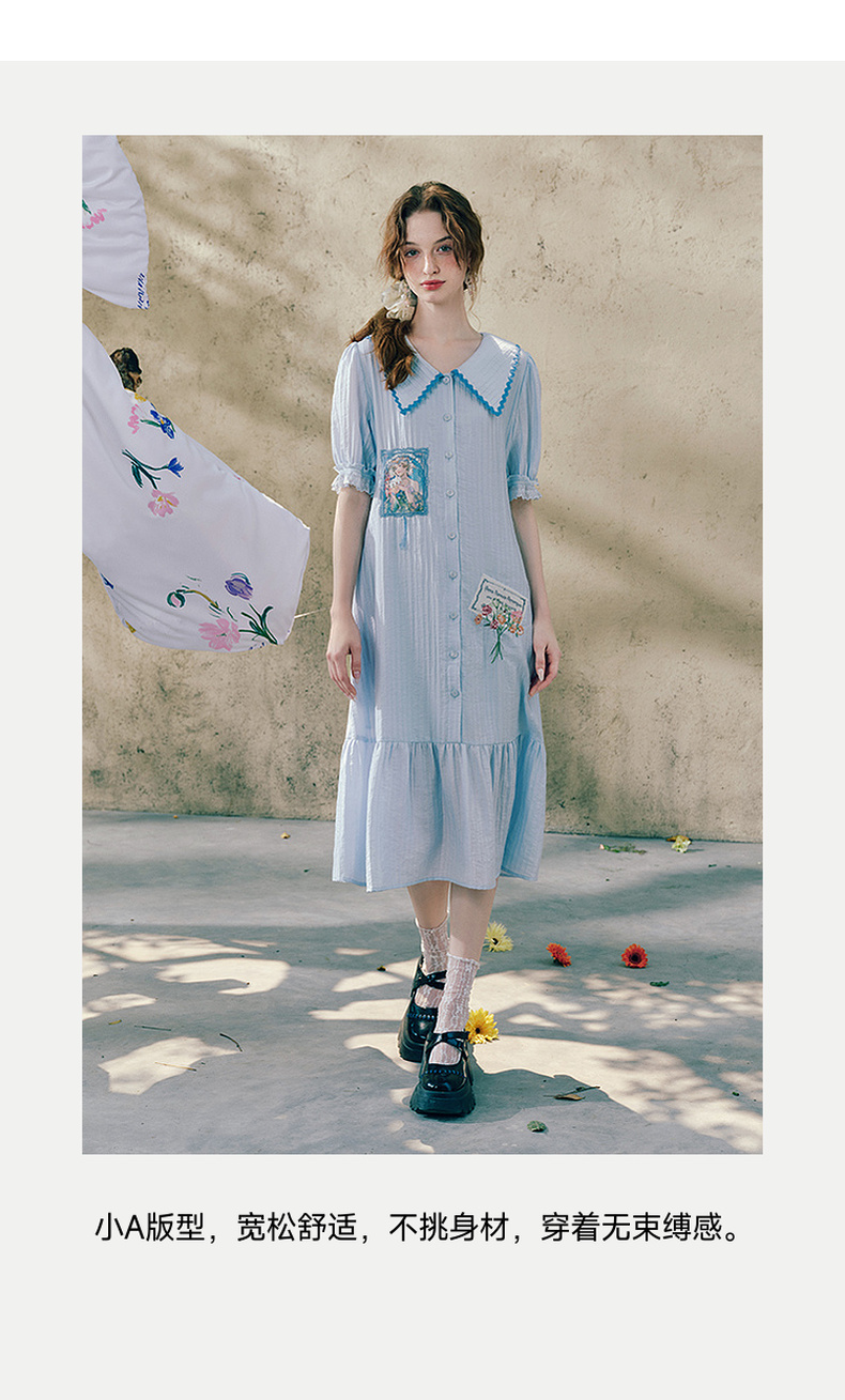 两三事 铃兰晨露 2025夏季新款小清新印花贴布绣大翻领绑带连衣裙