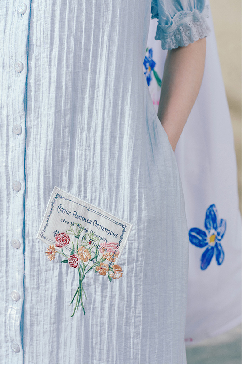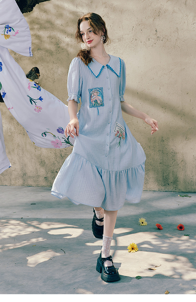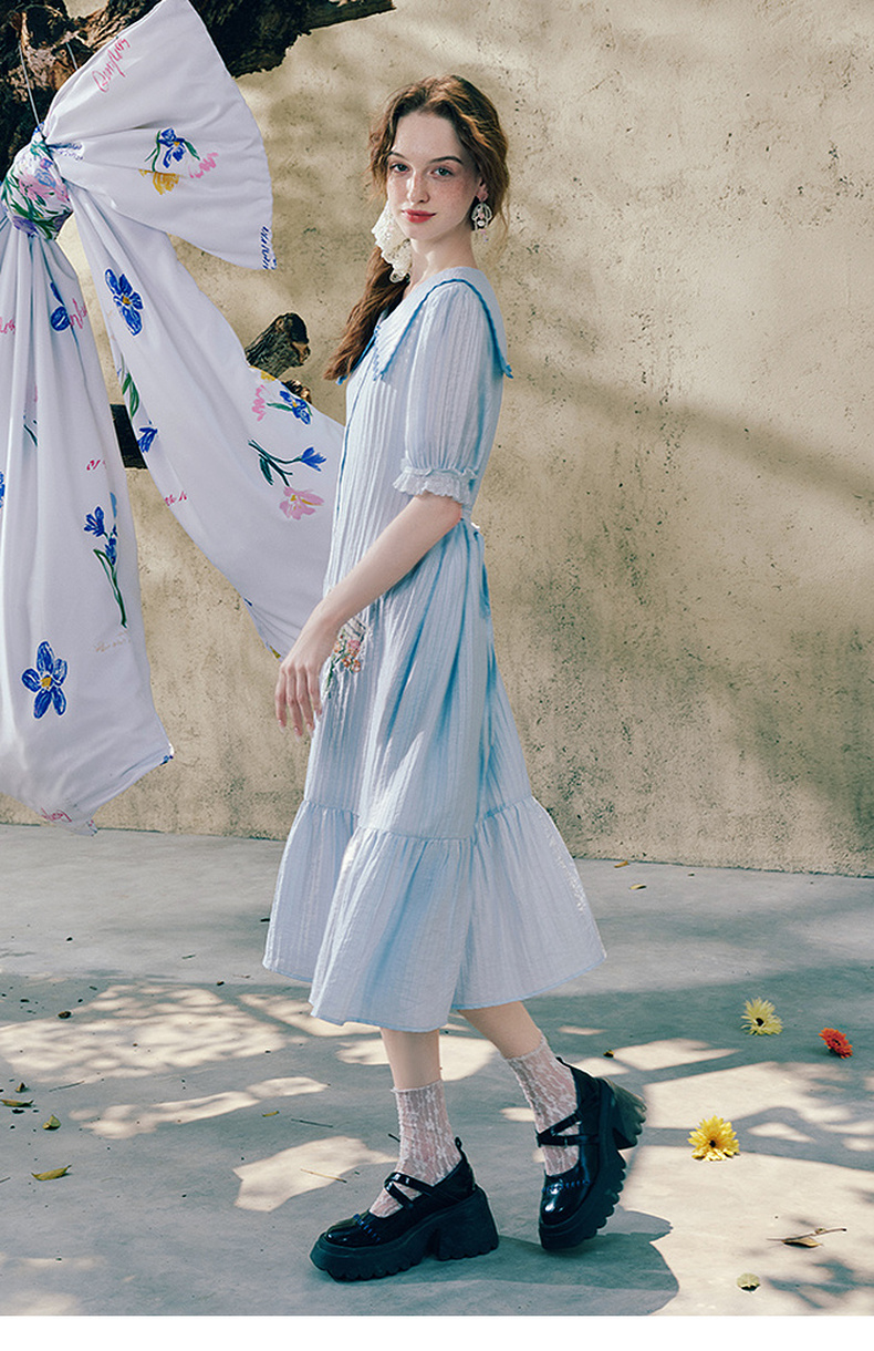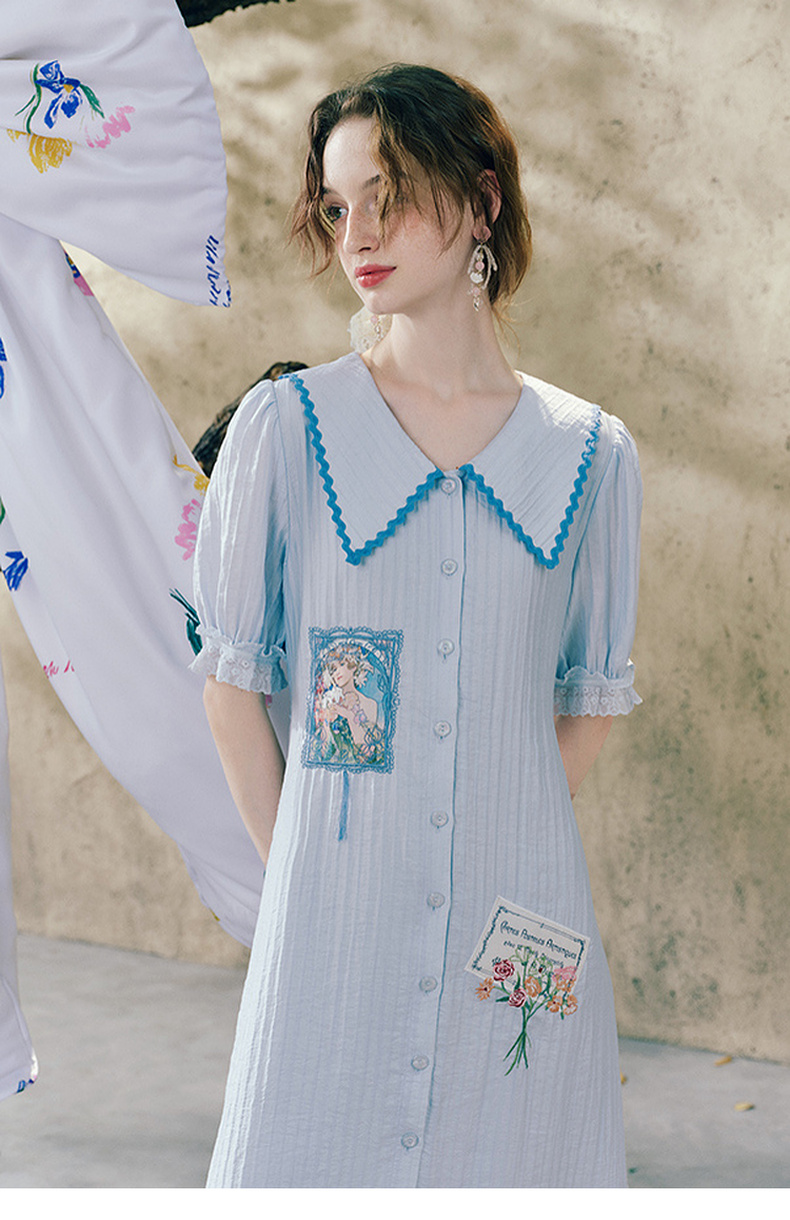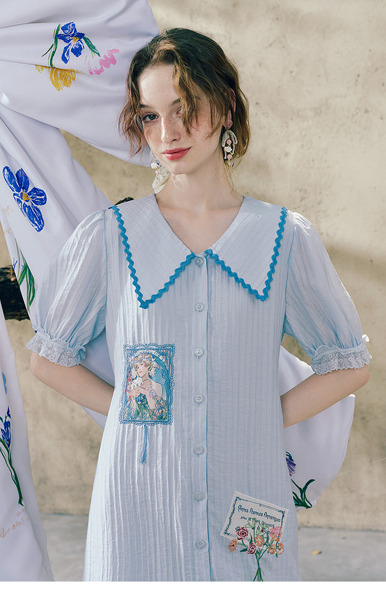 两三事 铃兰晨露 2025夏季新款小清新印花贴布绣大翻领绑带连衣裙