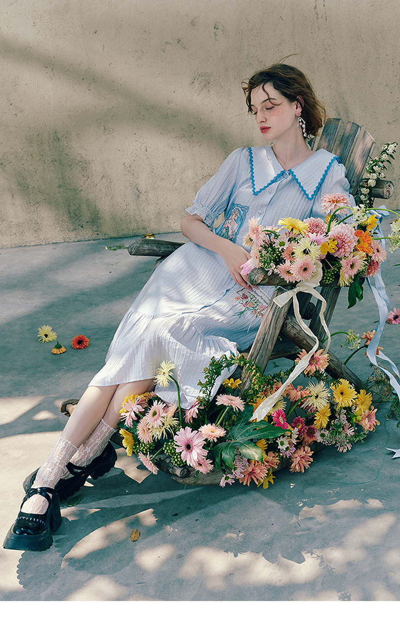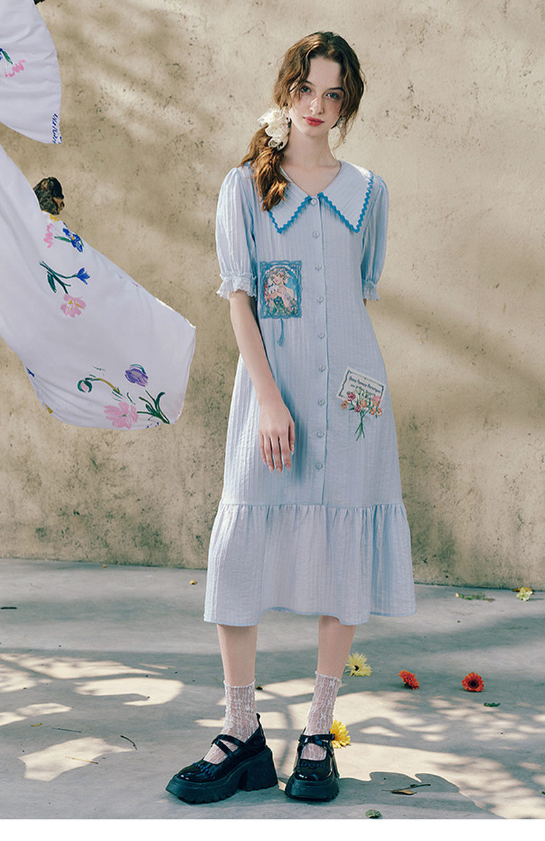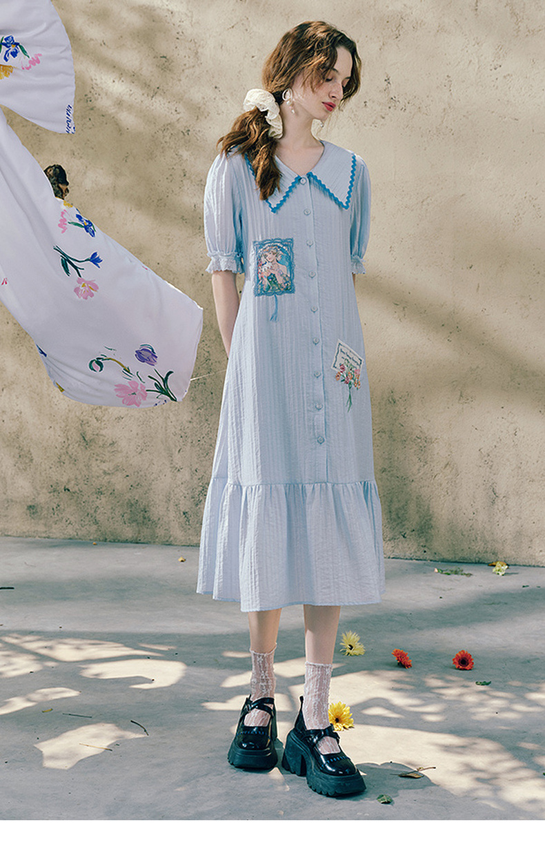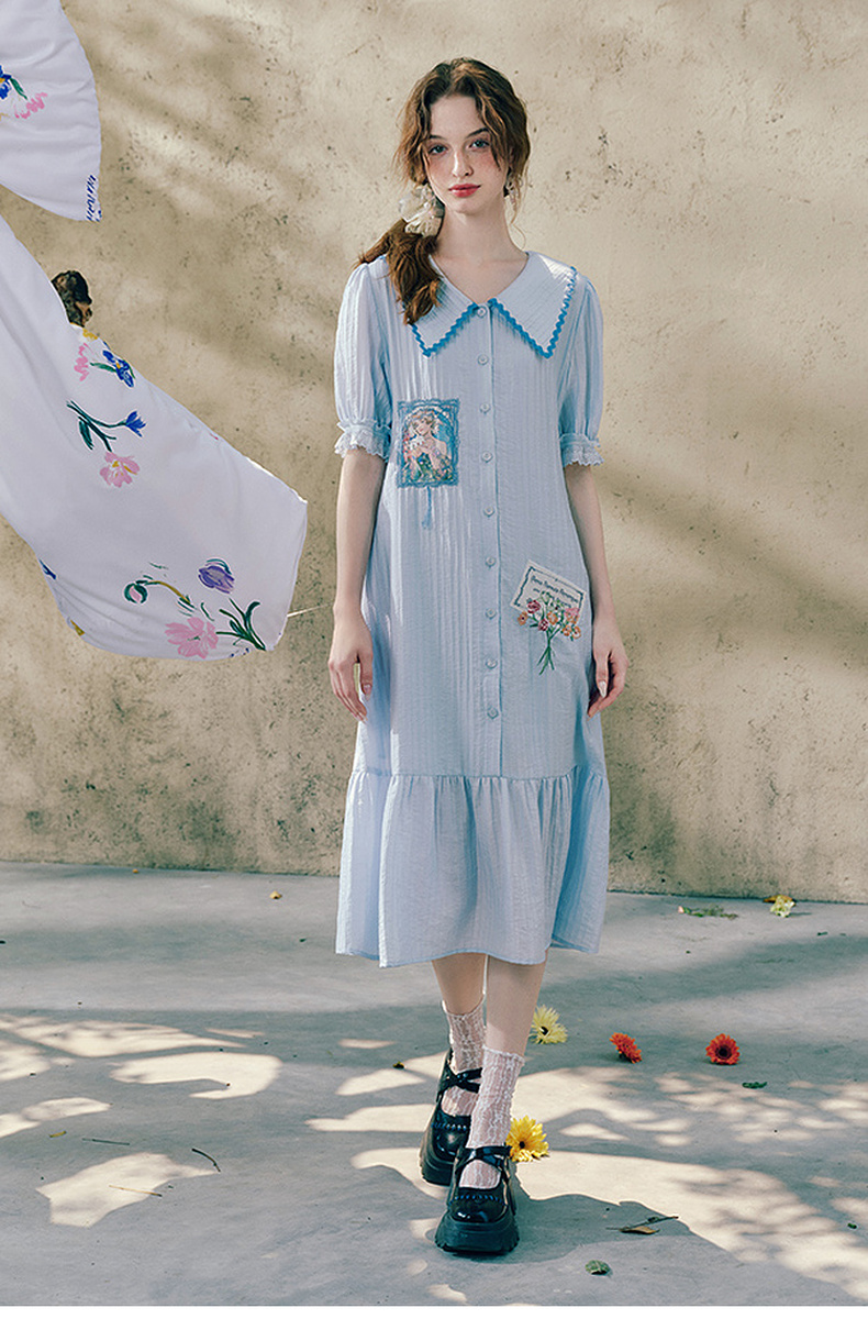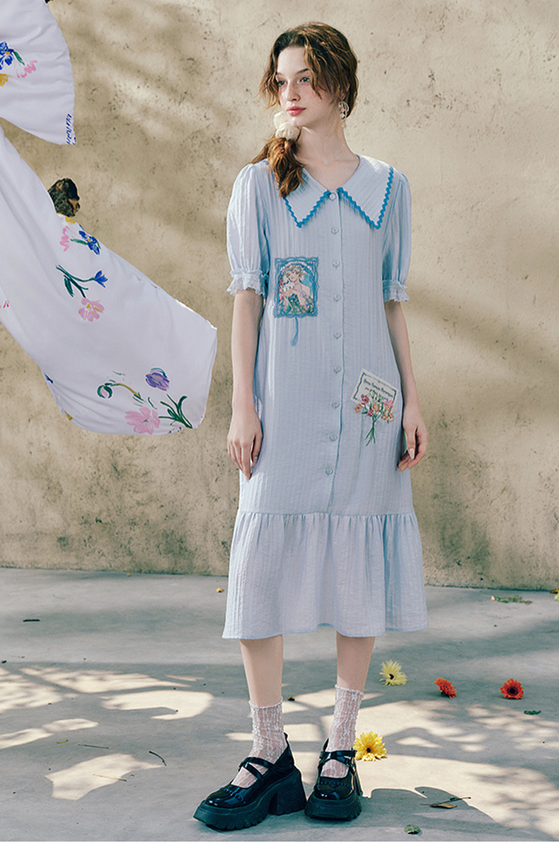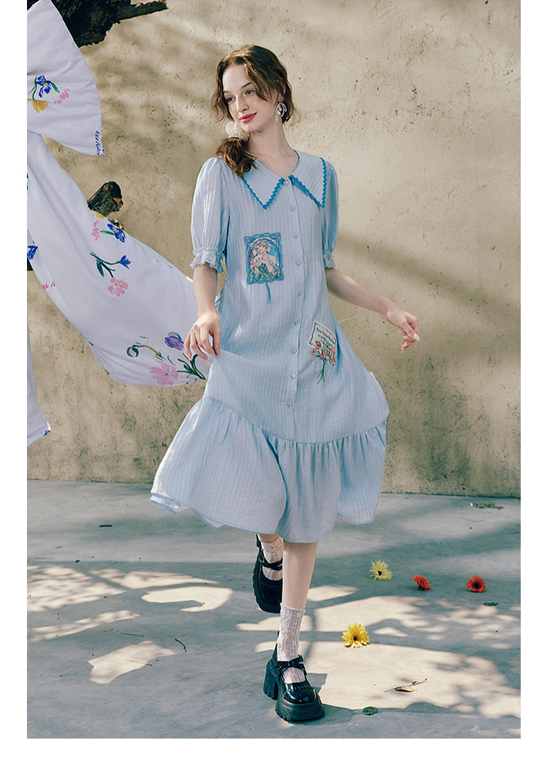 两三事 铃兰晨露 2025夏季新款小清新印花贴布绣大翻领绑带连衣裙