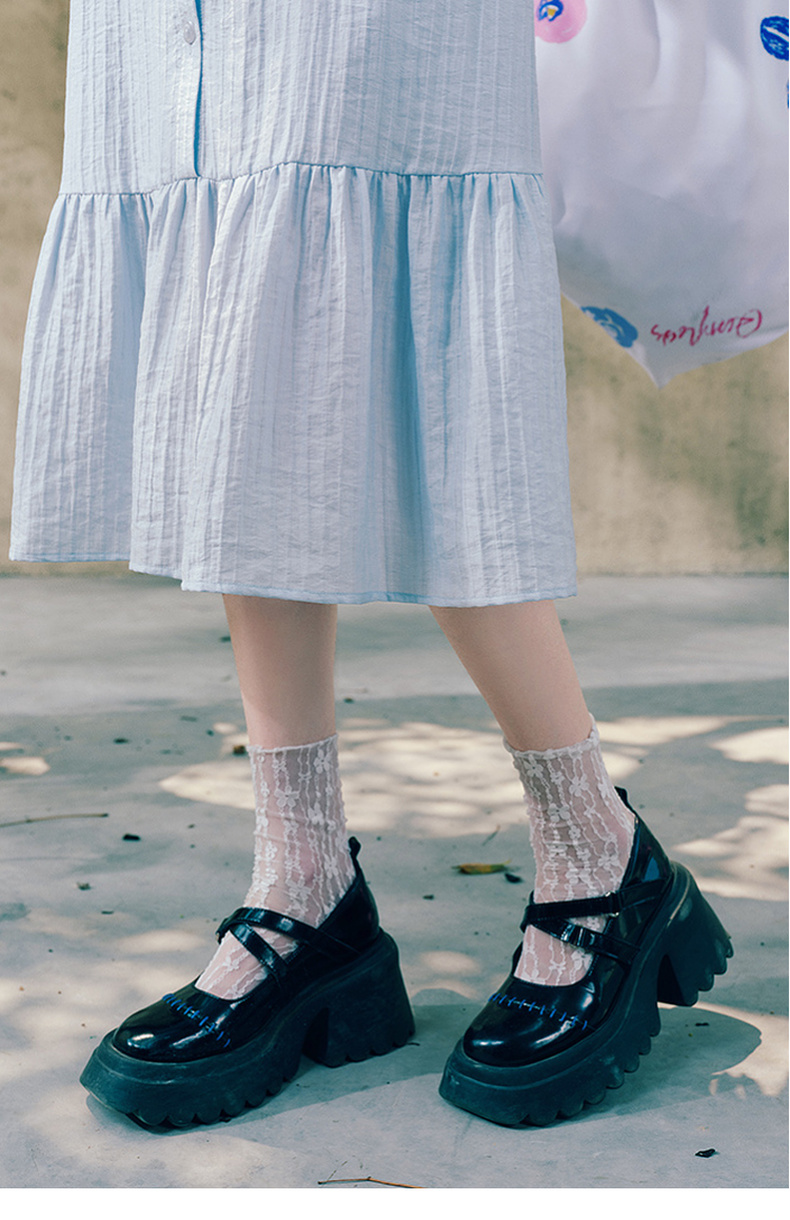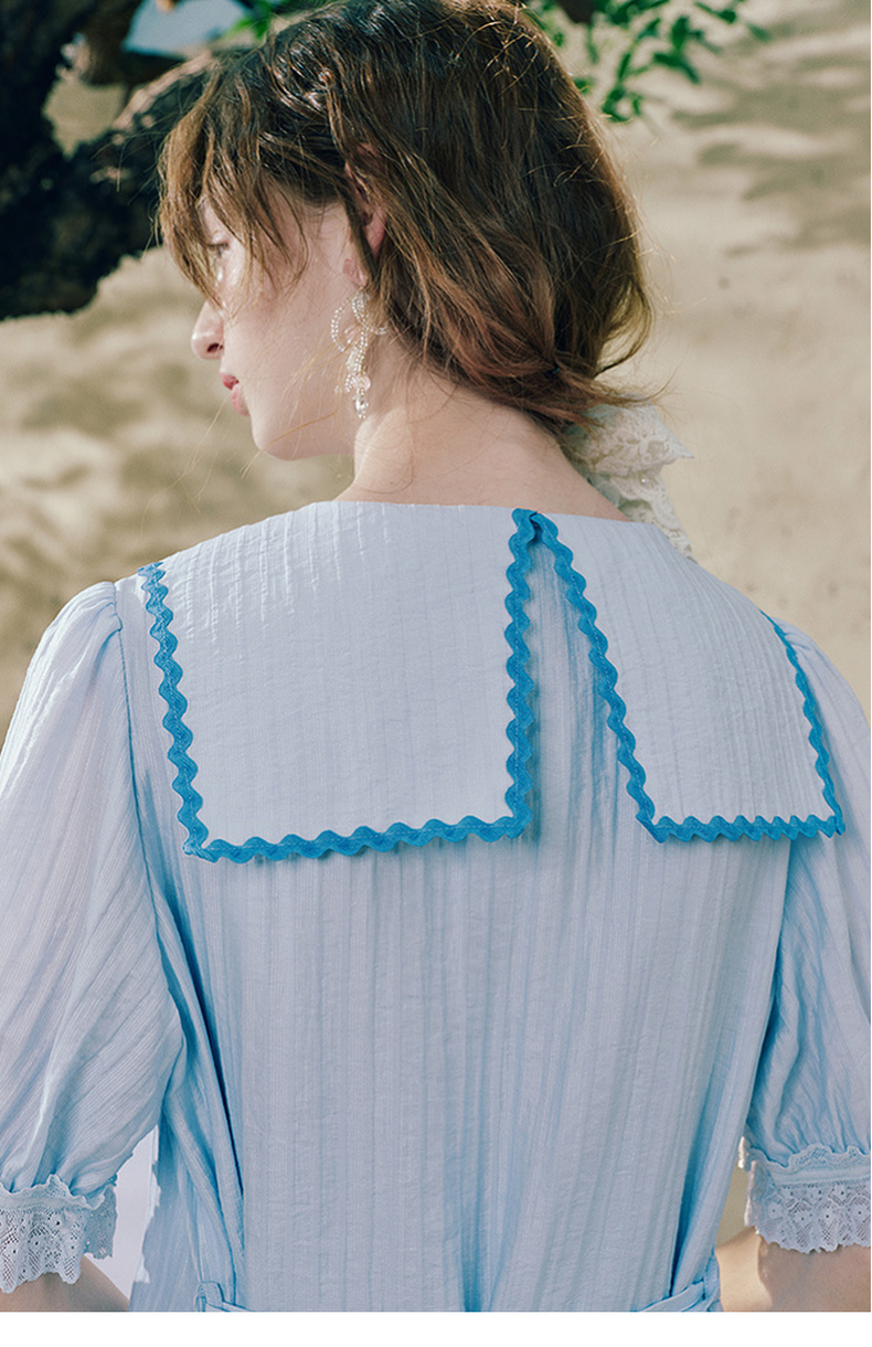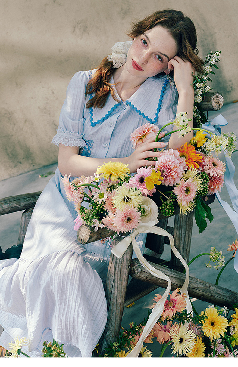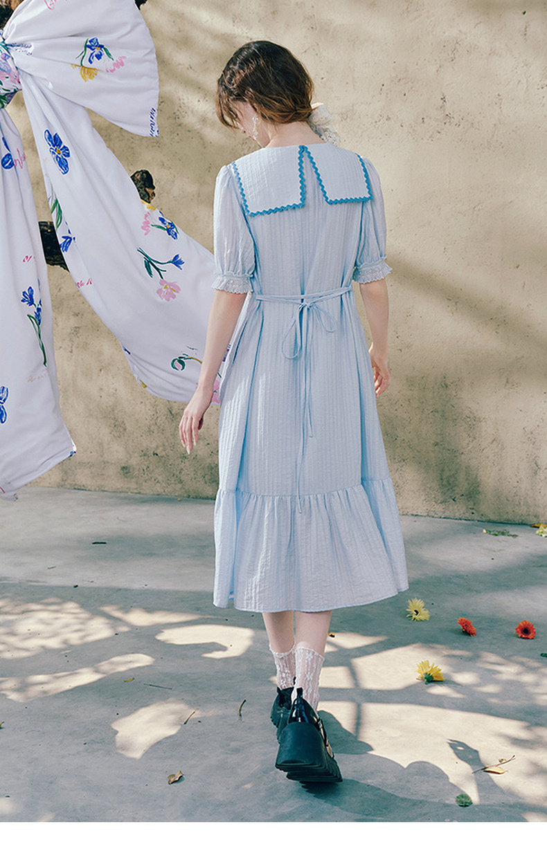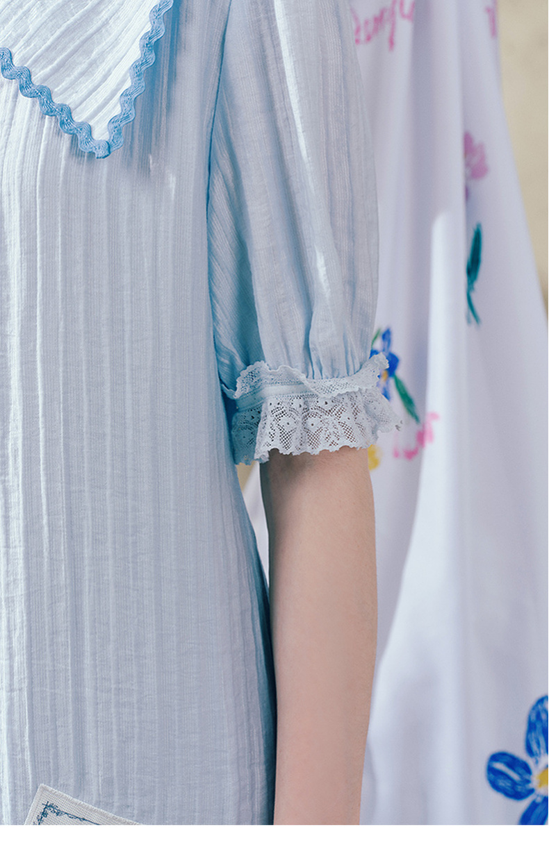 两三事 铃兰晨露 2025夏季新款小清新印花贴布绣大翻领绑带连衣裙