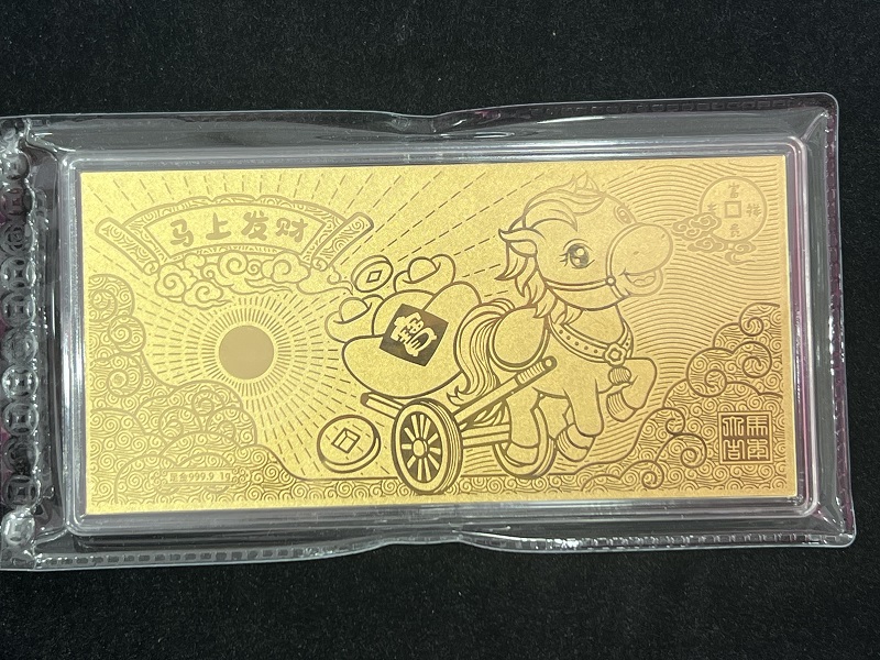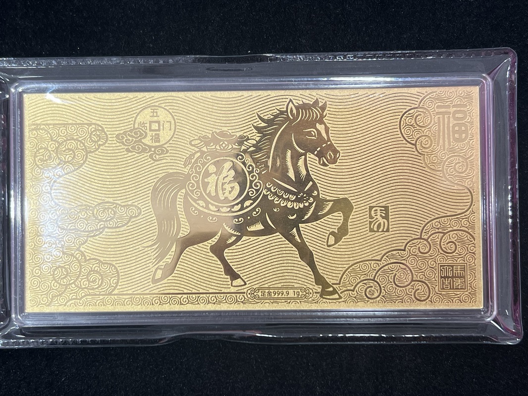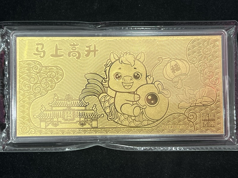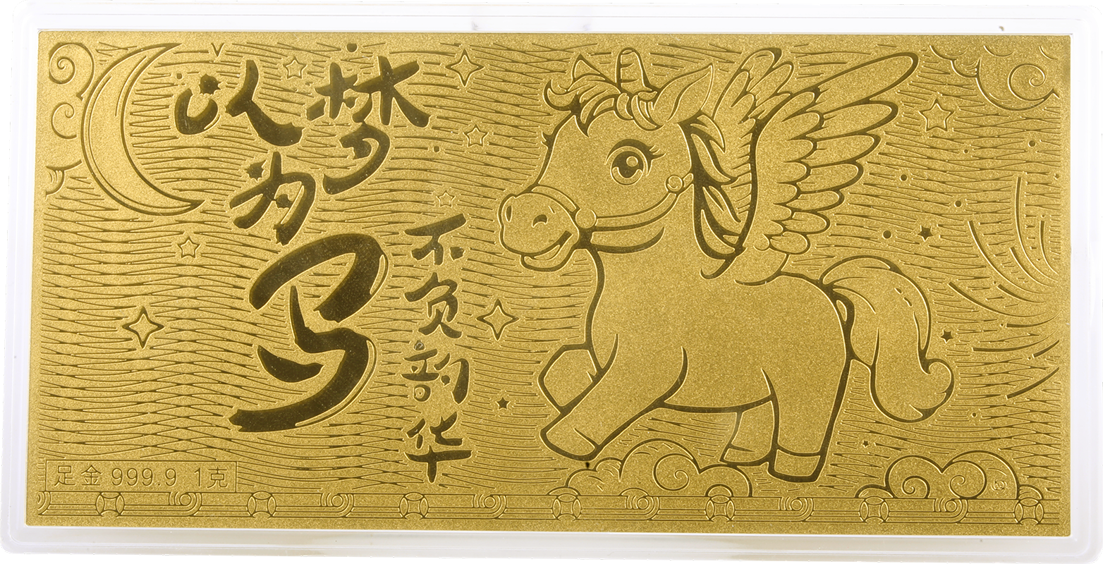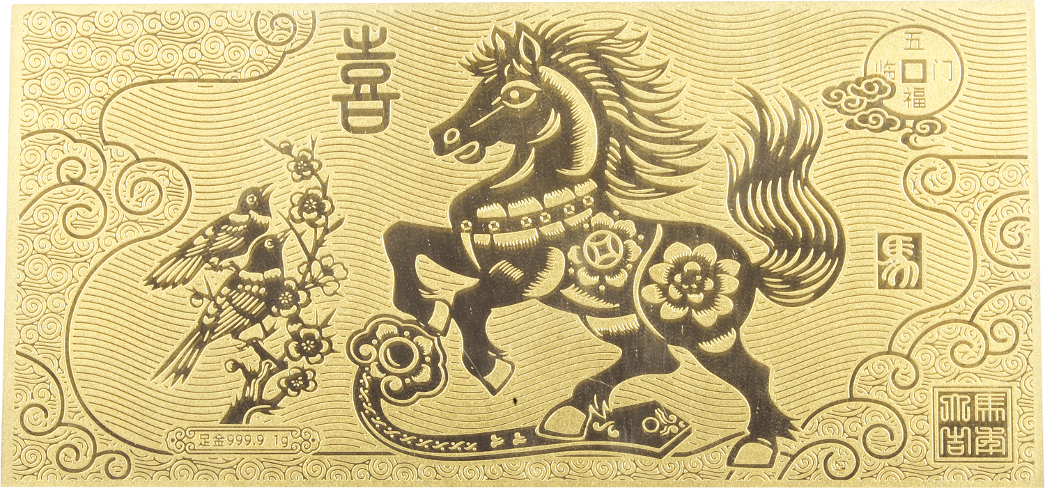 吉祥寓意:马在中国传统文化中象征着奔腾进取、马到成功。这枚金钞将生肖文化与黄金结合,寓意着新的一年事业腾飞、万事顺遂。