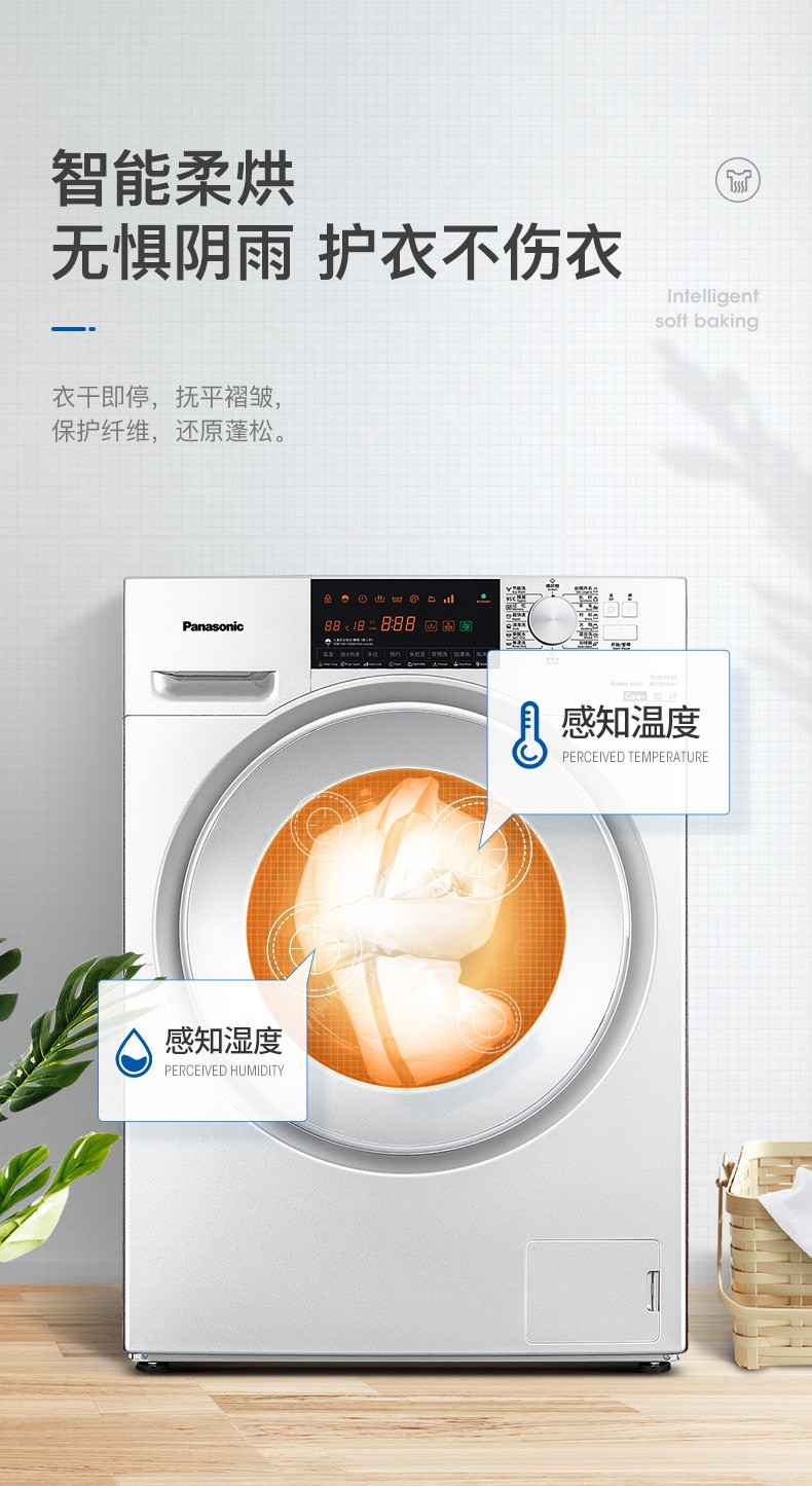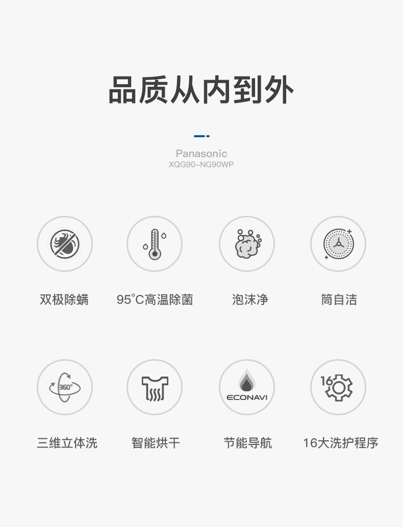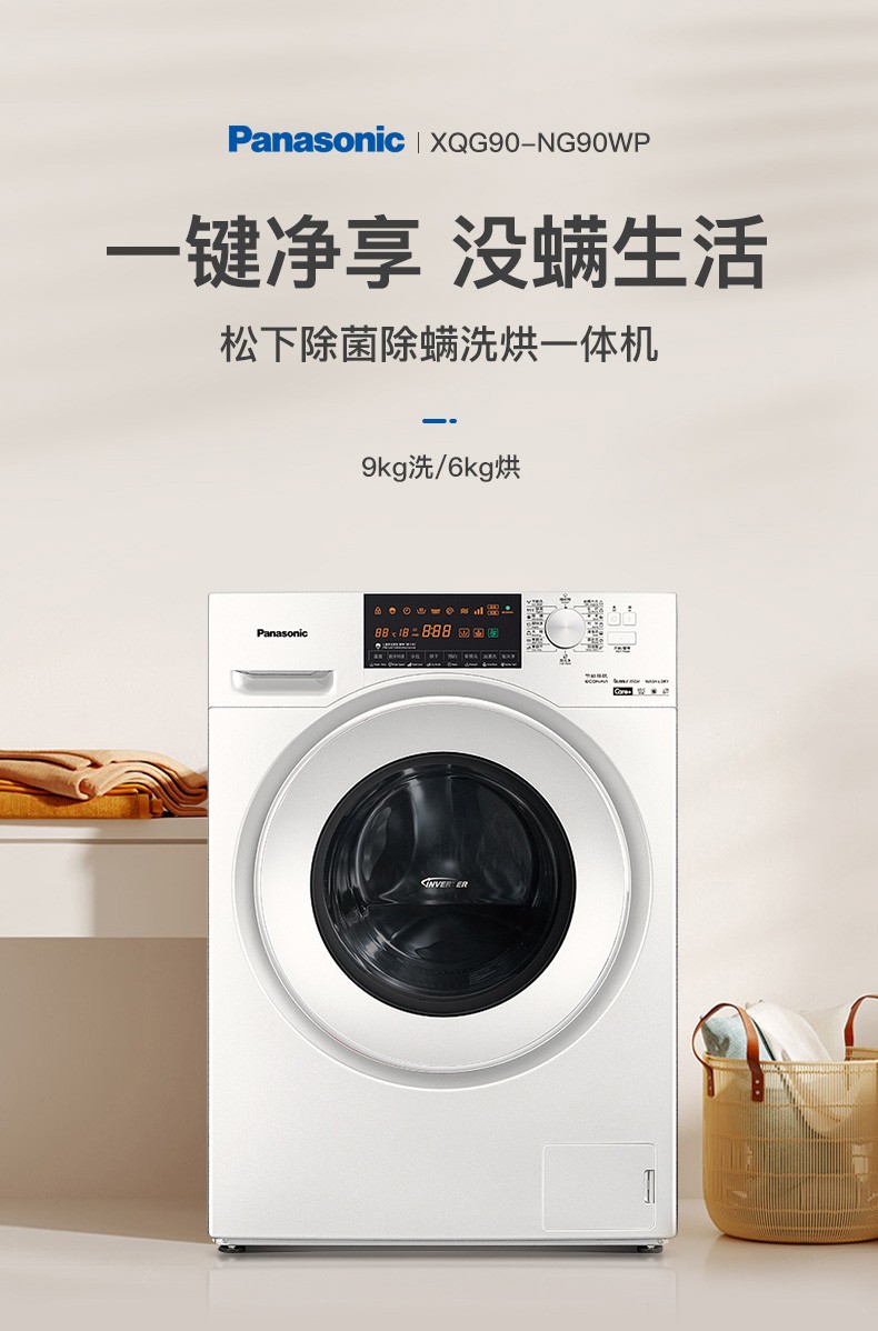 松下(Panasonic)洗烘一体9公斤除菌除螨烘干全自动变频滚筒洗衣干衣机XQG90-NG90WP 白色