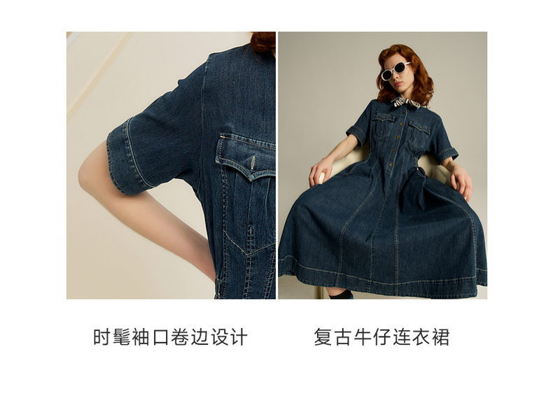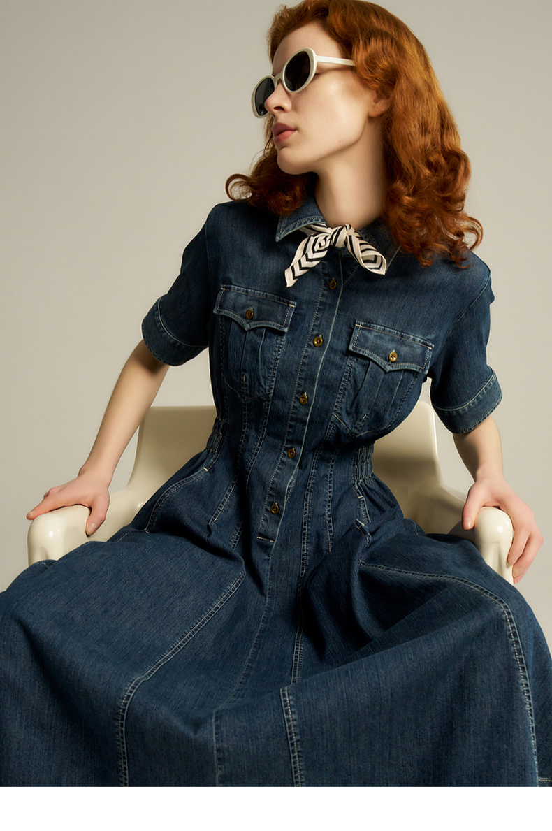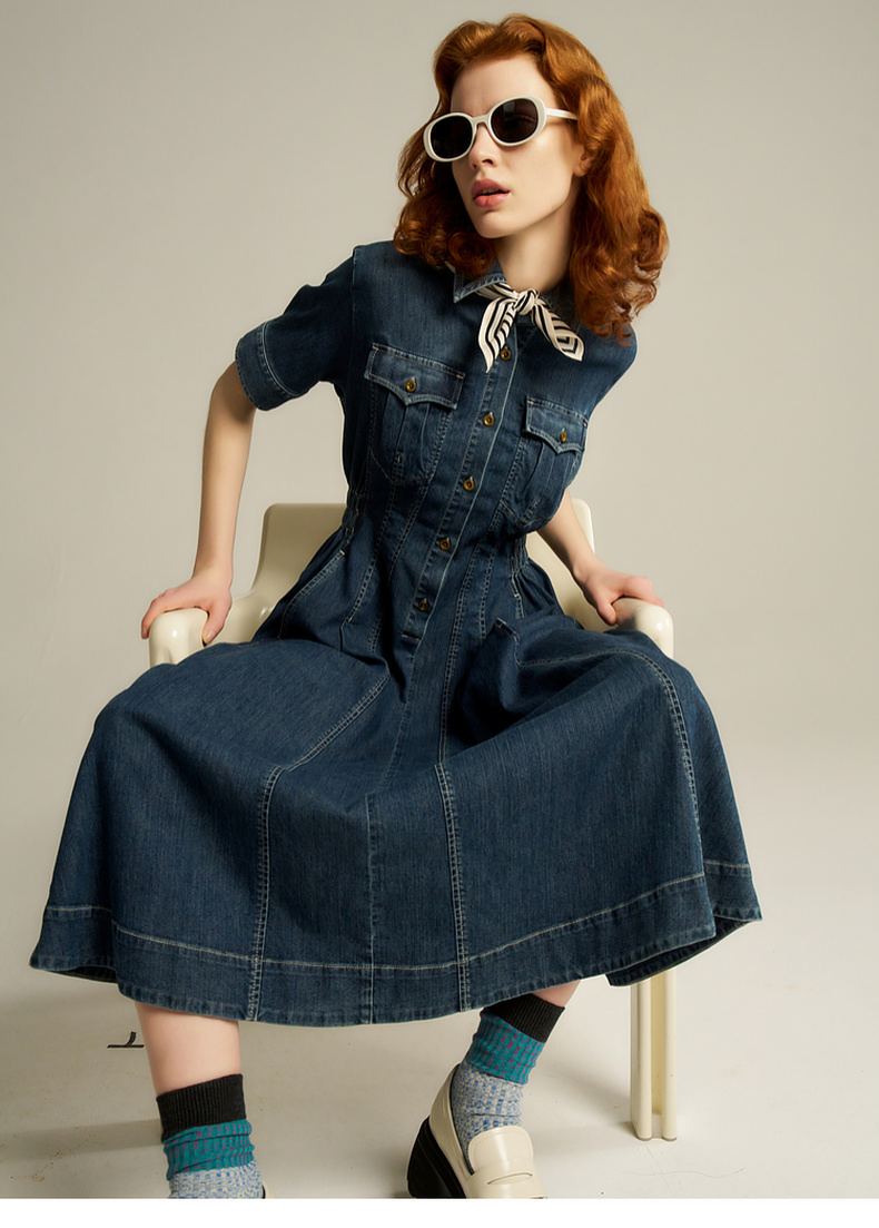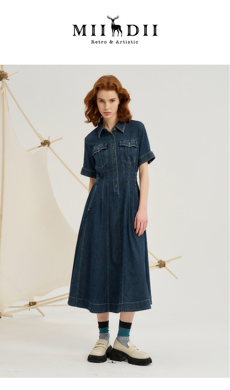 谜底牛仔连衣裙女2024秋季新品复古文艺收腰大摆中长裙243ML1027