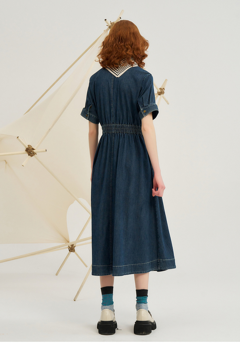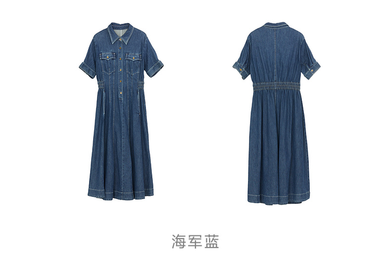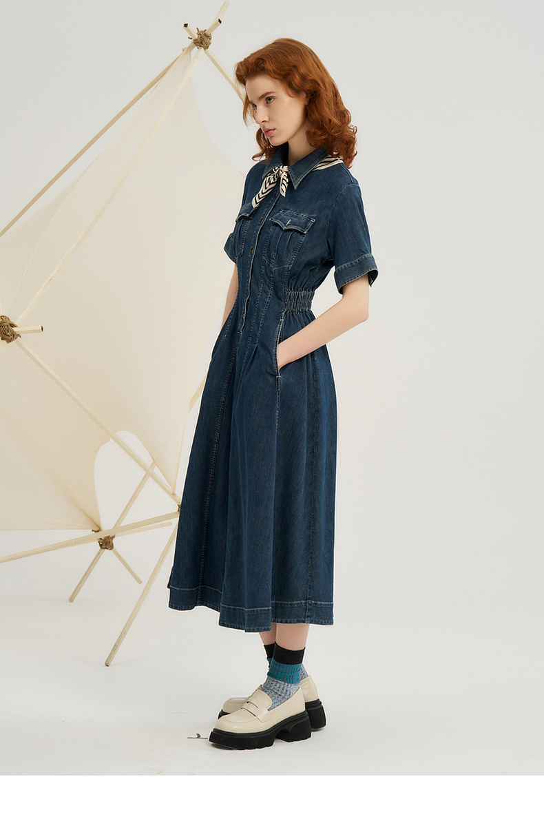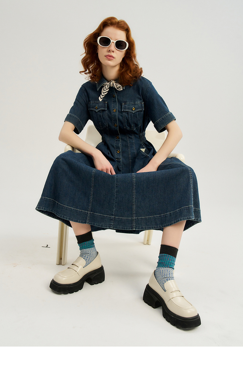 谜底牛仔连衣裙女2024秋季新品复古文艺收腰大摆中长裙243ML1027