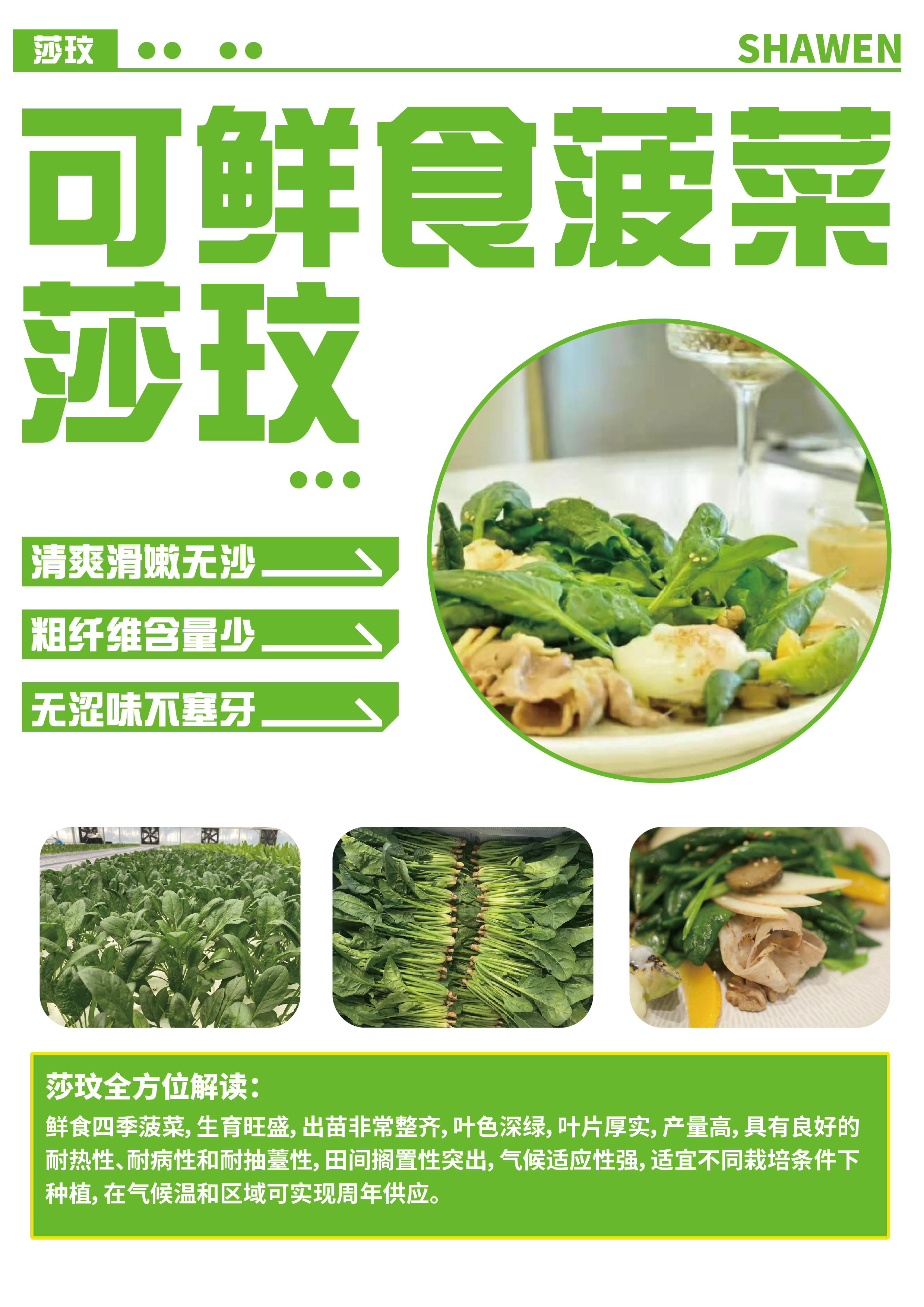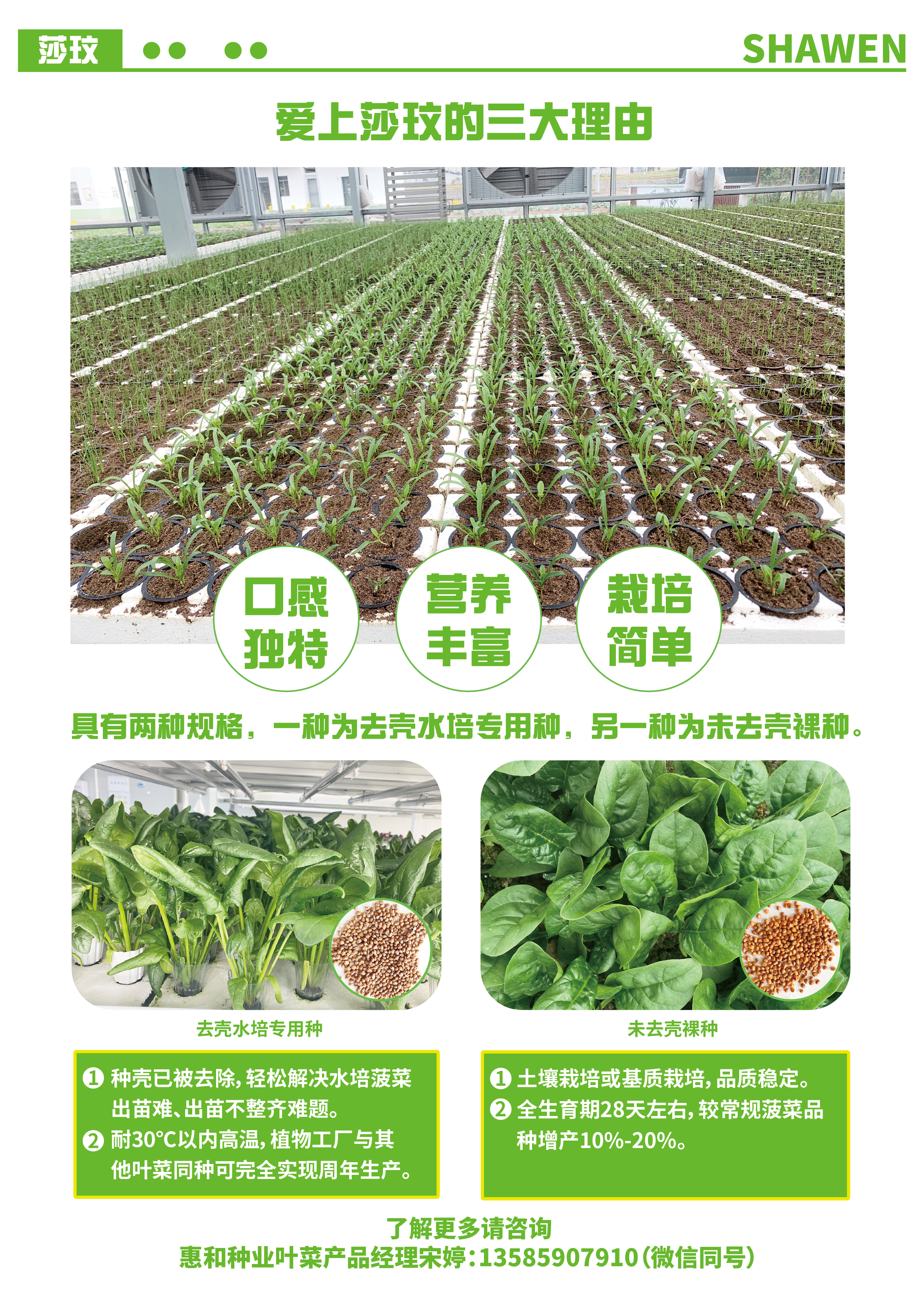 水培专用去壳菠菜品种。生育旺盛,生长速度快,叶色深绿,株型小,良好的耐热性,具有一定的耐抽苔性。对霜霉病具有很好的耐病性,气候适应性强,适宜不同栽培条件下种植。