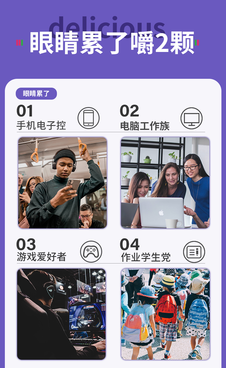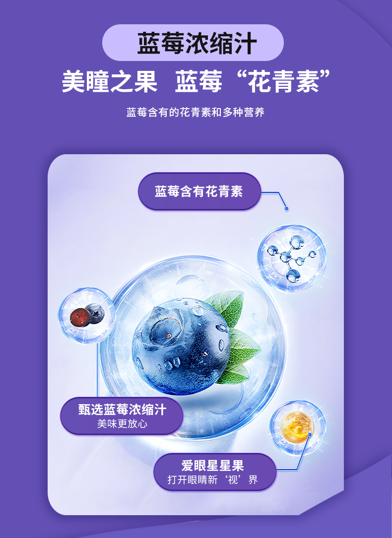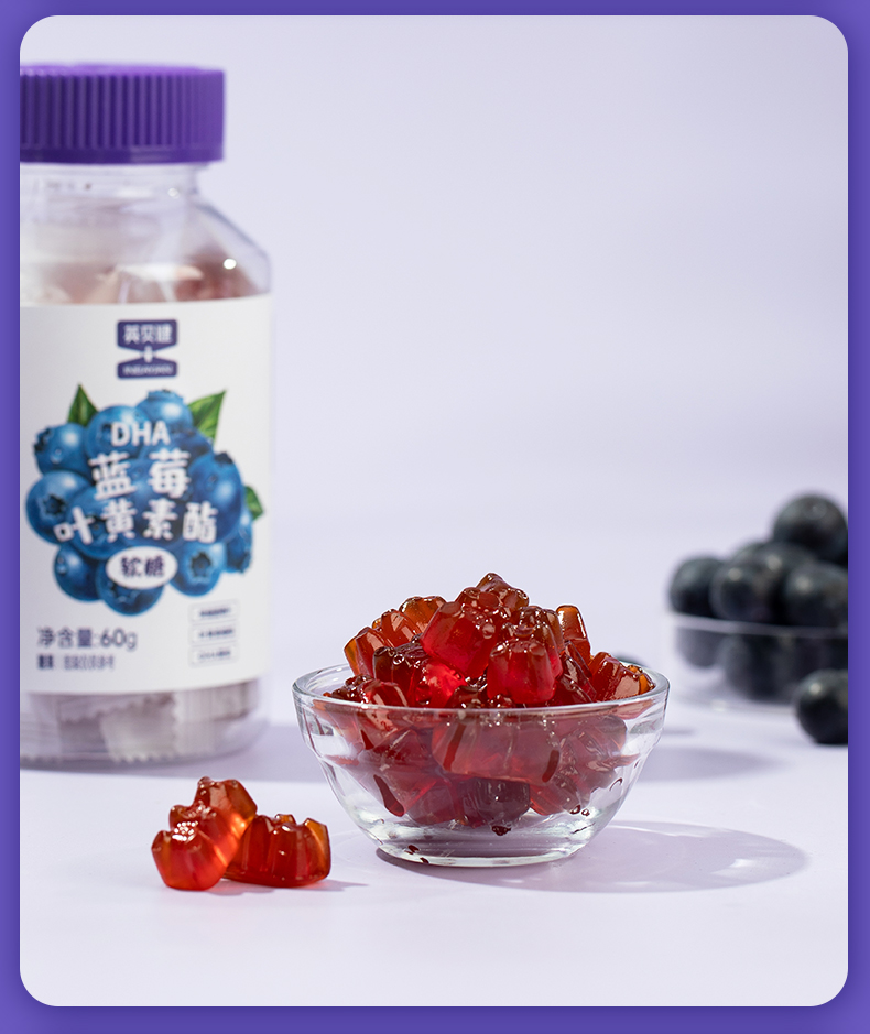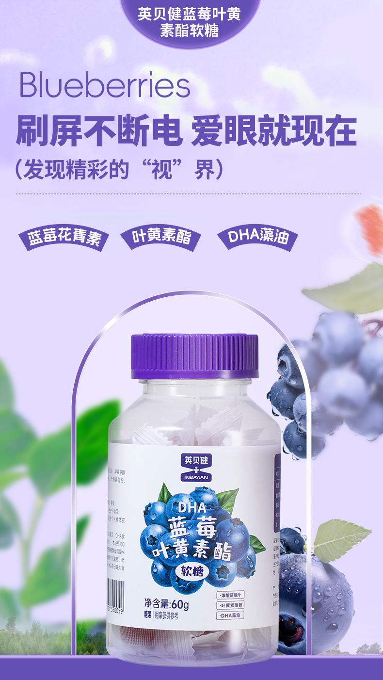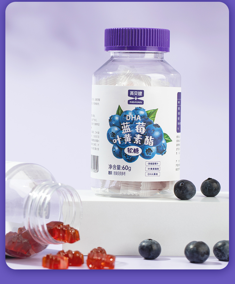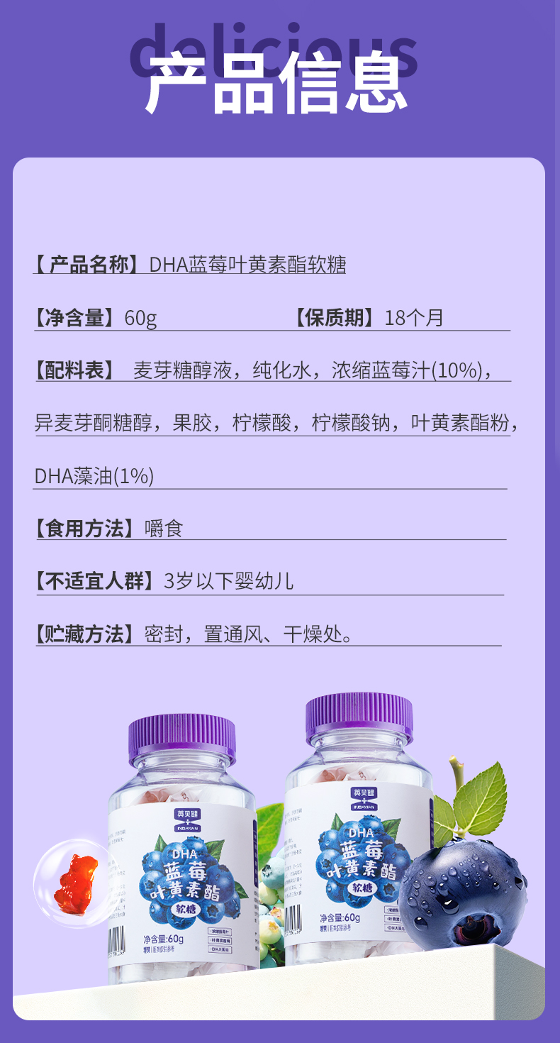 英贝健DHA蓝莓叶黄素酯软糖:麦芽糖醇液,纯化水,浓缩蓝莓汁(10%),异麦芽酮糖醇,果胶,柠檬酸,柠檬酸钠,叶黄素酯粉,DHA藻油(1%)