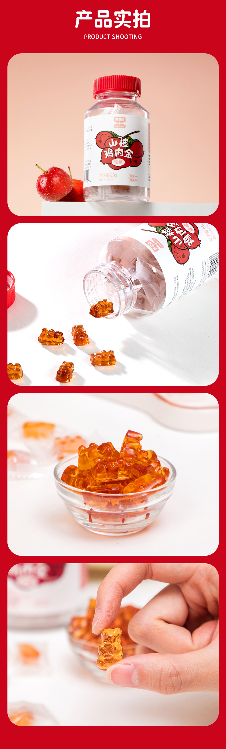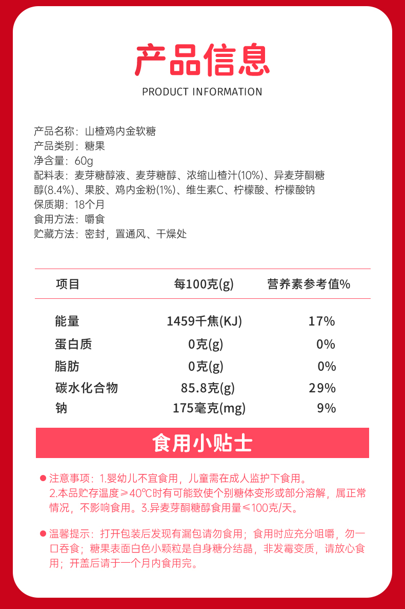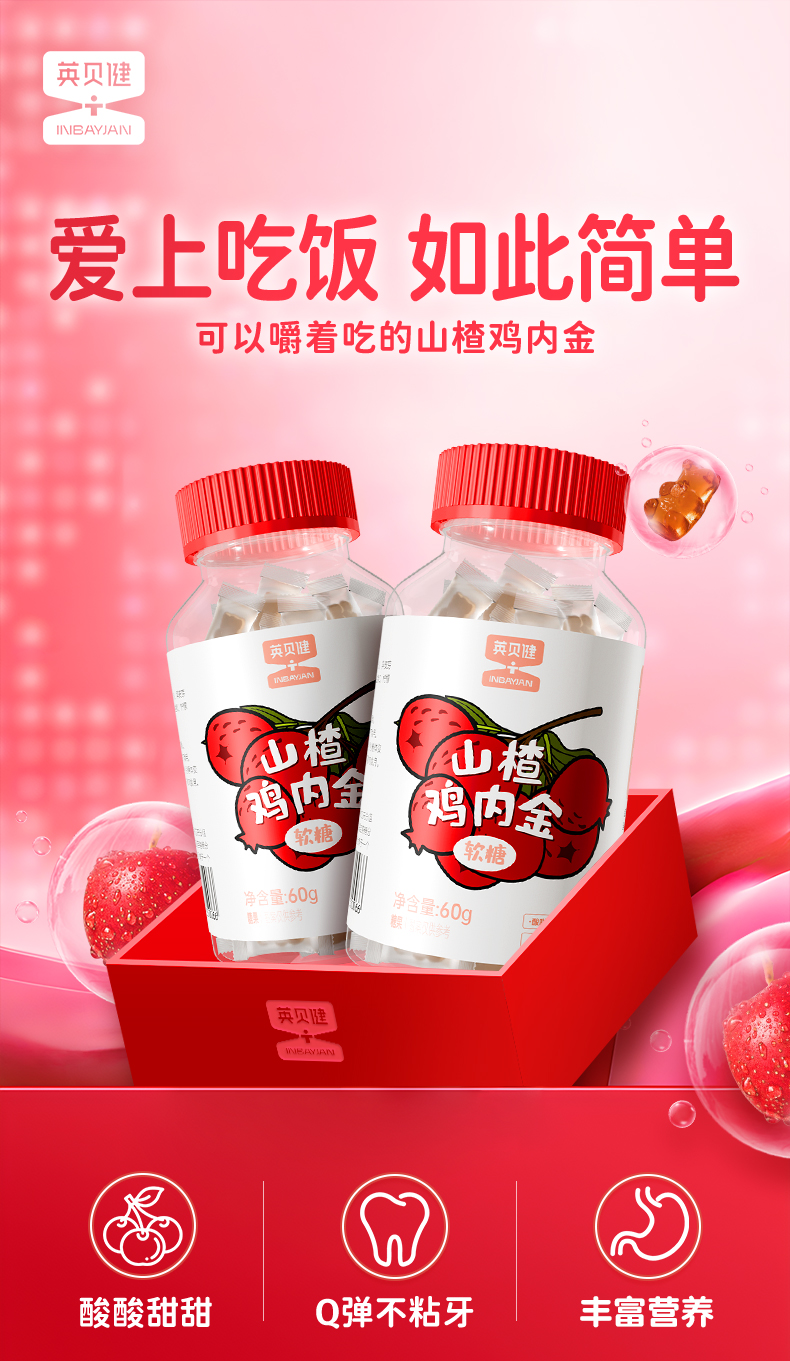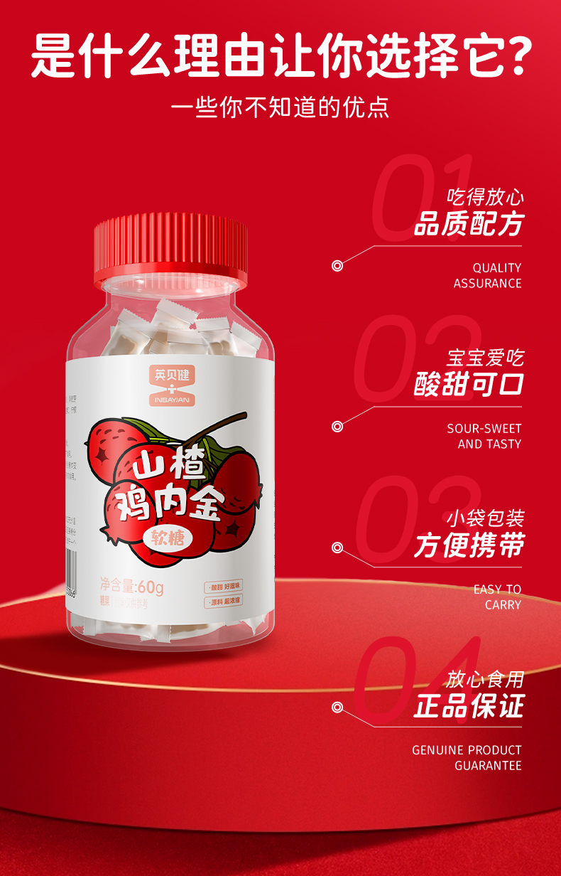 英贝健山楂鸡内金软糖:麦芽糖醇液、麦芽糖醇、浓缩山楂汁(10%)、异麦芽酮糖醇(8.4%)、果胶、鸡内金粉(1%)、维生素C、柠檬酸、柠檬酸钠