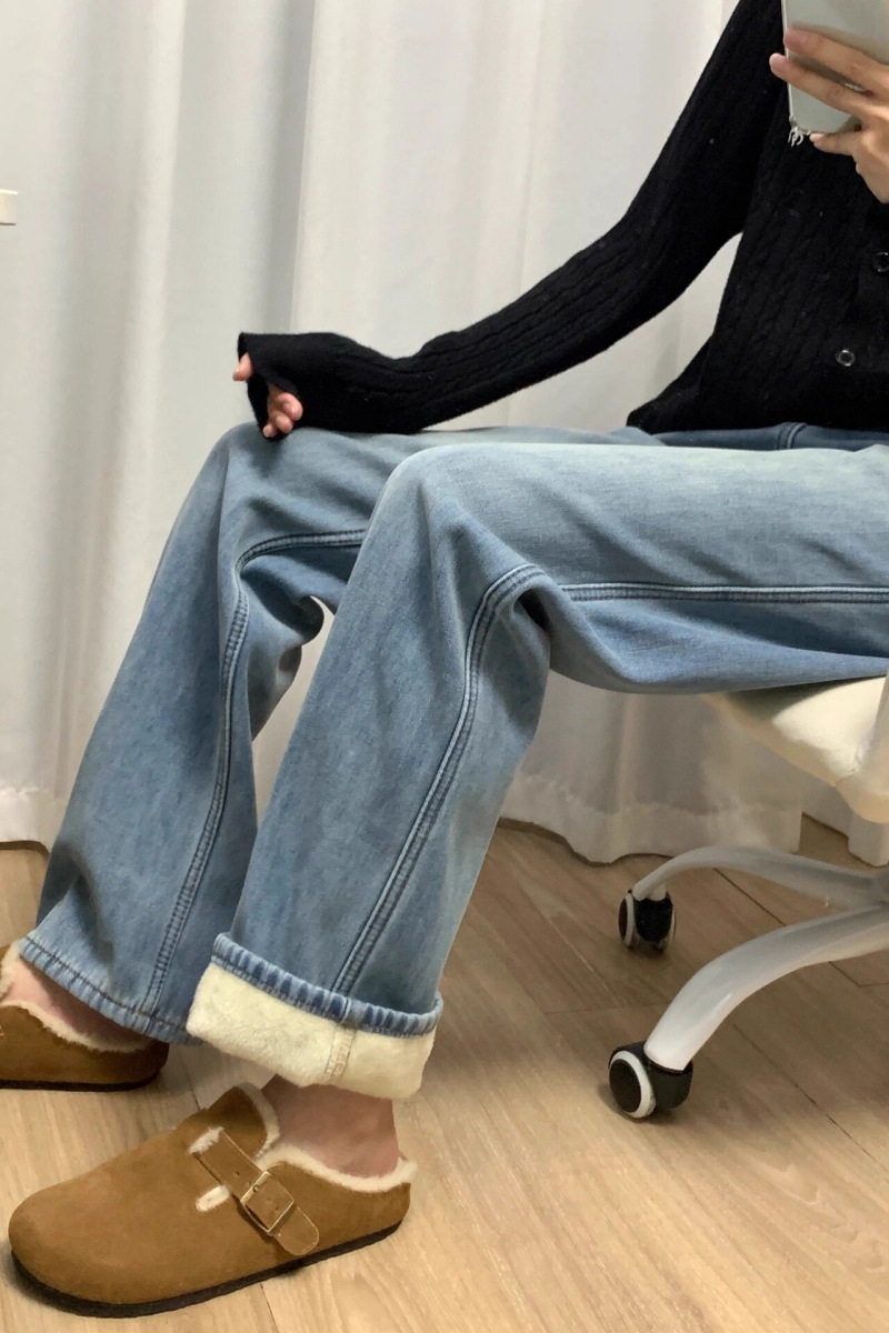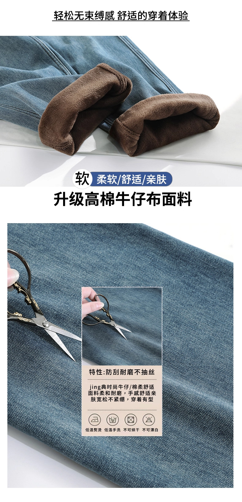 冬季新款加绒加厚直筒牛仔裤女大码胖mm高腰宽松显瘦窄版阔腿裤女