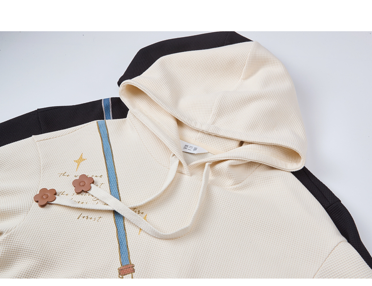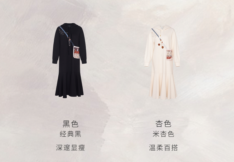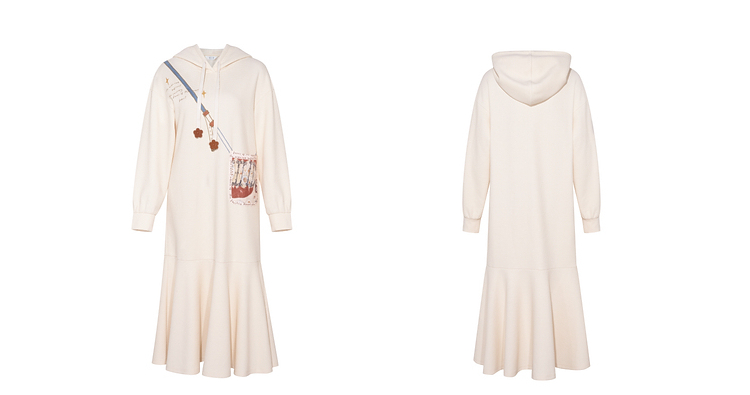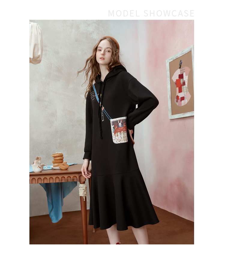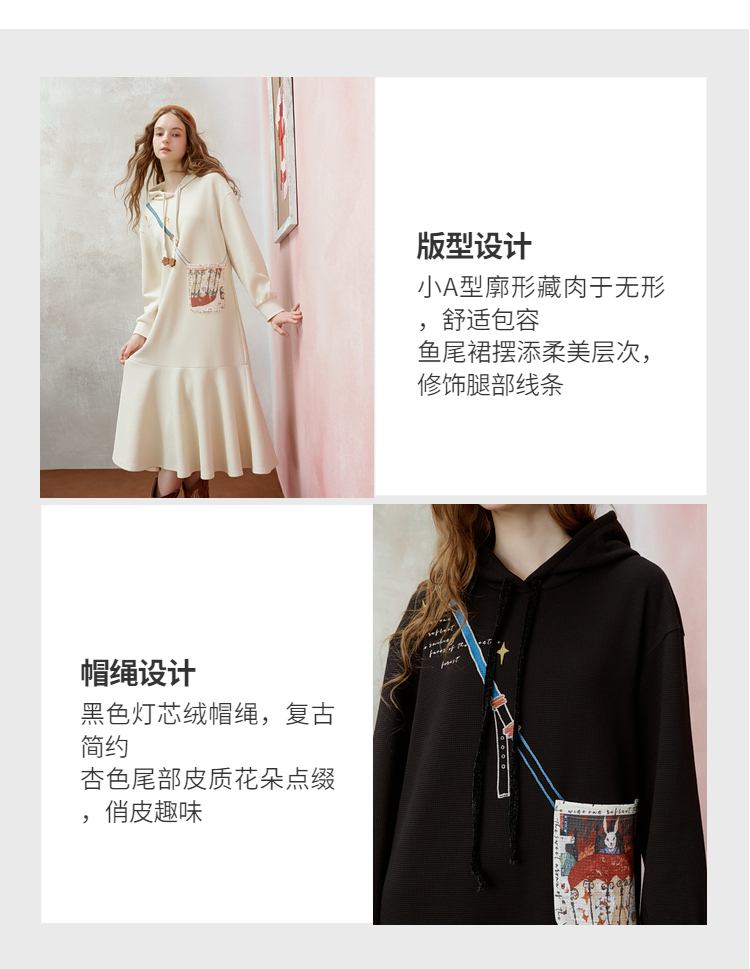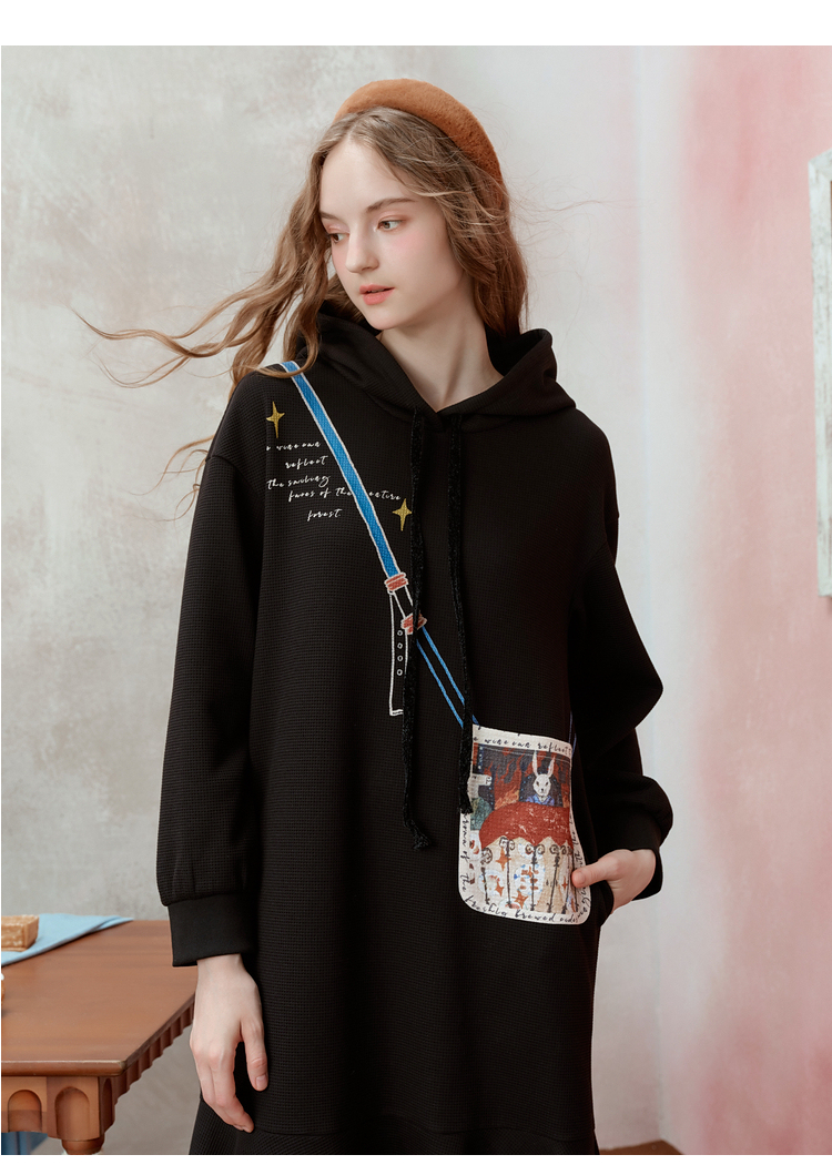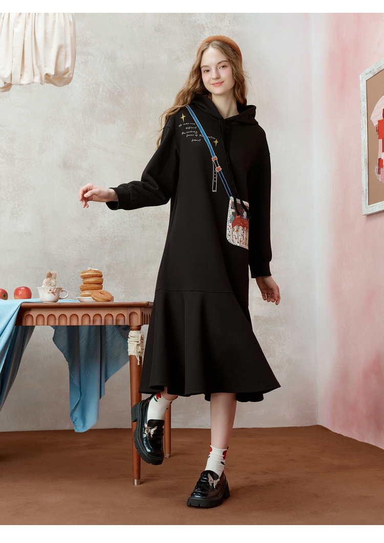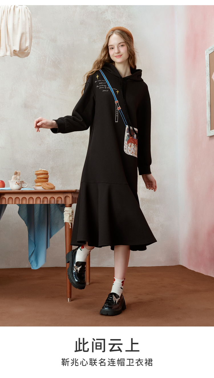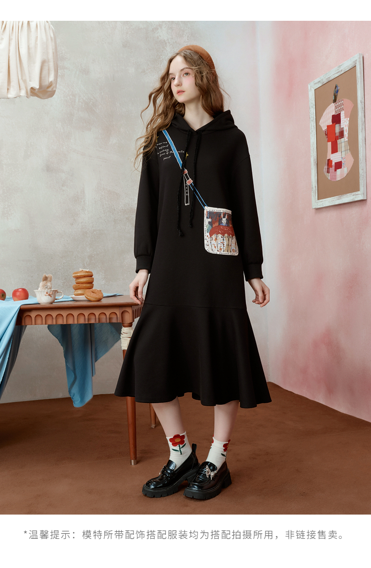 两三事此间云上2025冬新款印花口袋立体花朵帽绳连帽卫衣裙连衣裙