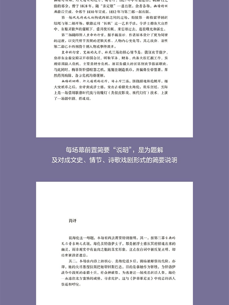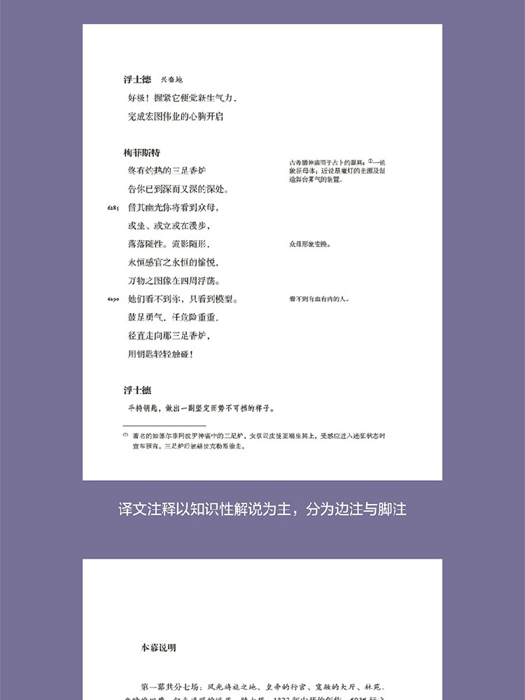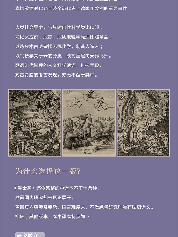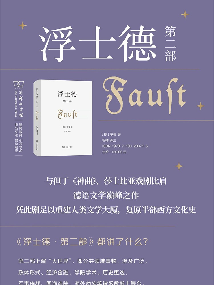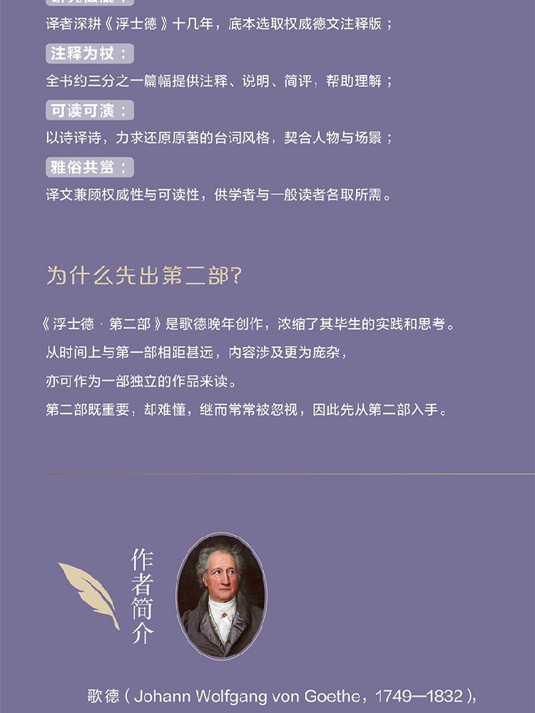 《浮士德》第二部主体作于1825至1831年间。第二部是歌德76至82岁间的创作,浓缩了其毕生实践和思考。第二部上演“大世界”,即公共领域事物,涉及广泛,政体形式、经济金融、学院学术、历史更迭、军事作战、围海造陆、海外劫掠等,被悉数搬上舞台,囊括歌德时代乃至整个近代史上,德国和欧洲的重要事件。且人类社会景象,又与其时自然科学类比映照,如以火成说、地震、地质地貌学原理比照革命;以炼金术古法杂糅无机化学,制造人造人;以气象学关于云的分类,映衬层层向天界飞升。歌德时代繁荣的人文科学话语、科技手段、对古希腊的考古发现,亦无不蕴于其中。译文注释以知识性解说为主,分为边注与脚注;每场幕前置简要“说明”,是为题解,及对成文史、情节、诗歌戏剧形式的简要说明;大多场幕后置“简评”摘要该场幕所涉问题,追加评述。
