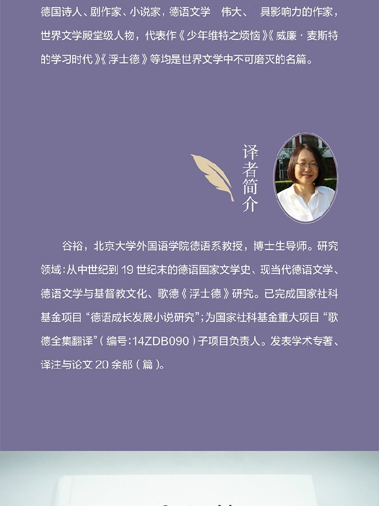 谷裕,1969年7月出生,北京大学外国语学院教授、博士研究生导师,曾获德国洪堡奖学金。从事从中世纪到19世纪末的德语国家文学史、现当代德语文学、德语文学与基督教文化、歌德《浮士德》等领域的研究。已完成国家社科基金项目“德语成长发展小说研究”;现为国家社科基金重大项目“歌德全集翻译”子项目负责人。发表学术专著、译注与论文20余部(篇)。