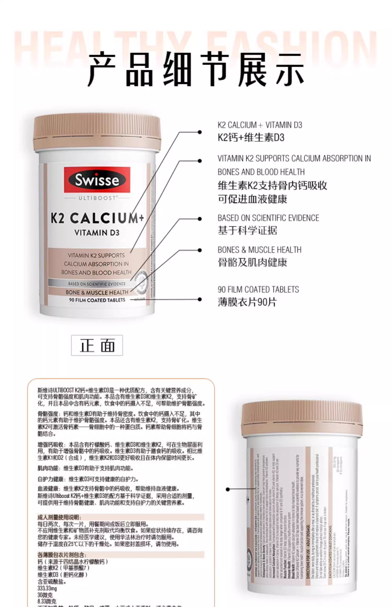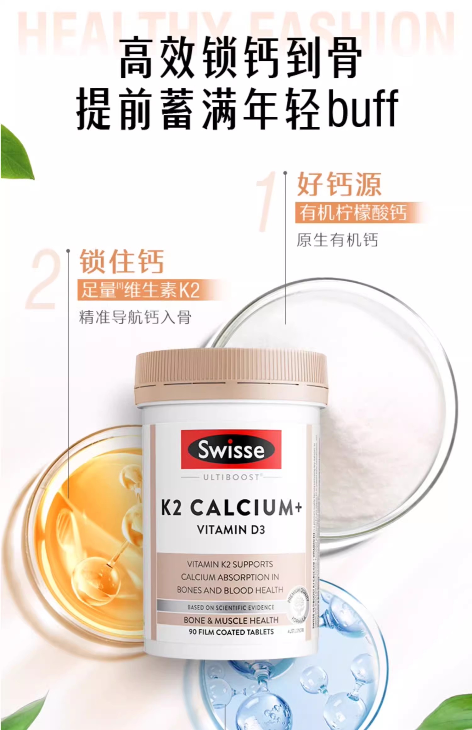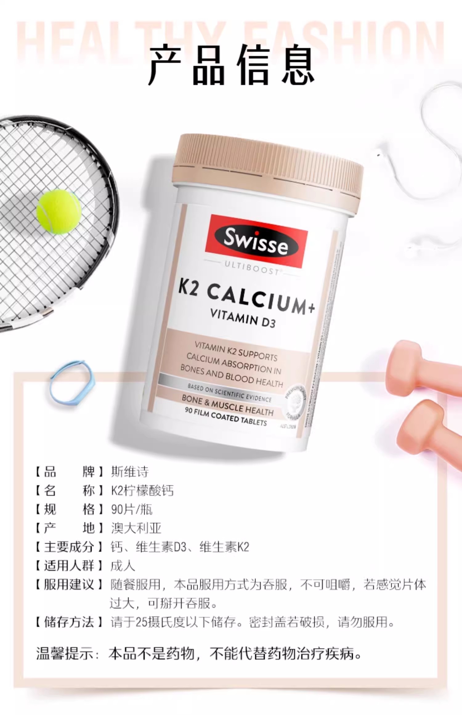 斯维诗Swisse K2柠檬酸钙护骨骼钙片 90片 郑钦文代言
