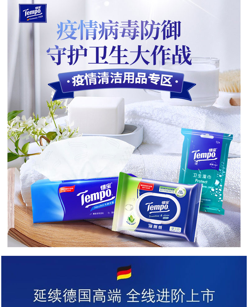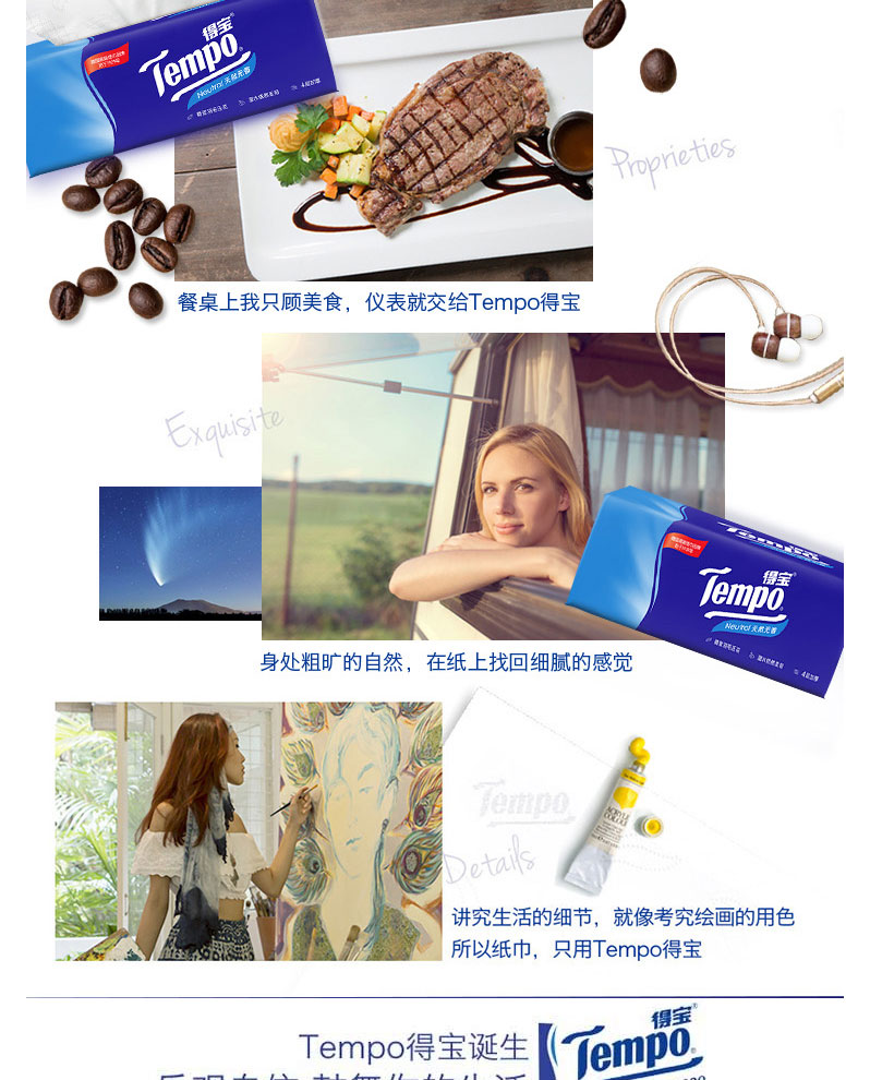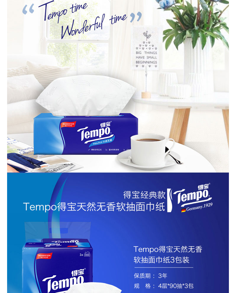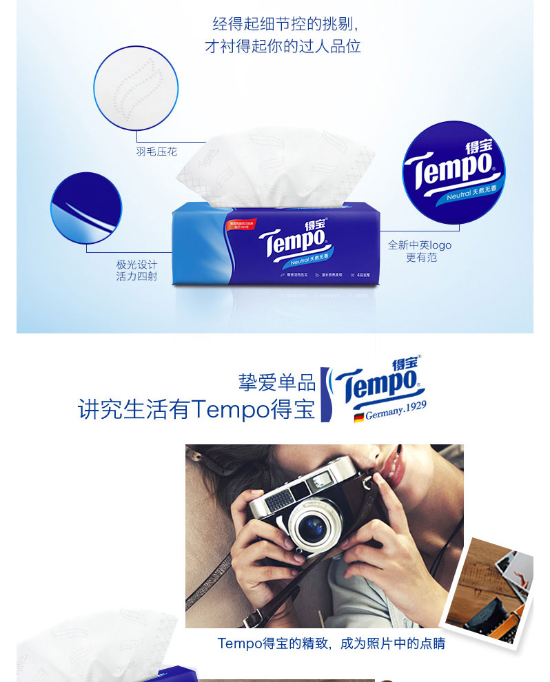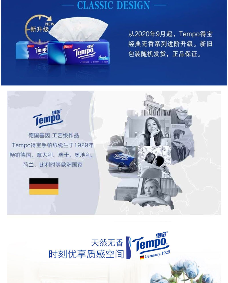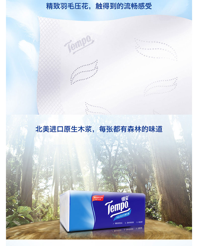 得宝 Tempo软 抽纸 4层加厚无香纸巾 原生浆餐巾纸90抽*4包