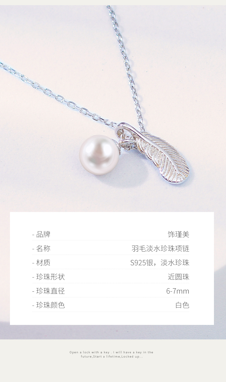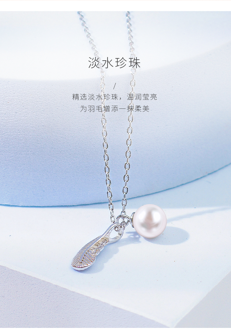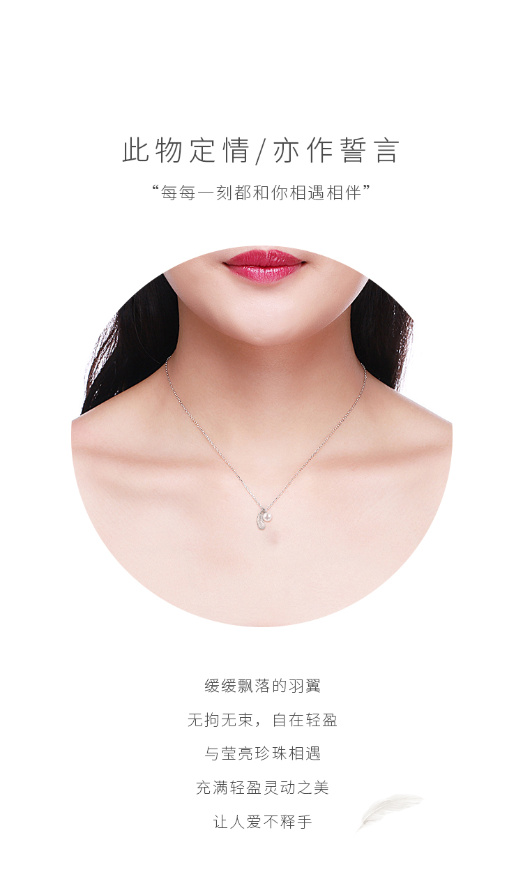 1、羽毛项链,羽毛是吉祥、文明、富贵的象征,配上珍珠吊坠,相互衬托和陪伴,寓意长相厮守不离不弃。此项链亦可单独佩戴羽毛和珍珠吊坠,可谓一款三戴,是设计师的自留款式。